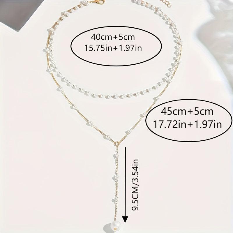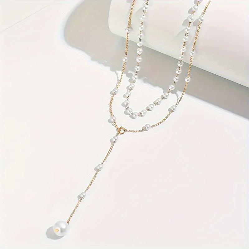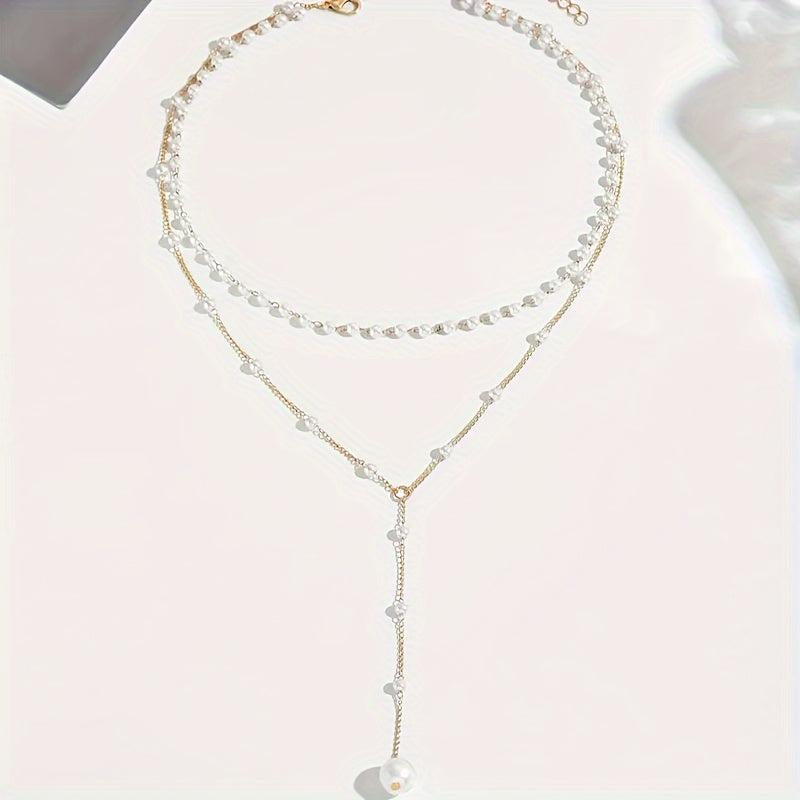 Layered Y Shape Necklace with Faux Pearl Accents Tassel Pendant Iron Chain