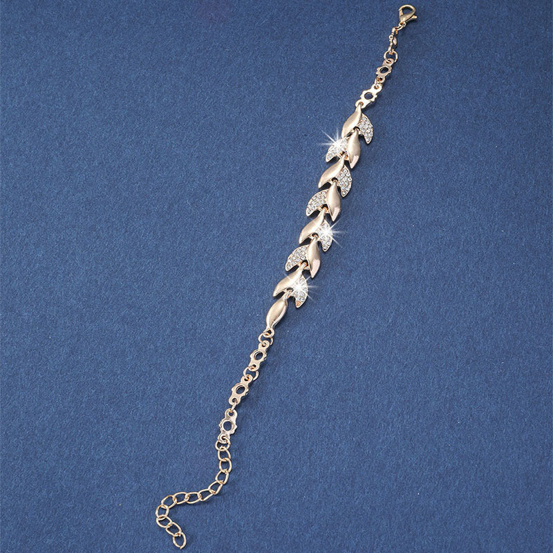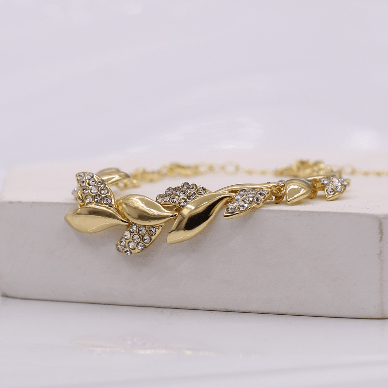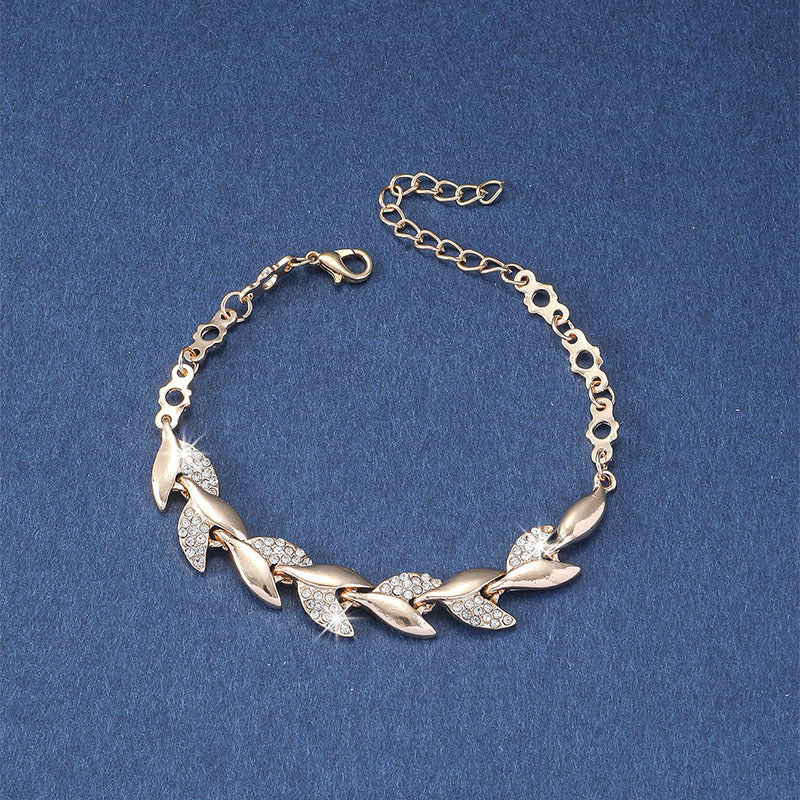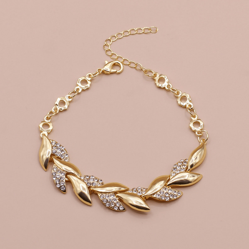 This elegant bangle bracelet features a leaf shape design with sparkling rhinestone inlay, adding a touch of glamour to your hand jewelry collection. The bracelet is adjustable to fit different wrist sizes.