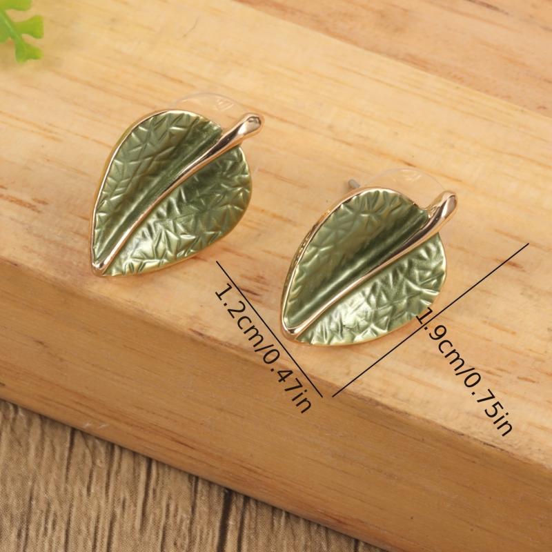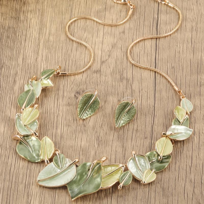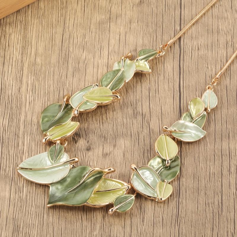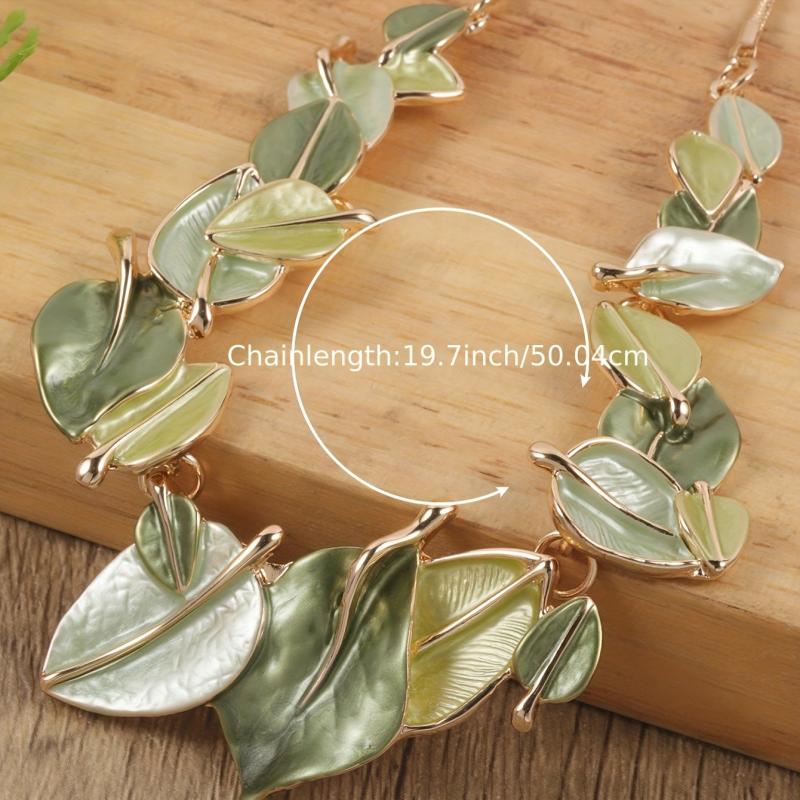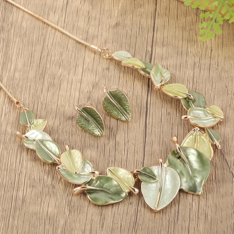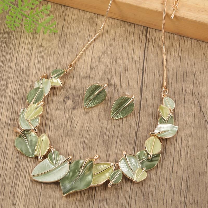 Enhance your look with this elegant set of leaf-shaped earrings and necklace in olive green. Perfect for lawn parties, weddings, banquets, or as a versatile accessory. Made of zinc alloy with artificial KC enamel.