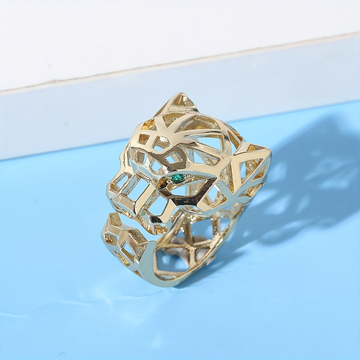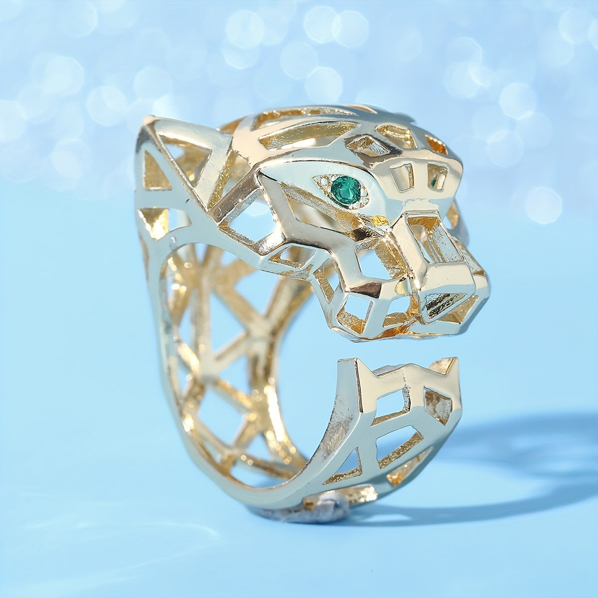 This stunning band ring features a hollow leopard design with inlaid synthetic gems. Made from copper, this finger ring is a great addition to your jewelry collection.