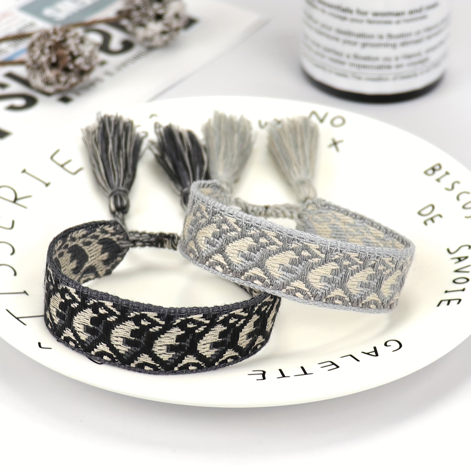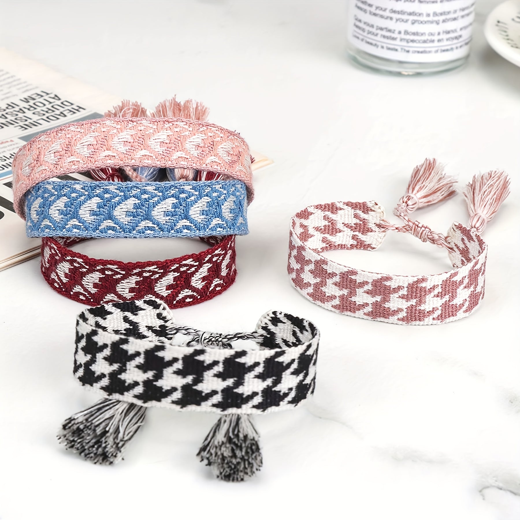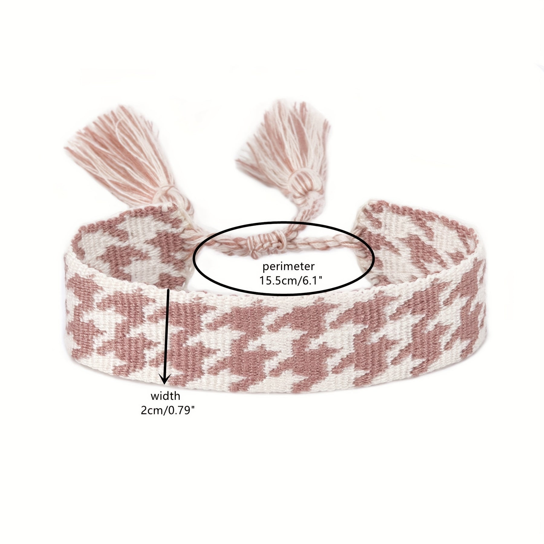Add a touch of bohemian style to your look with this leopard houndstooth braided bangle bracelet featuring tassels. Perfect for any occasion.