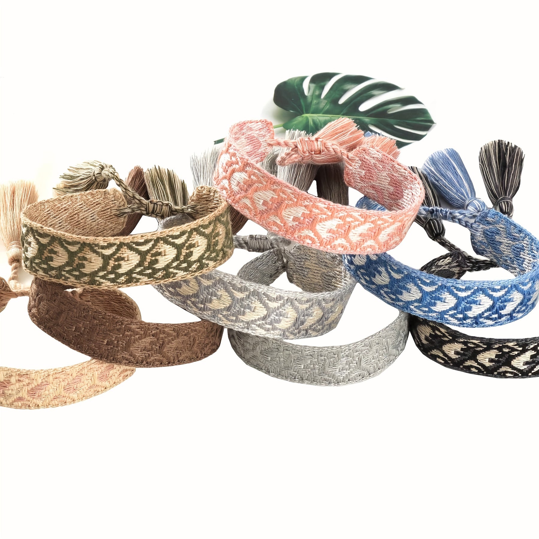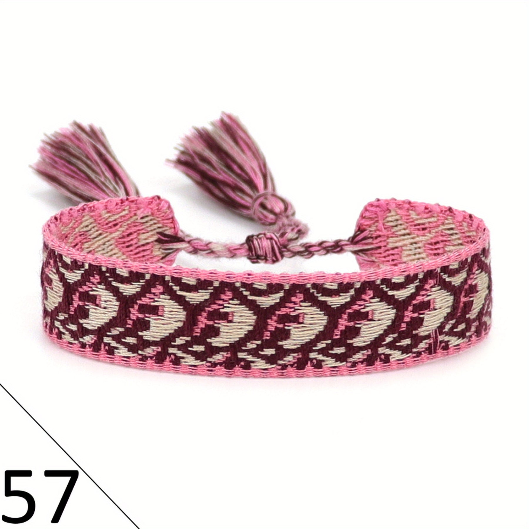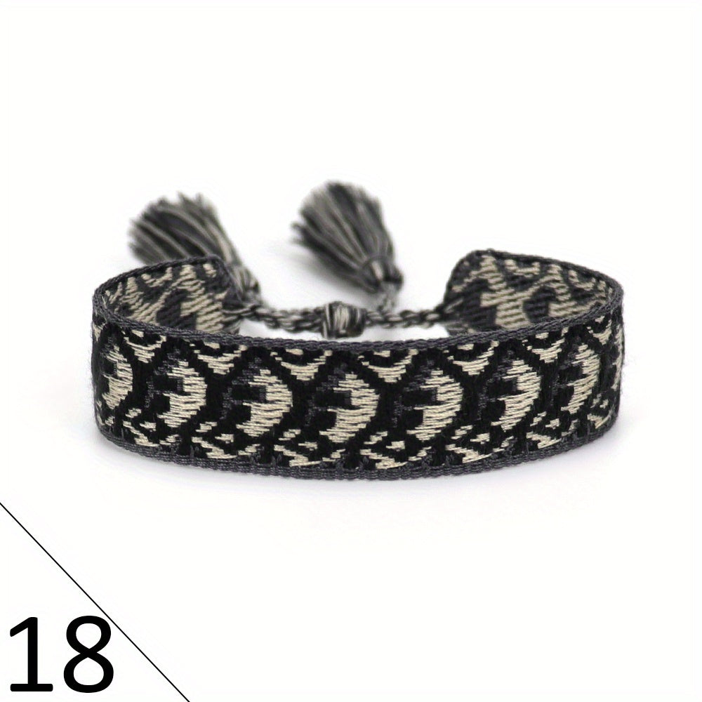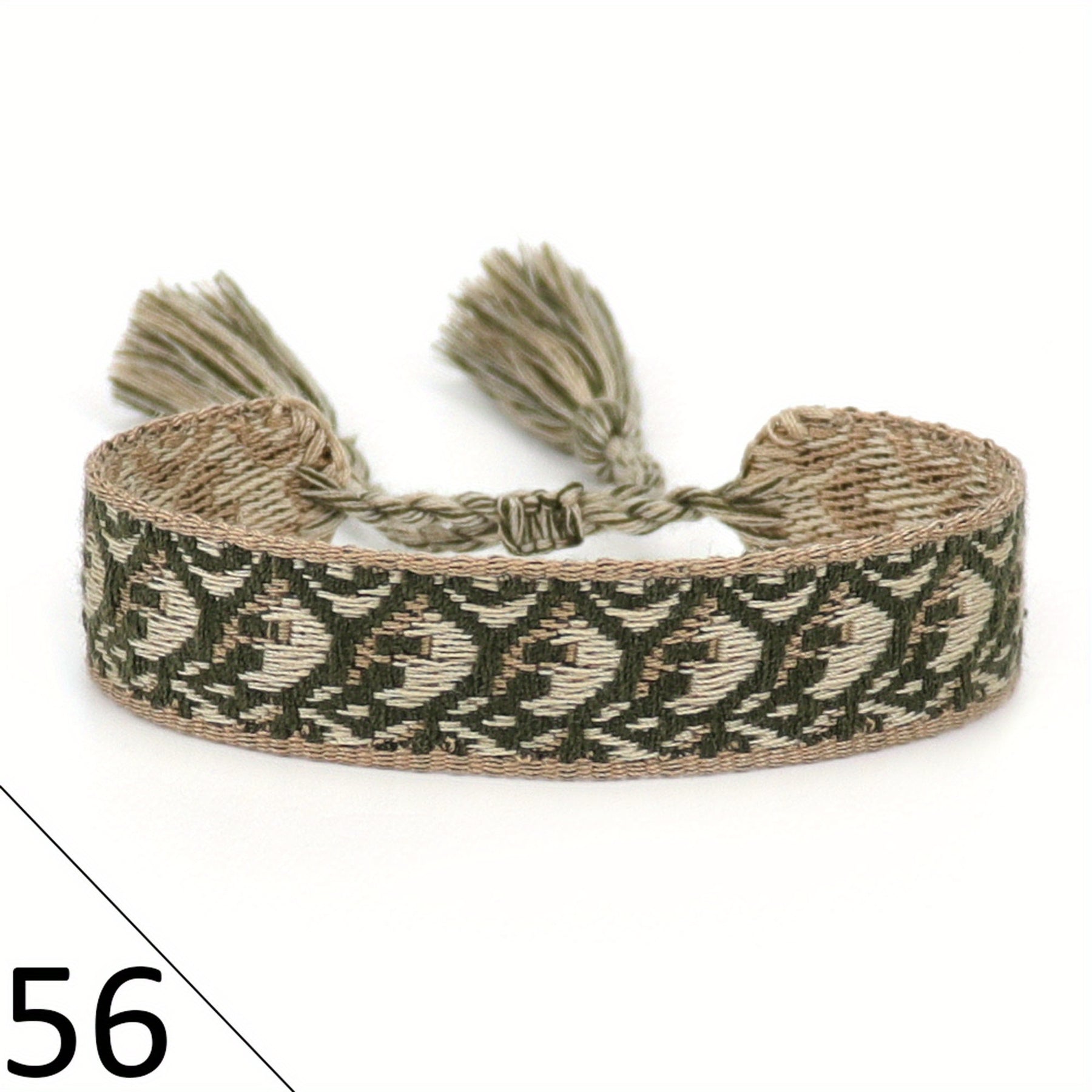 Add a touch of bohemian style to your look with this leopard houndstooth braided bangle bracelet featuring tassels. Perfect for any occasion.