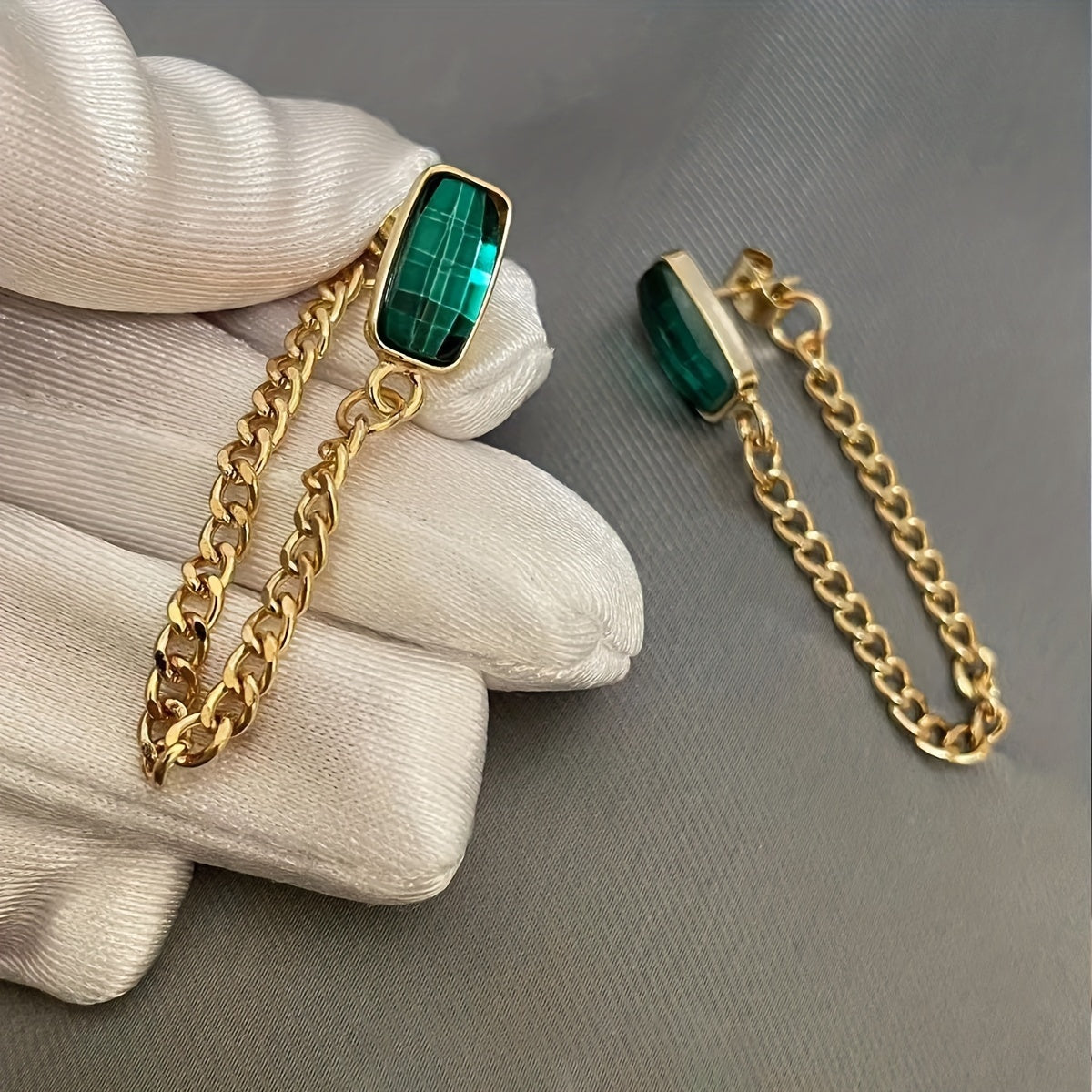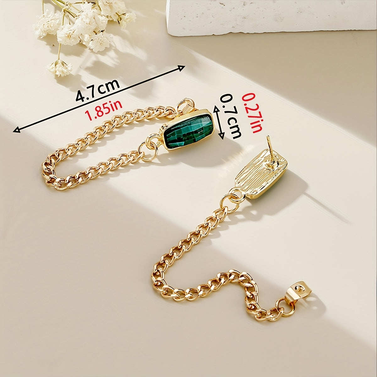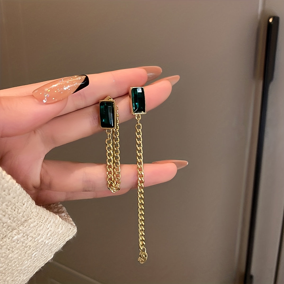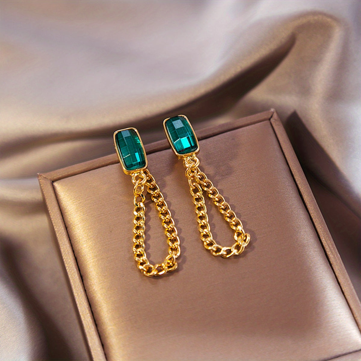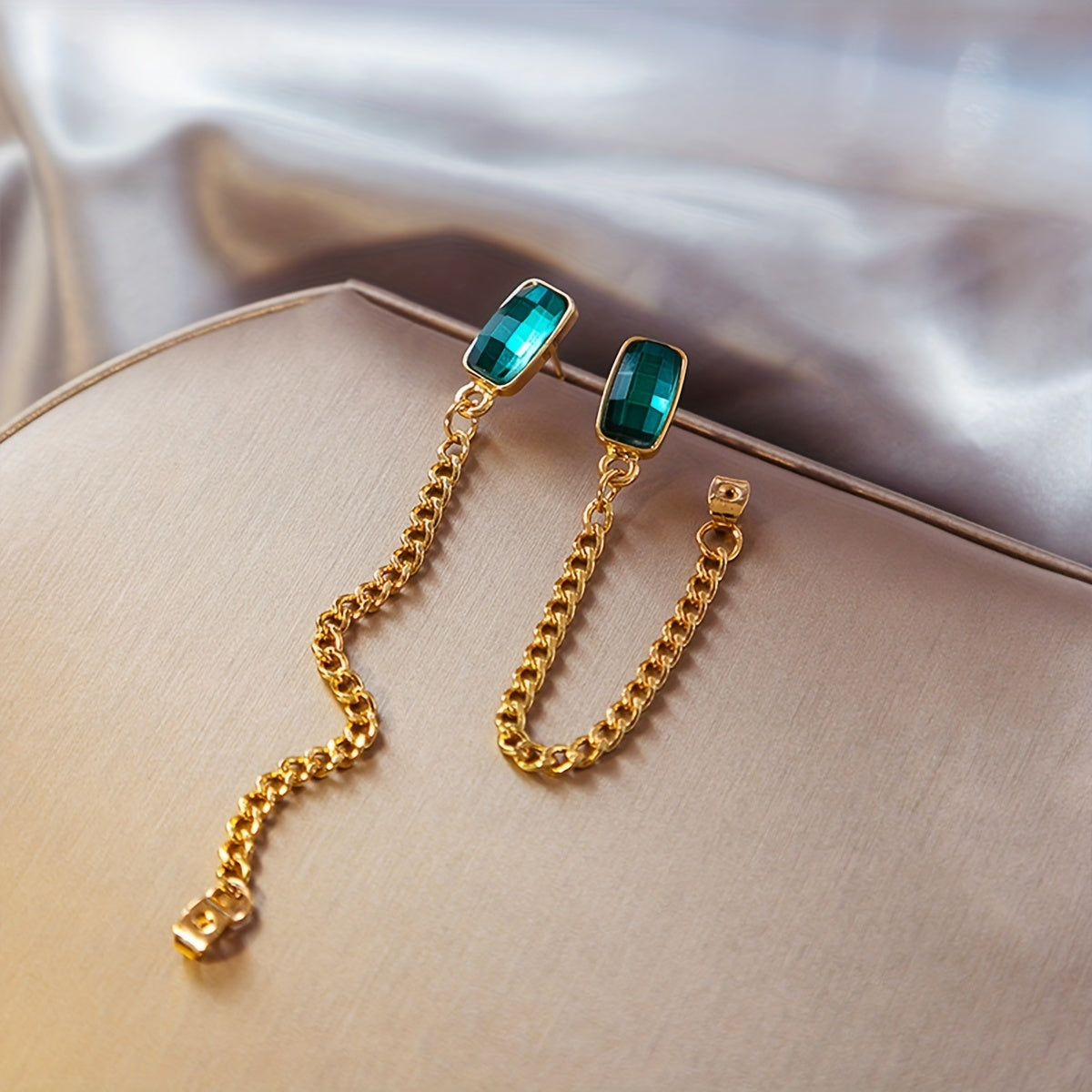 Elegant long chain earrings featuring inlaid square synthetic gems with 18K gold plating.