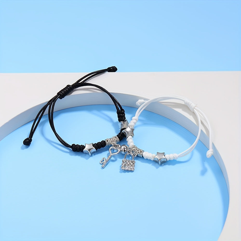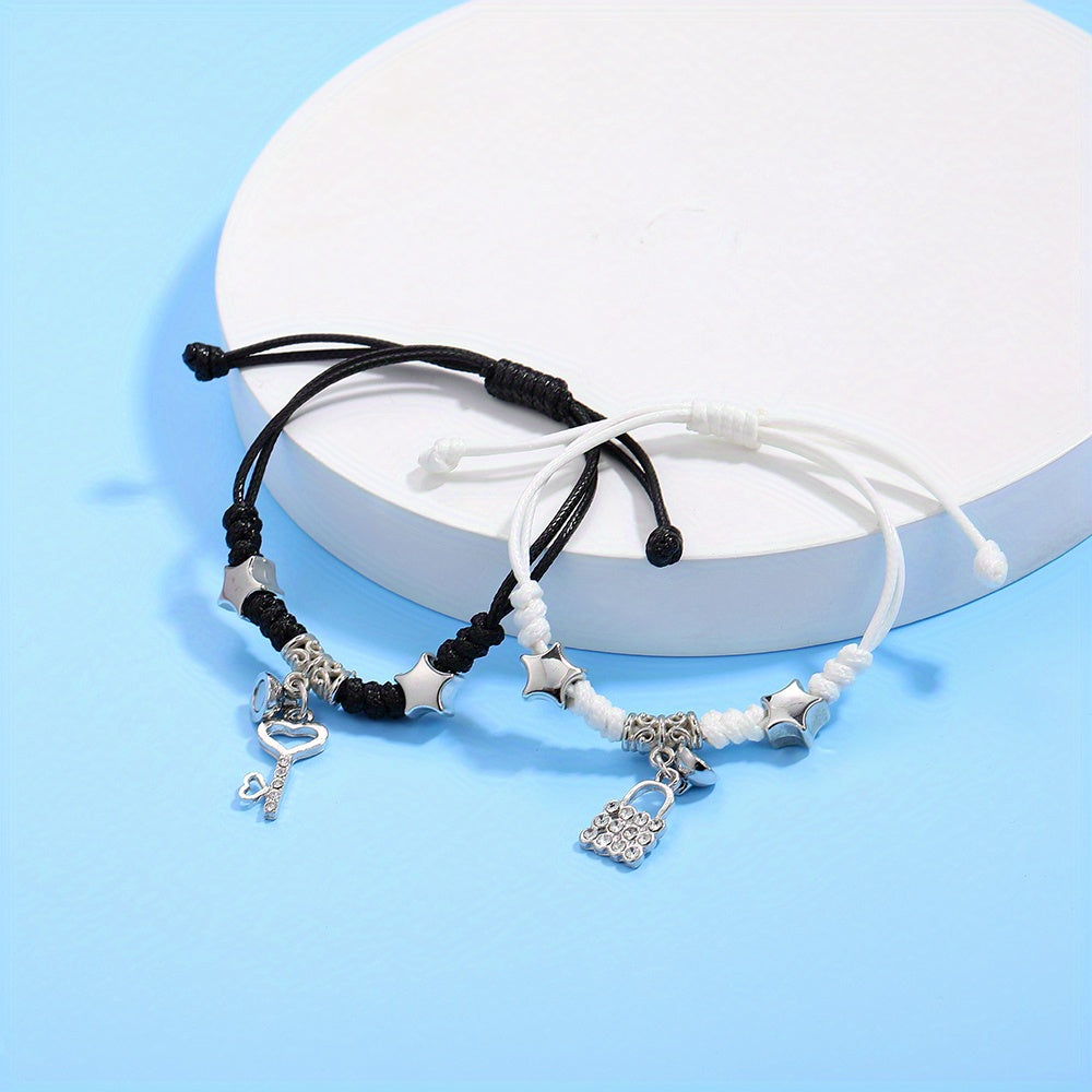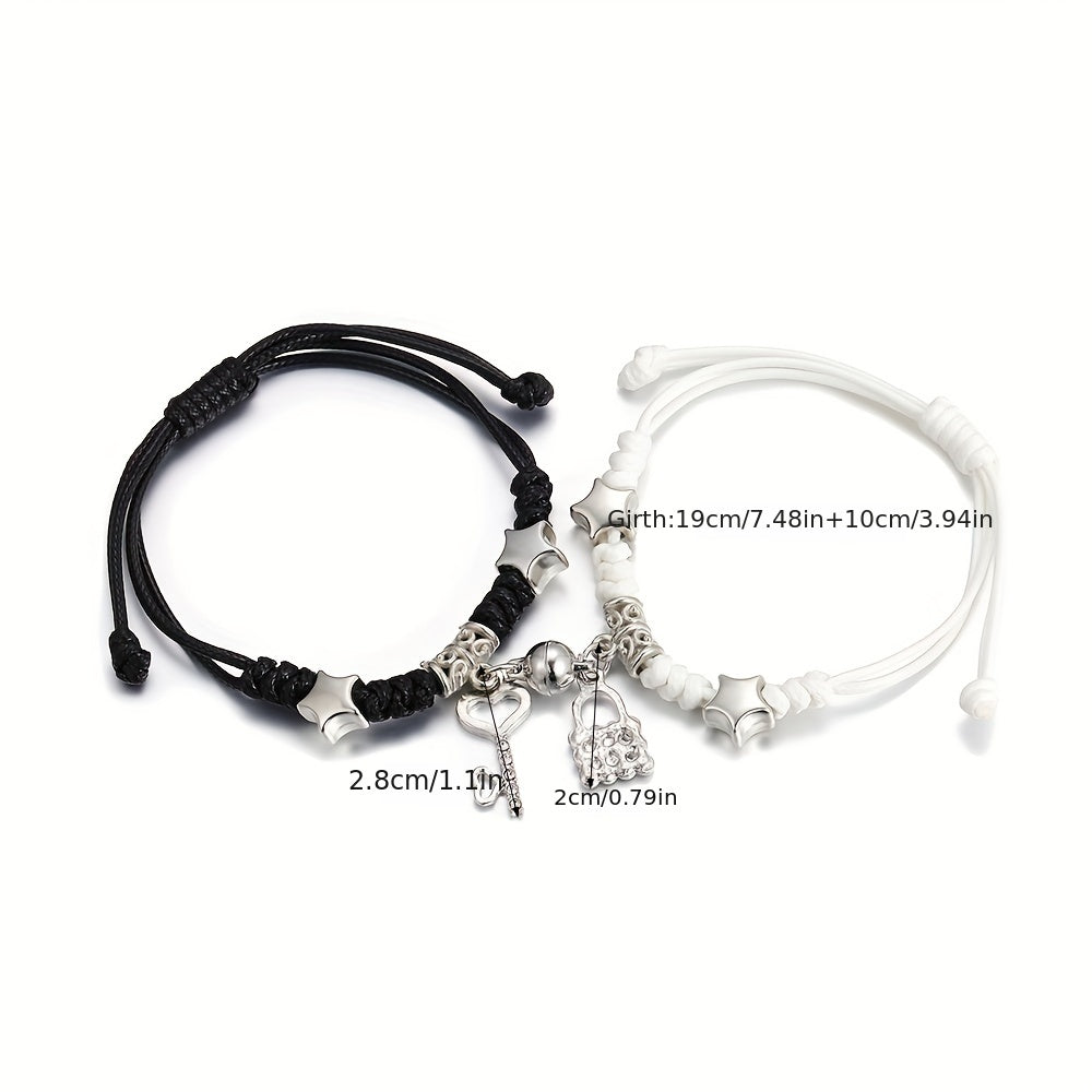 This stylish bracelet set features a magnetic lock and key shape pendant on a braided band. It is perfect for graduations and as a friendship gift.