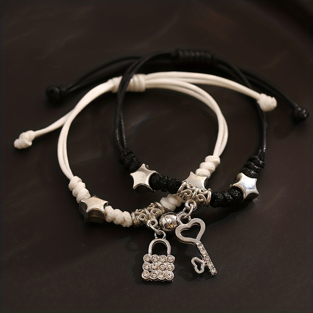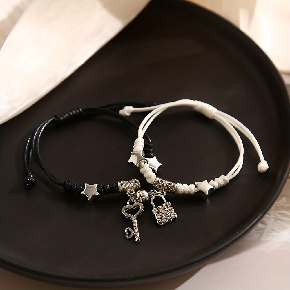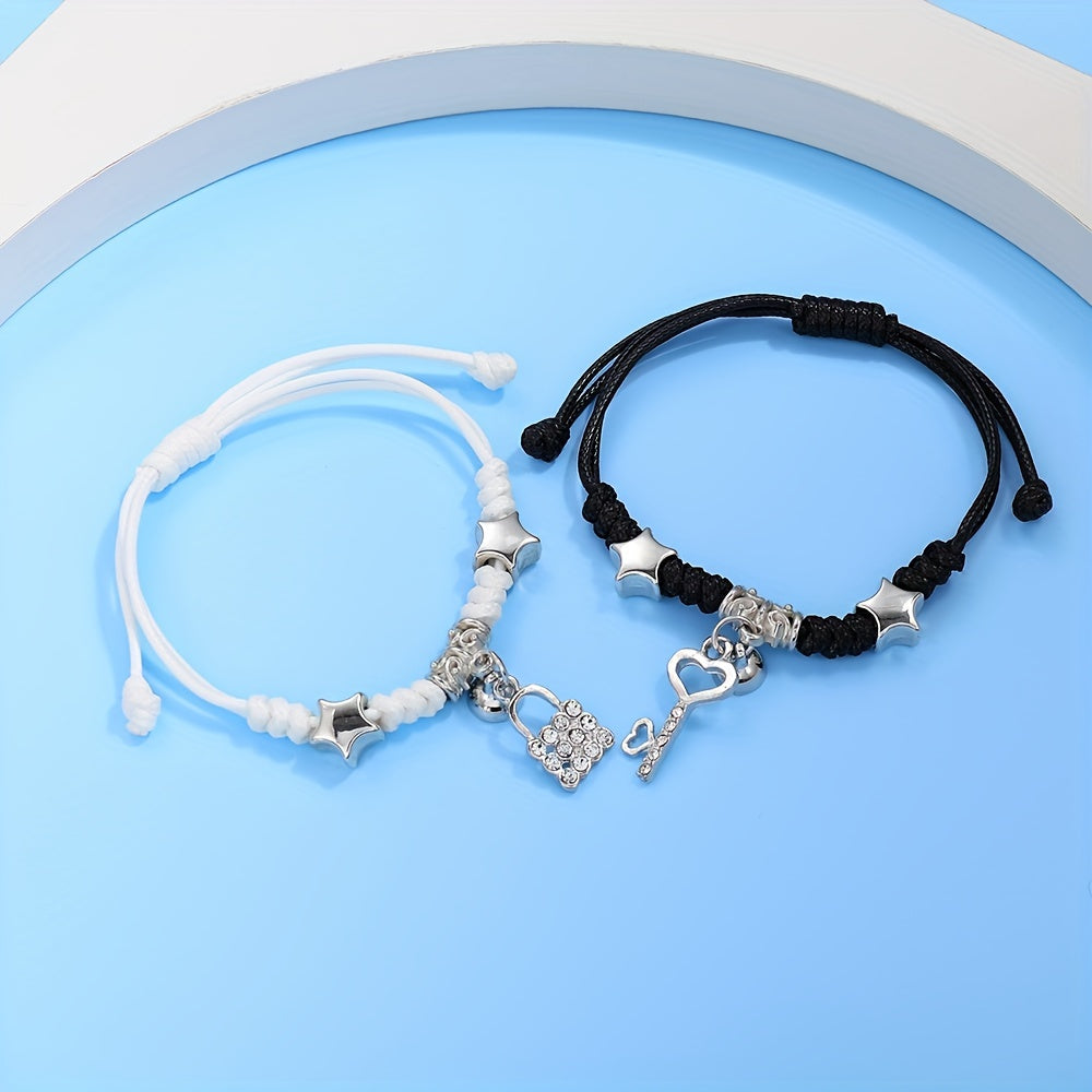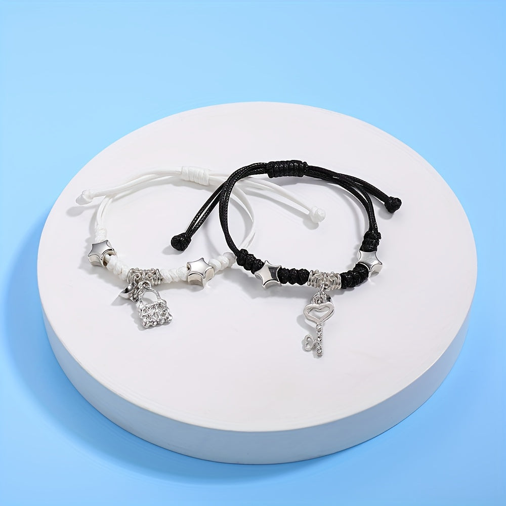This stylish bracelet set features a magnetic lock and key shape pendant on a braided band. It is perfect for graduations and as a friendship gift.