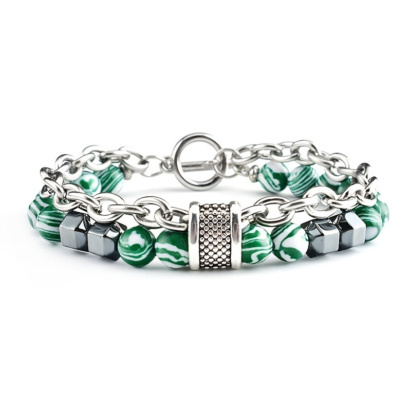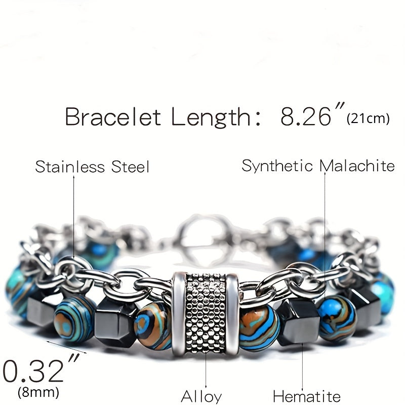 Add a touch of natural beauty with this malachite beaded bracelet featuring stainless steel chain. Ideal for both men and women, this punk hip hop accessory is perfect for yoga, Buddha, and chakra enthusiasts.
