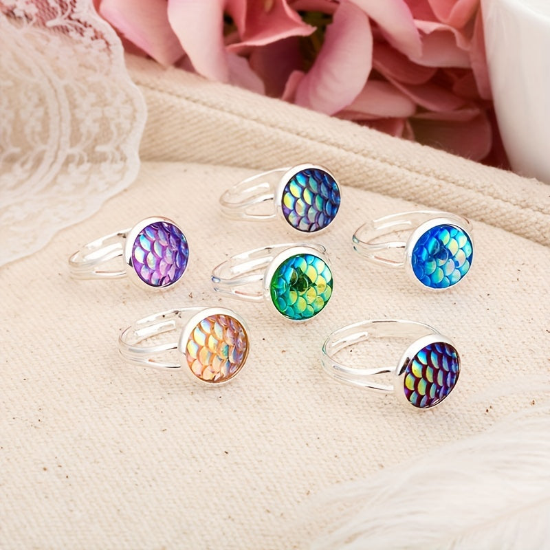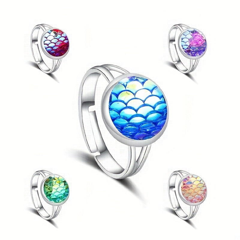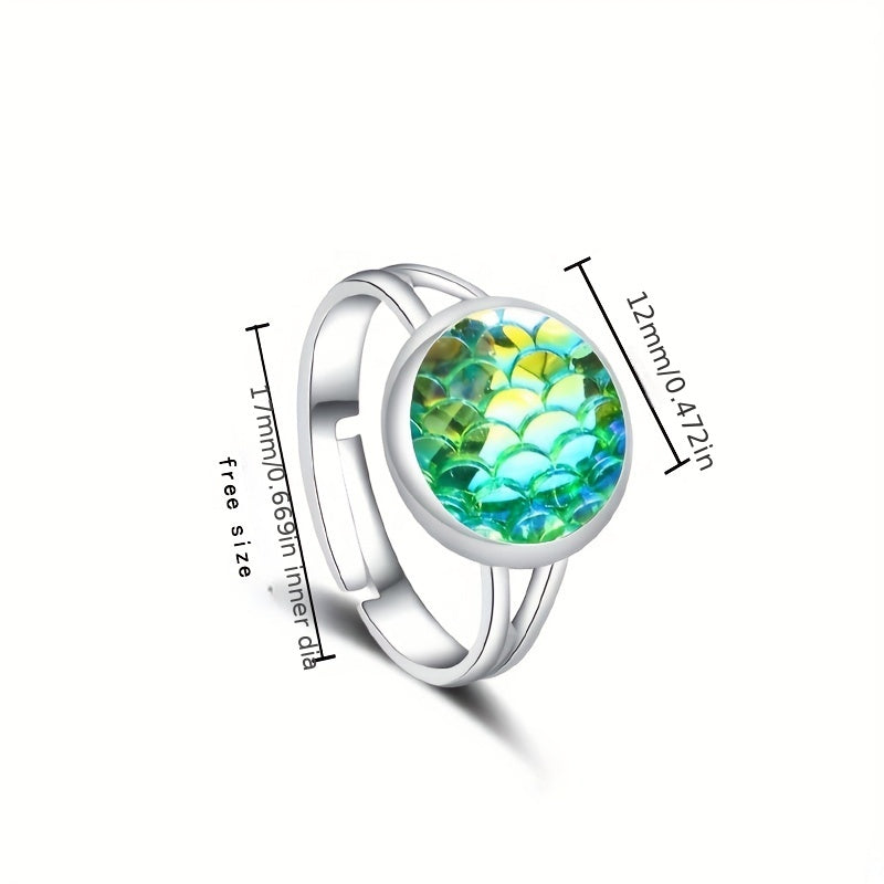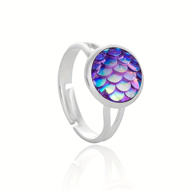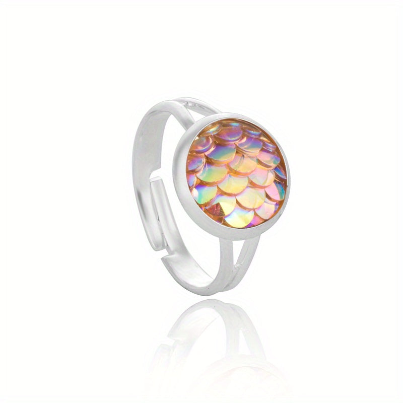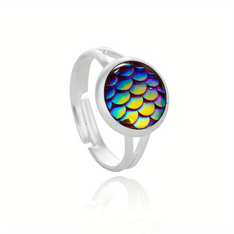 Elegant mermaid scale pattern ring with hollow out design and multicolor finish. Adjustable size for a comfortable fit.