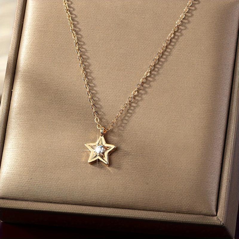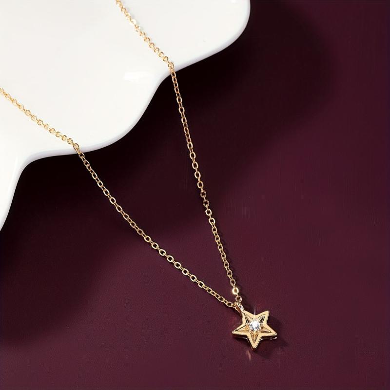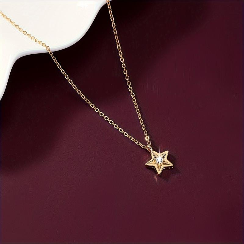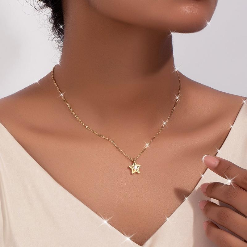 This women's necklace features a minimalist star pendant on a delicate golden tone chain. It's a versatile accessory suitable for everyday wear and vacation outfits.