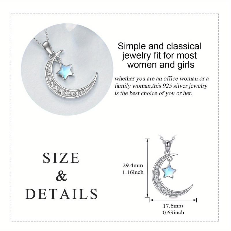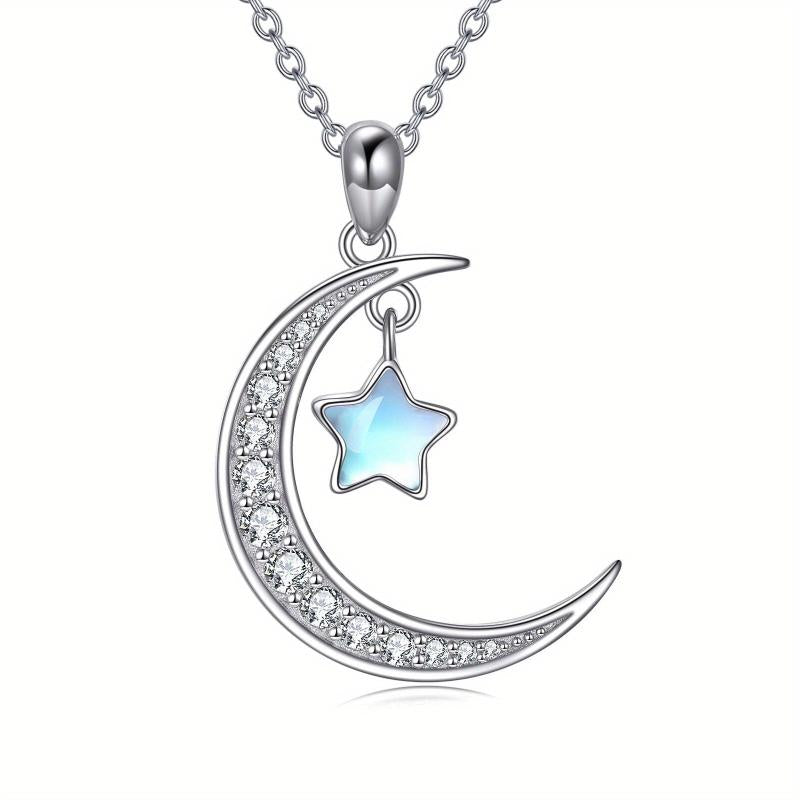 Elegant sterling silver necklace featuring a crescent moon and star design. Perfect for women and teens.