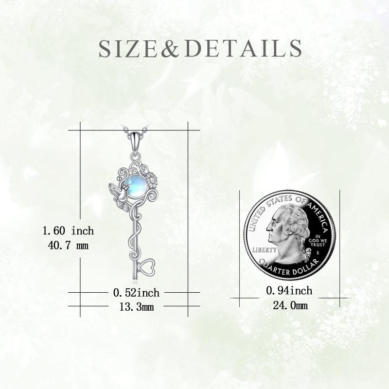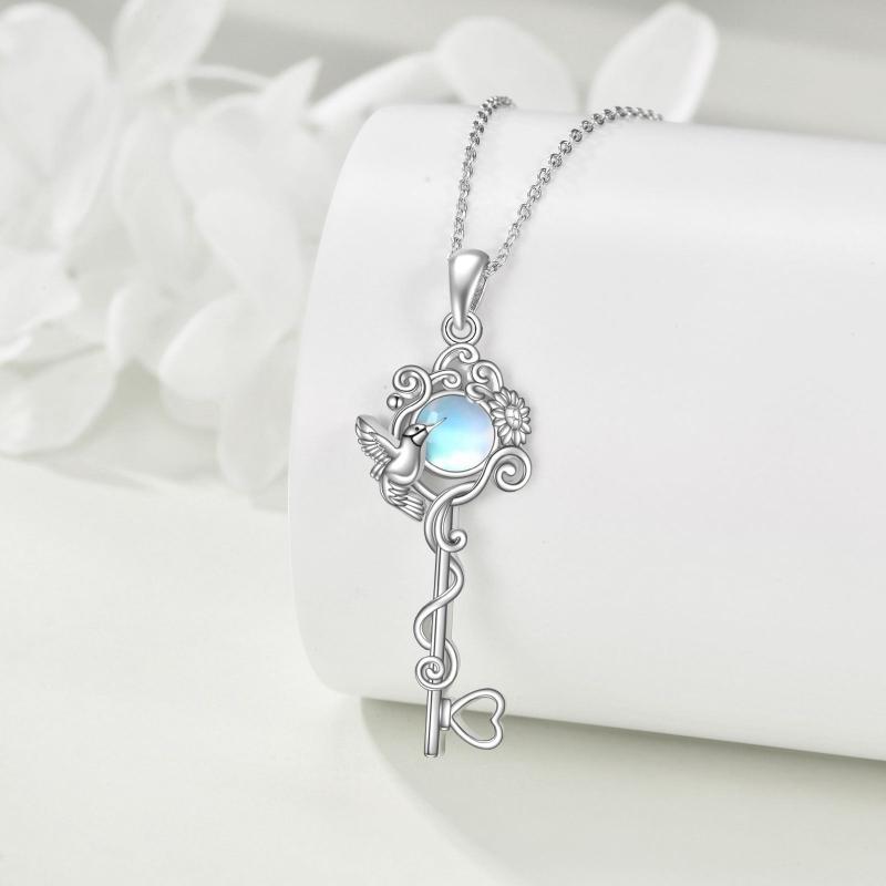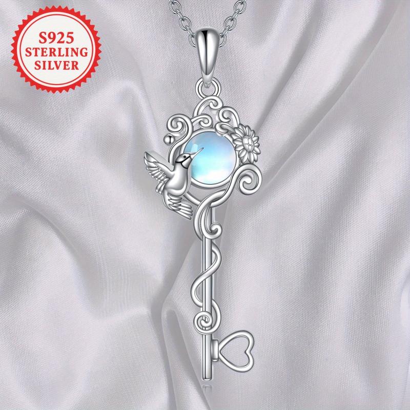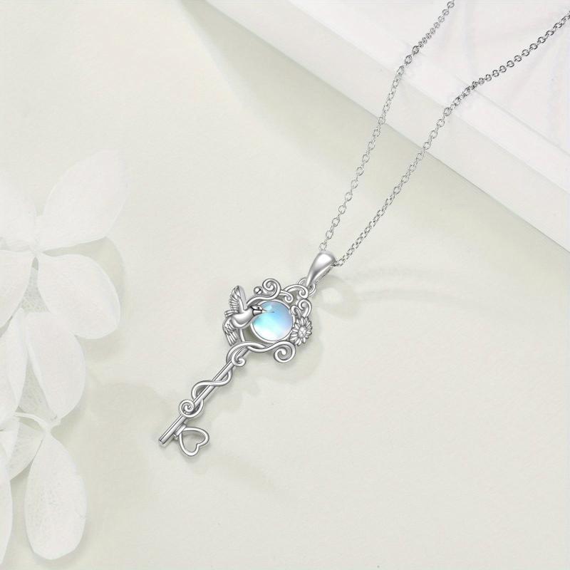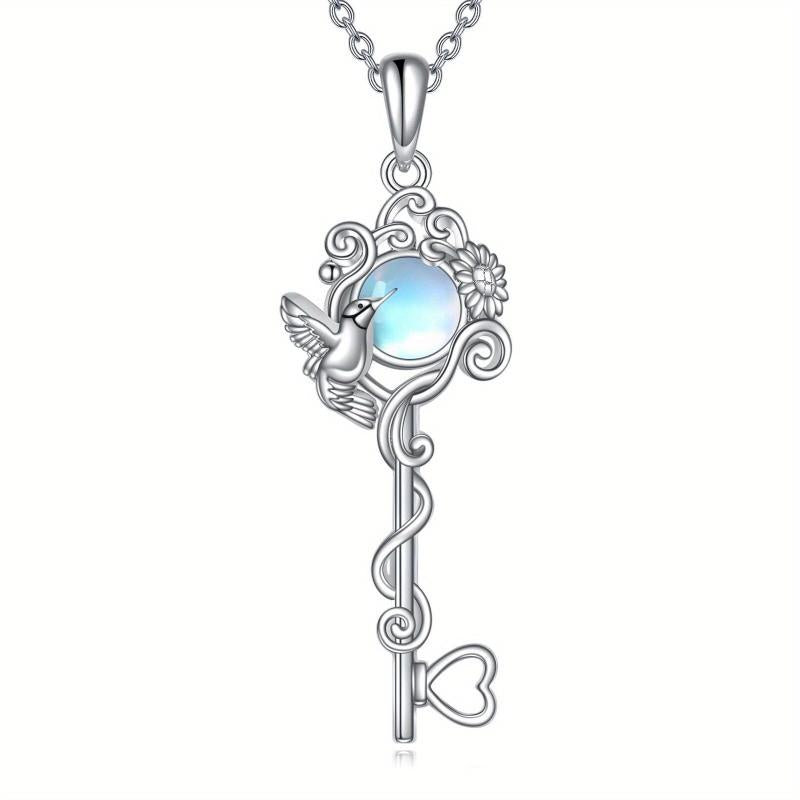 This exquisite necklace features a beautiful hummingbird key pendant crafted in sterling silver with a moonstone accent. A unique and elegant piece of jewelry for women.