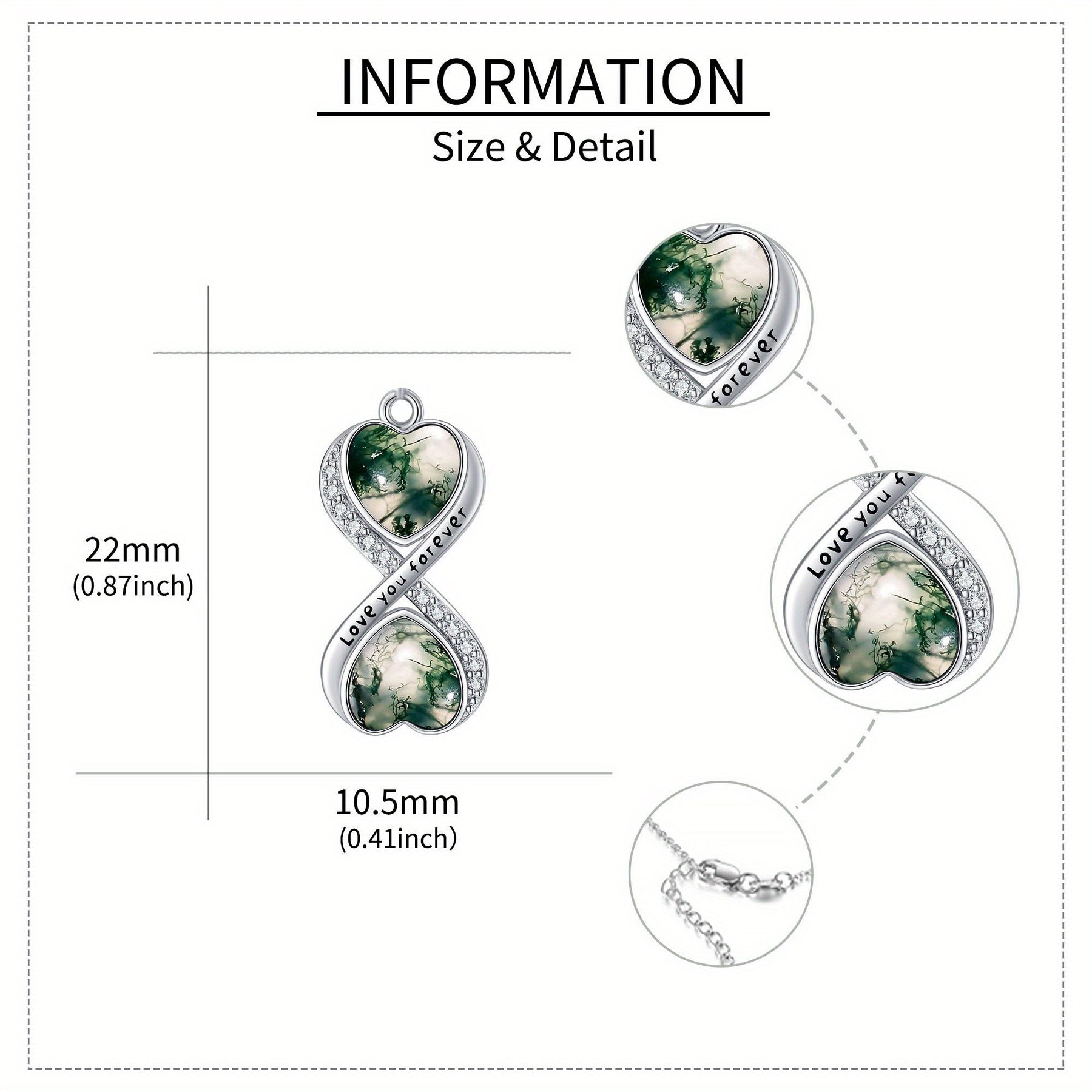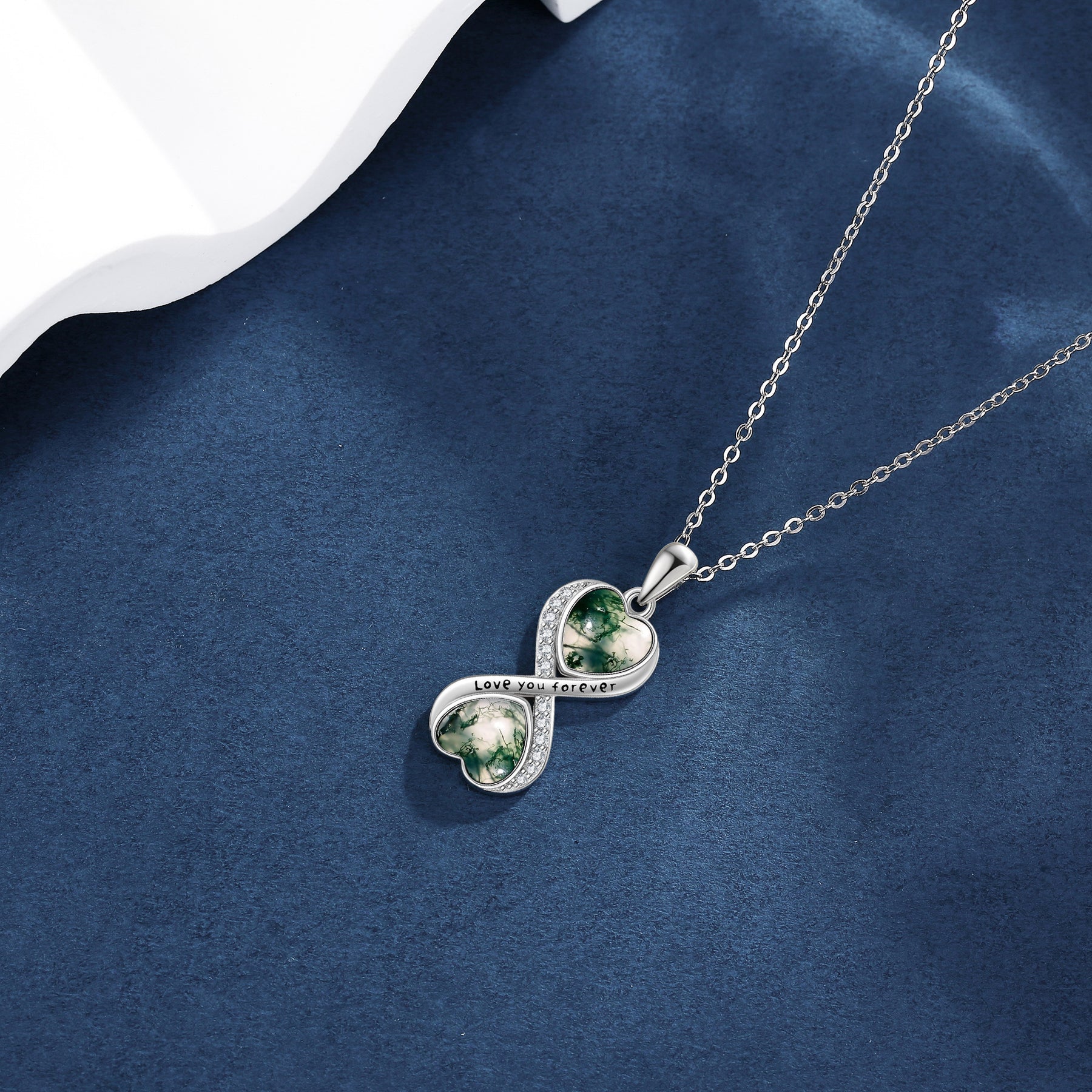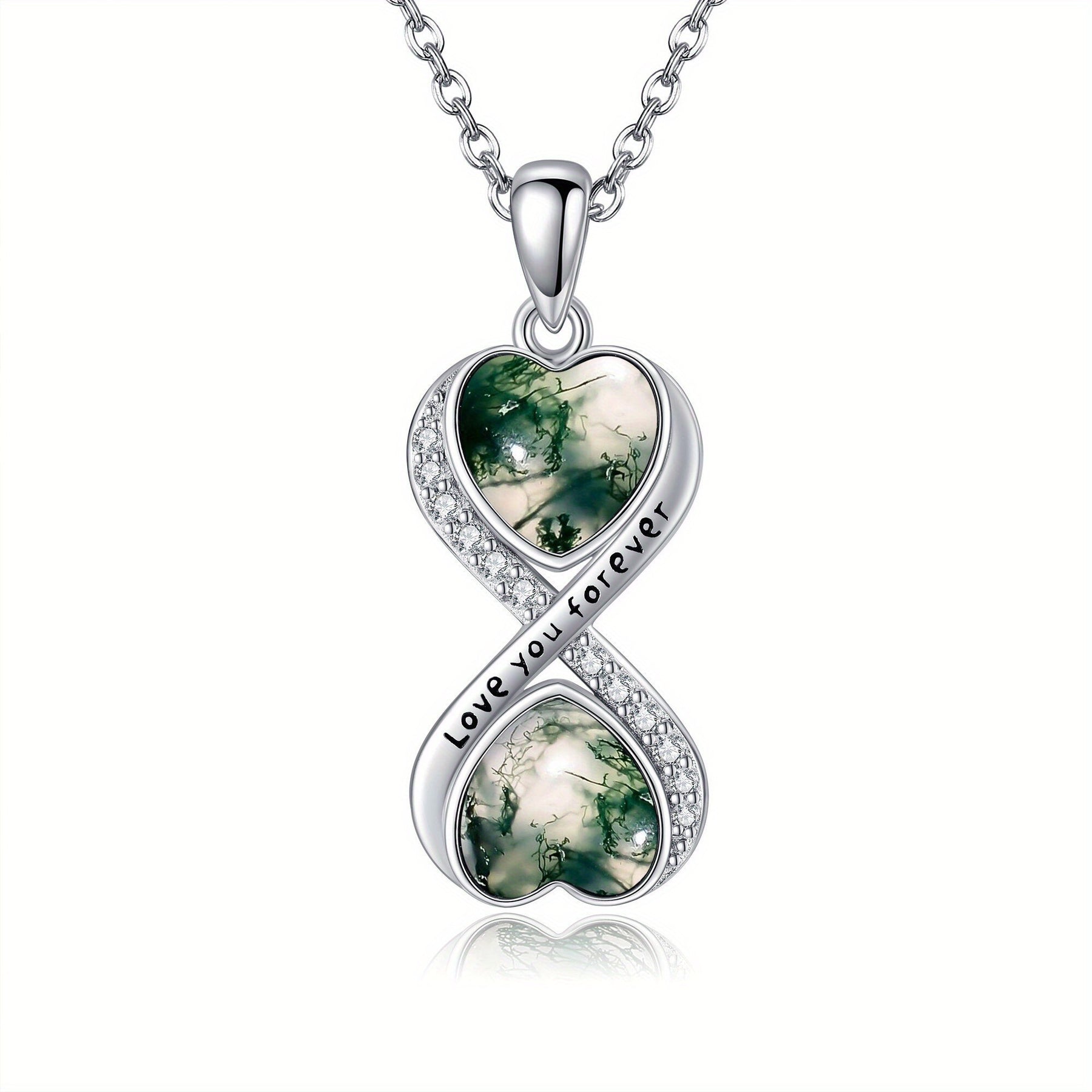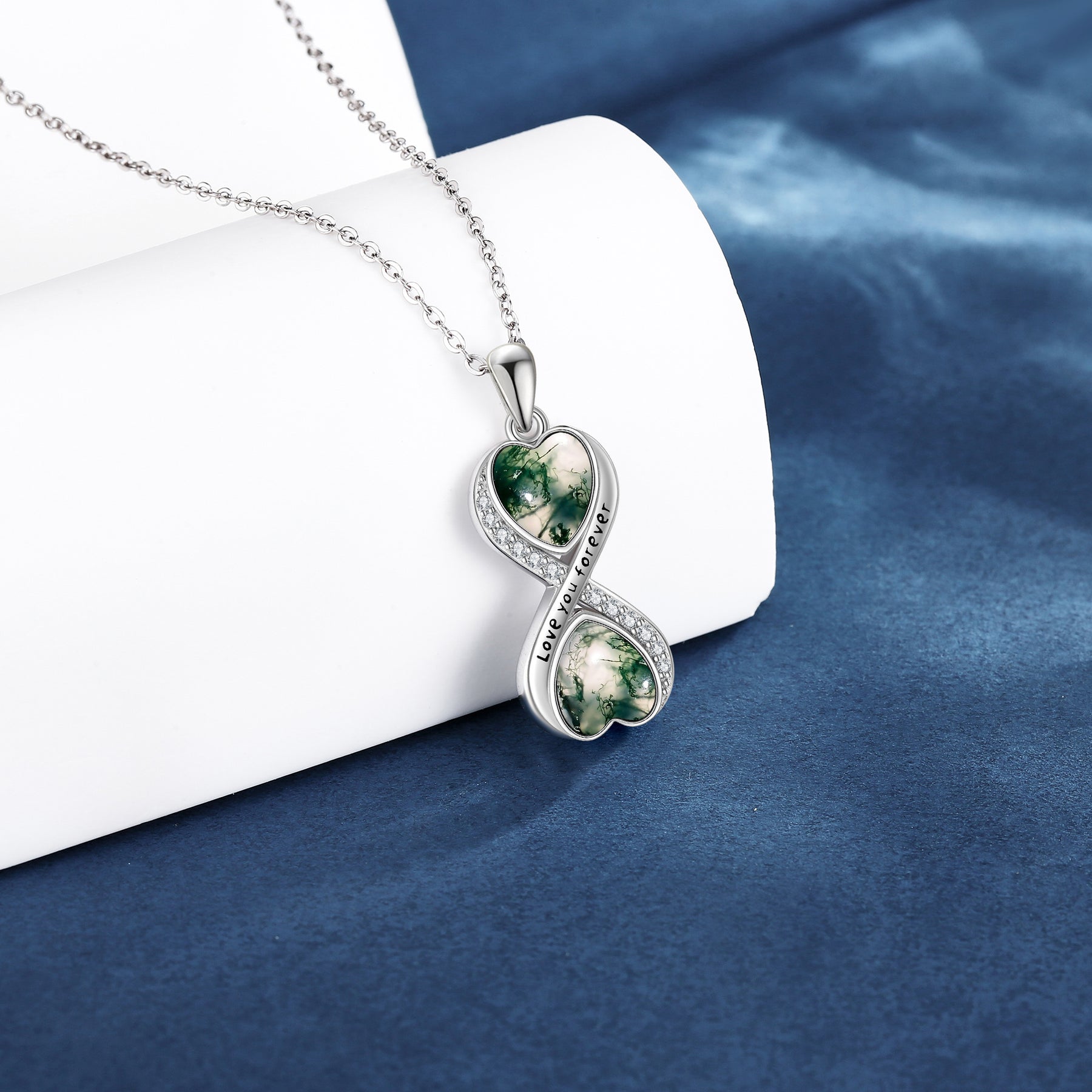 This stunning Moss Agate Infinity Necklace is crafted from 925 Sterling Silver. It is a beautiful piece of infinity jewellery for women that showcases the unique beauty of Moss Agate gemstone.