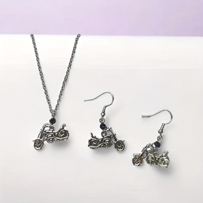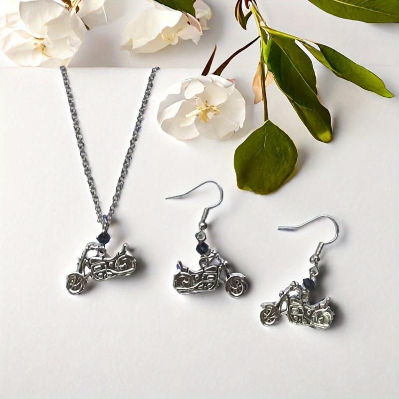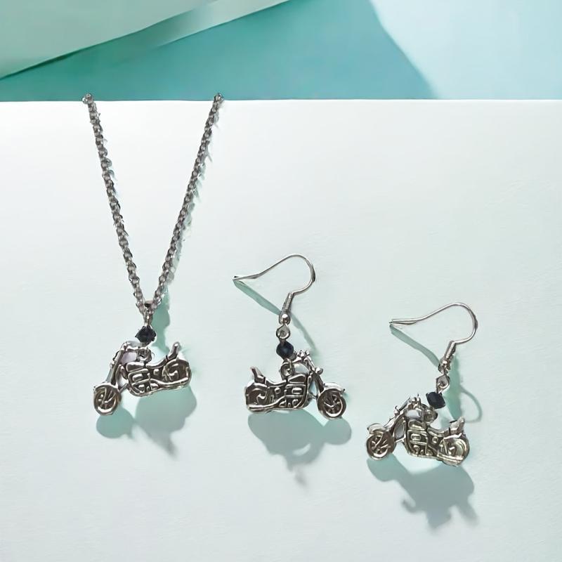 Elevate your style with this stunning motorcycle jewelry set featuring crystals, a stainless steel chain, and sterling silver ear studs. Perfect for any biker enthusiast.