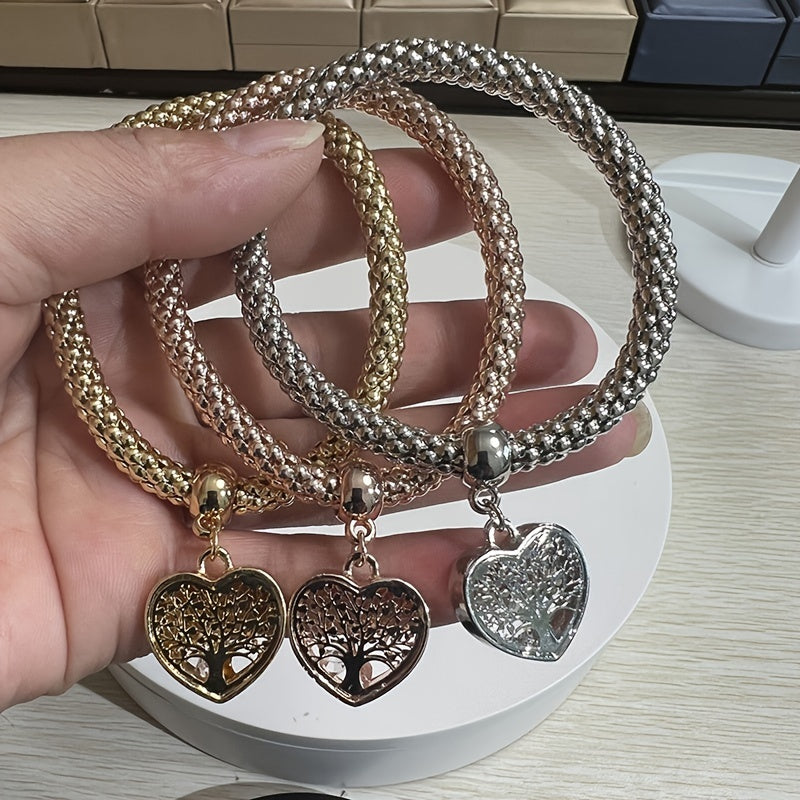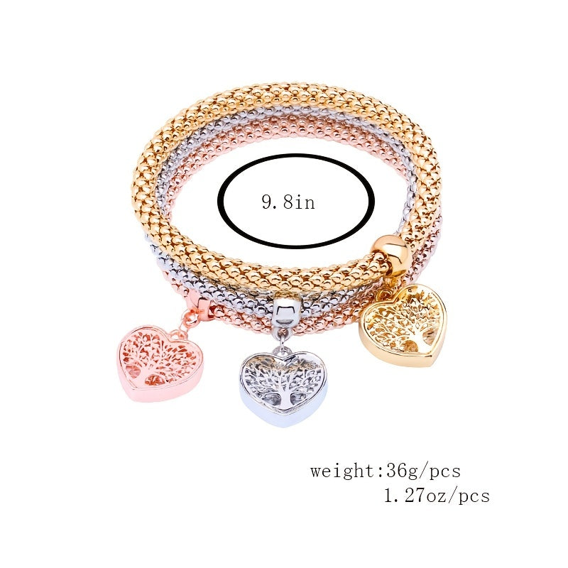This charming set includes 3PCS of bracelets featuring a silver rose corn chain, tree of life, and heart-shaped stretch design.