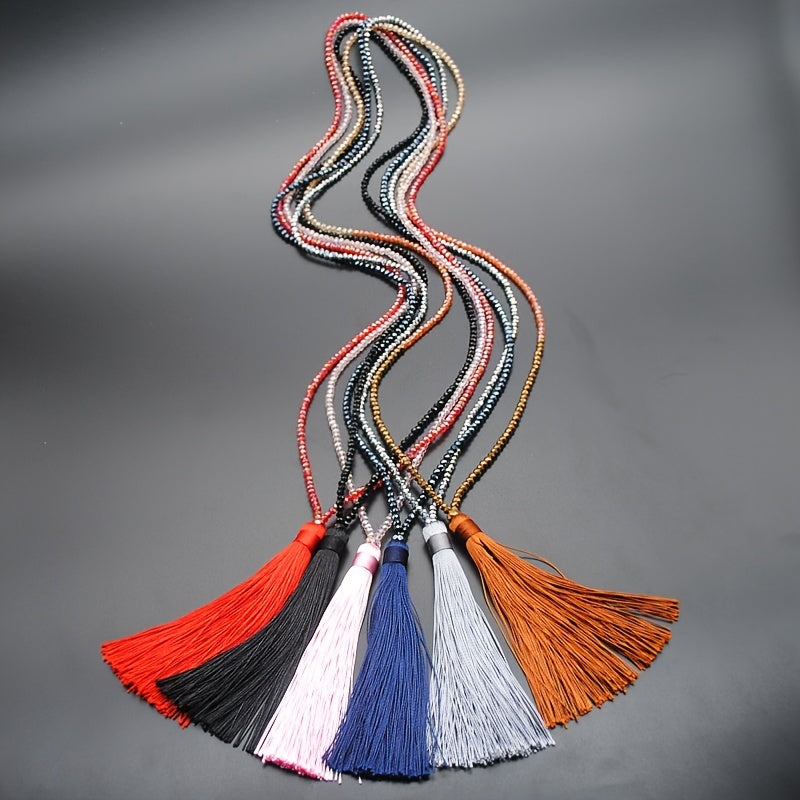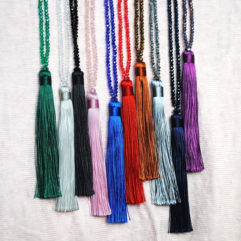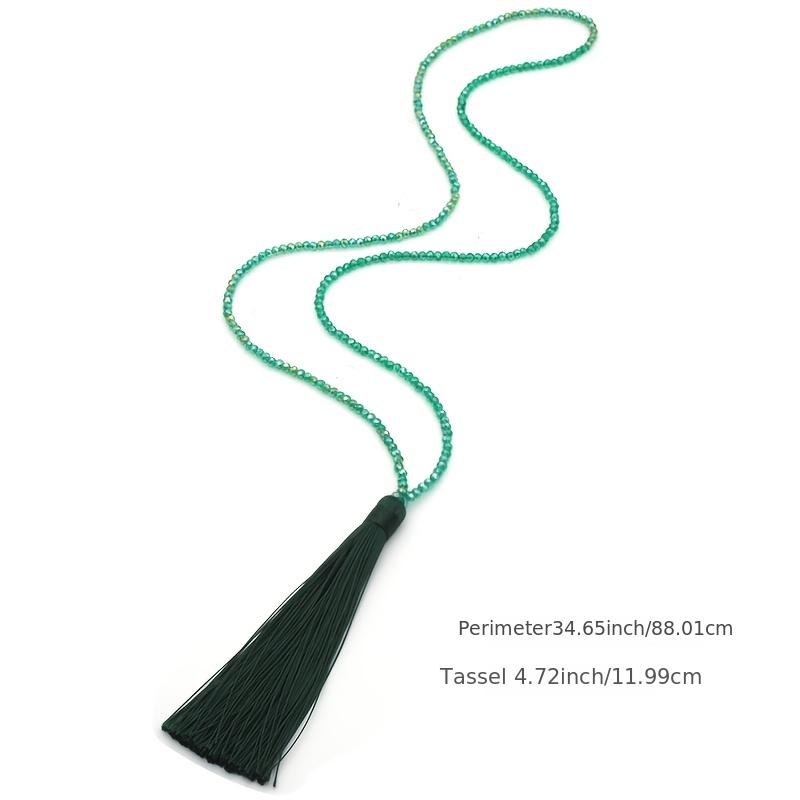 Elevate your style with this stunning multicolor crystal beaded necklace featuring a tassel pendant on a long sweater chain. Perfect for adding a pop of color and elegance to your outfit.