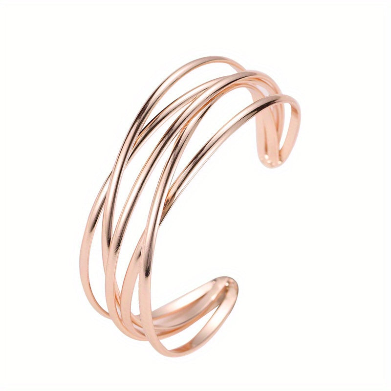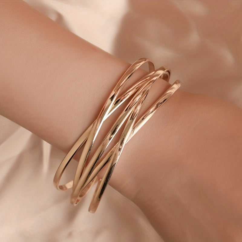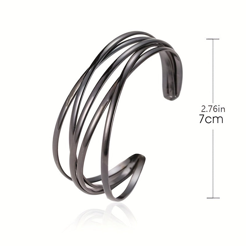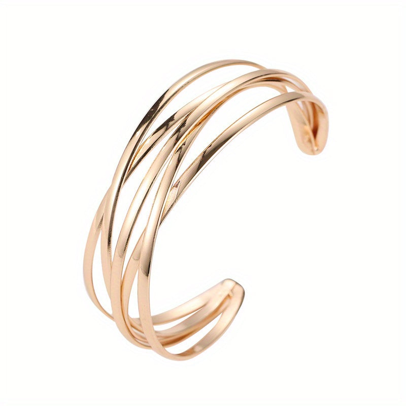 Stylish and unique, this multilayer cross cuff bangle is plated with 14K gold. It is a great addition to any outfit, adding a touch of personality and elegance.