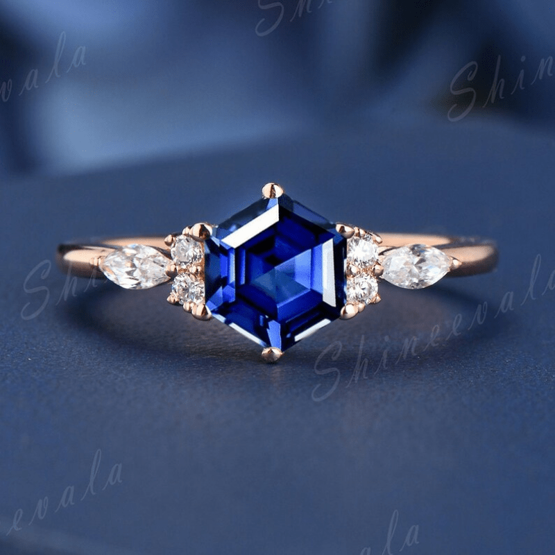 This stunning promise ring features inlaid ocean zircon and is plated with 14k gold. Perfect for brides, dainty evening parties, and weddings.