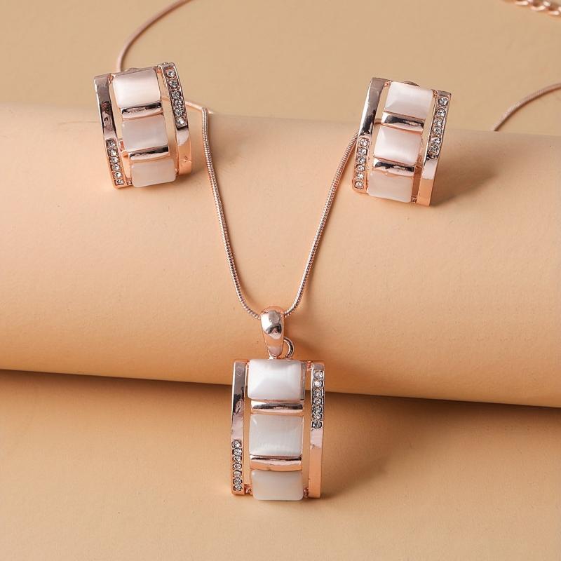 Complete your look with this stunning opal necklace and earrings set. The rectangular opal pendant necklace and stud earrings are accented with rhinestones for a touch of sparkle.