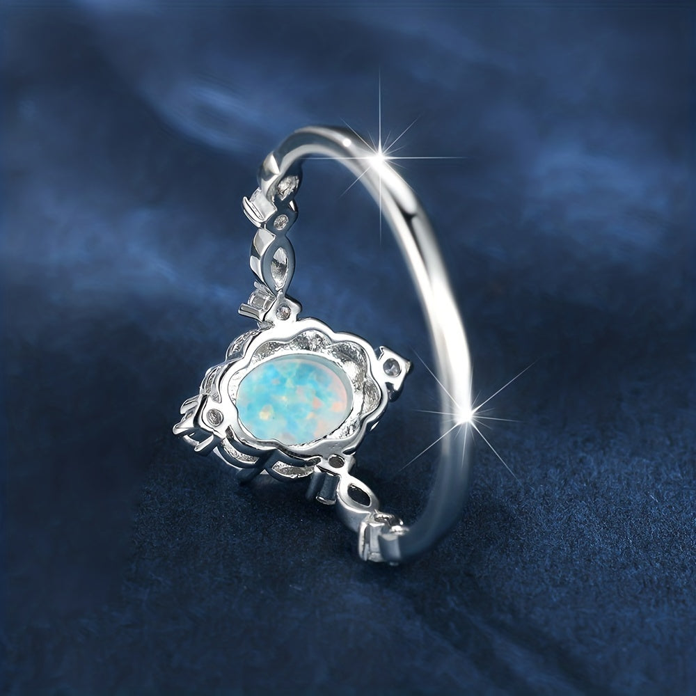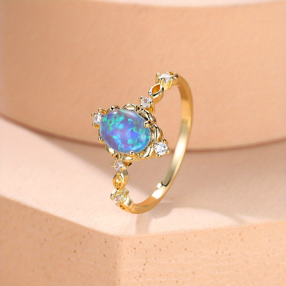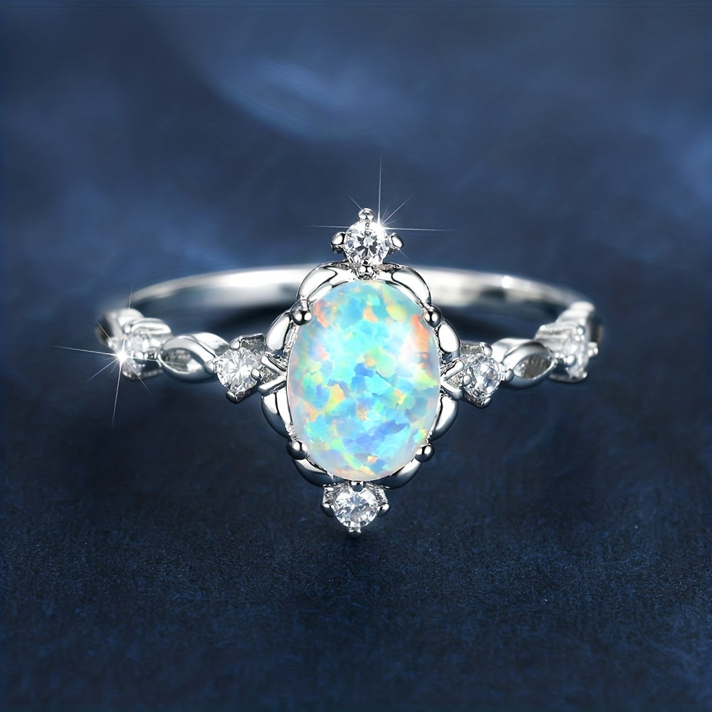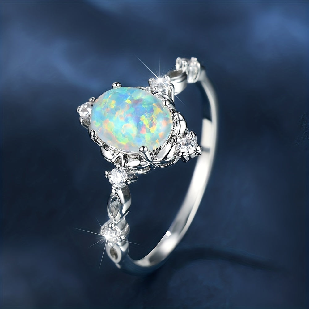 Enhance your style with this elegant inlaid oval cut opal finger ring. It is a perfect accessory to add a touch of glamour to any outfit.