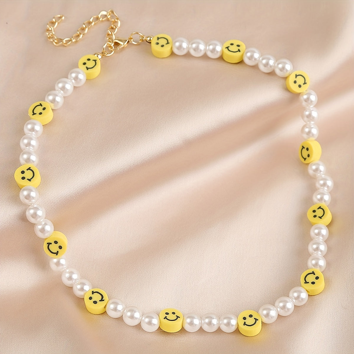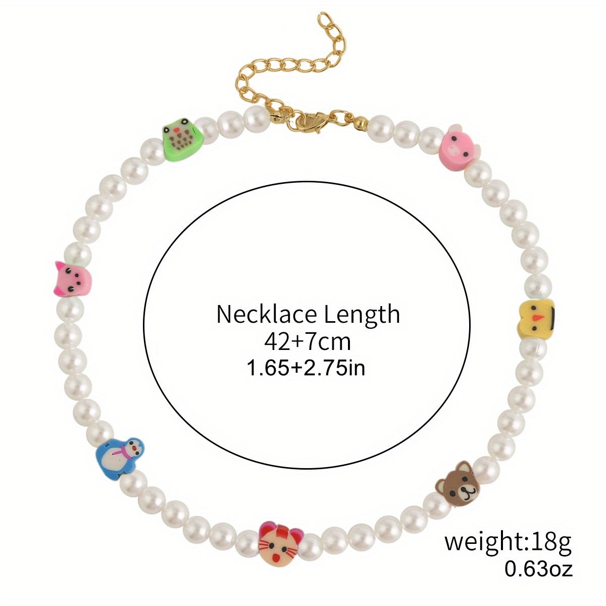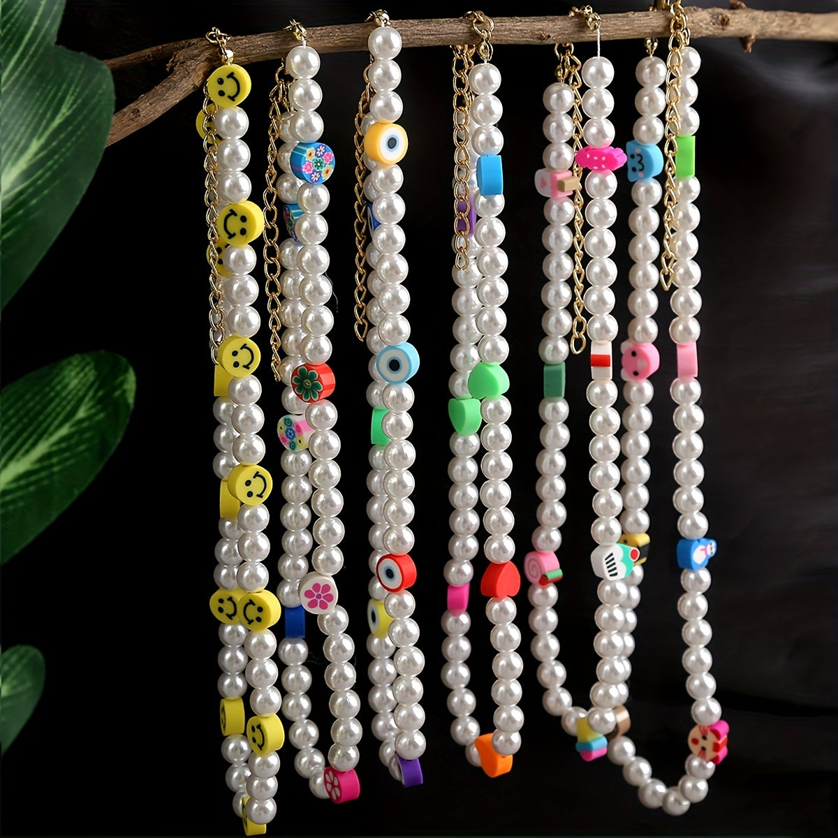 Add a touch of whimsy to your summer outfits with this adorable faux pearl necklace featuring love, smiley face, candy, fruit, flower, and devil eye soft pottery charms.
