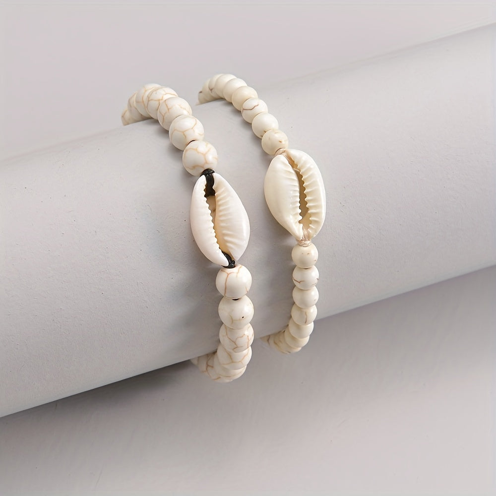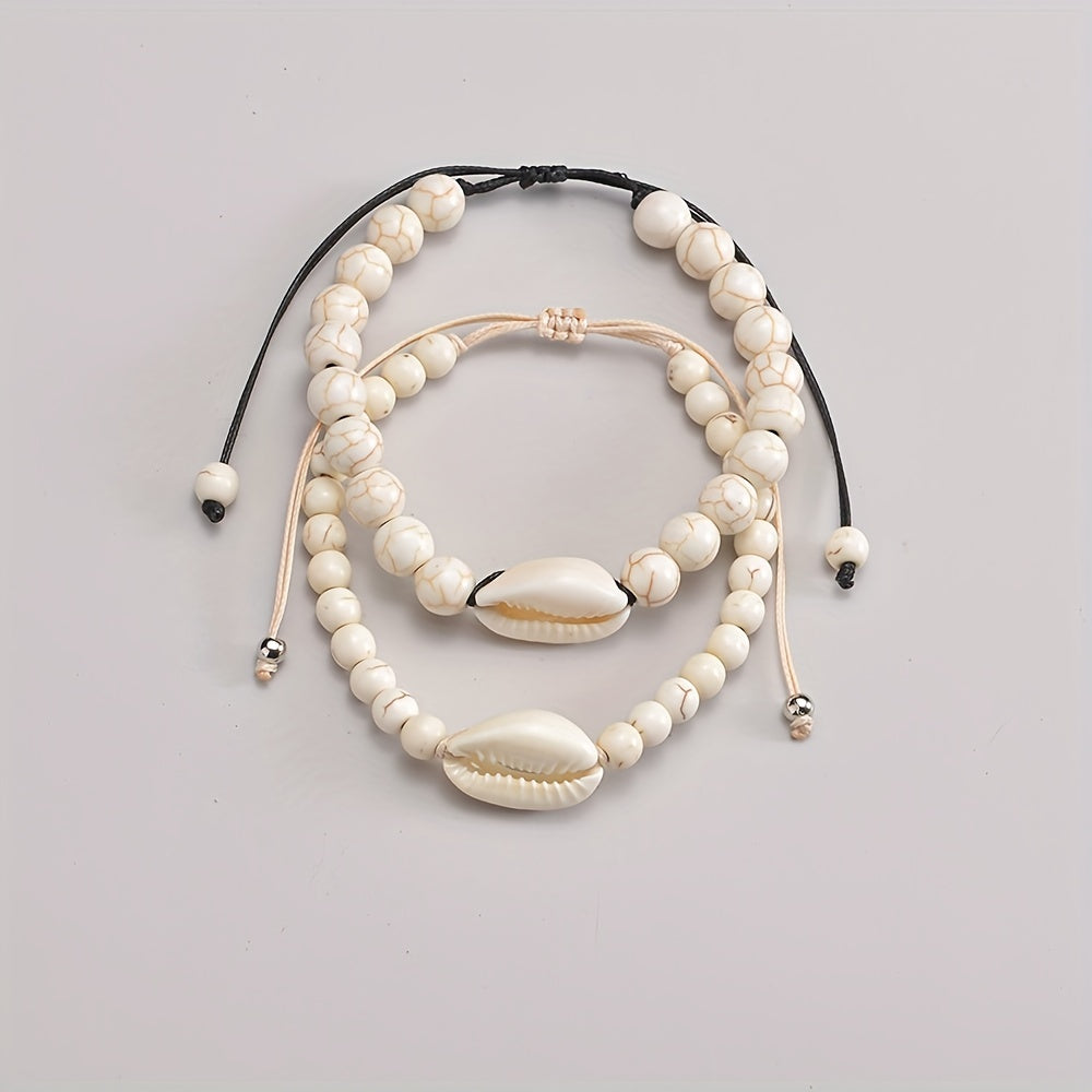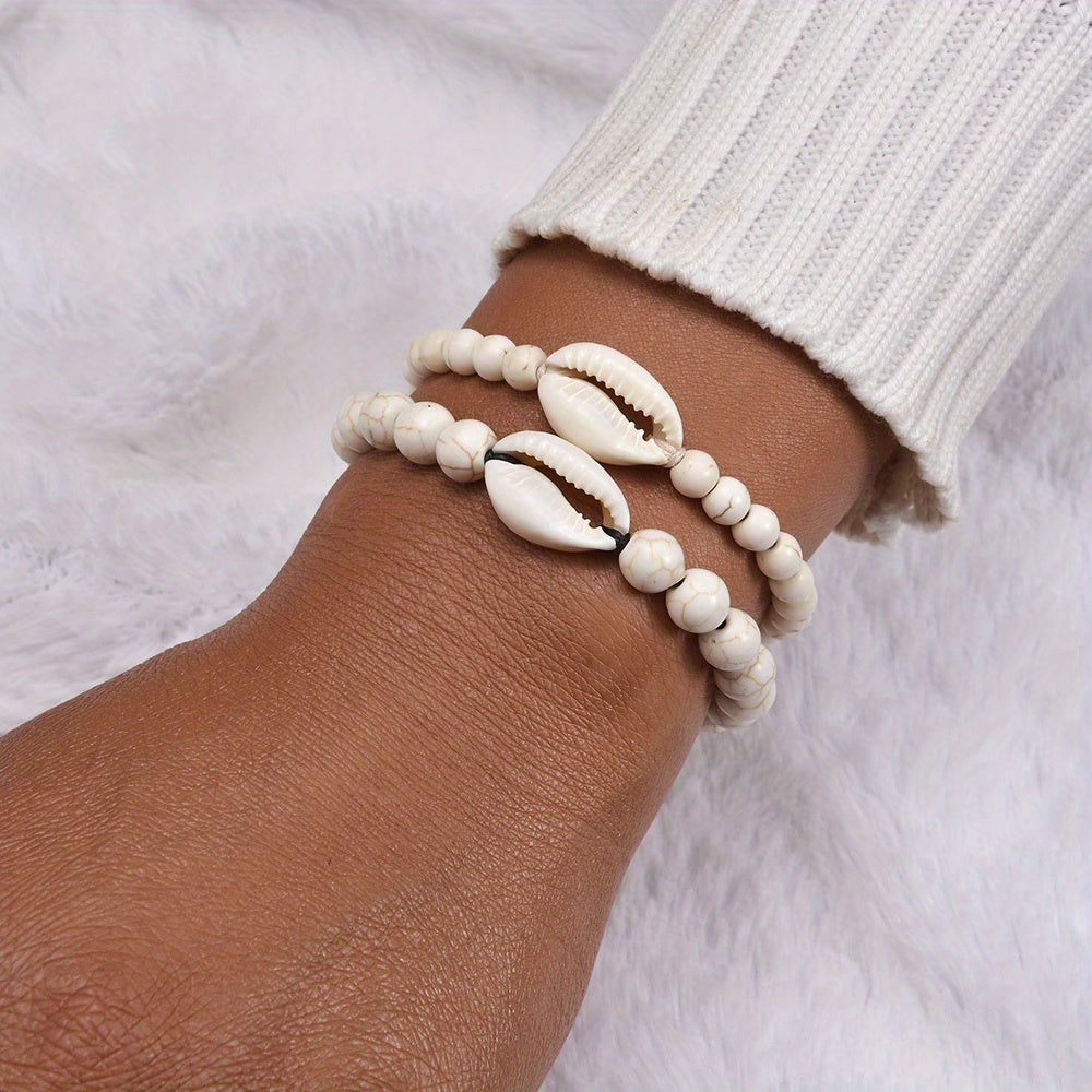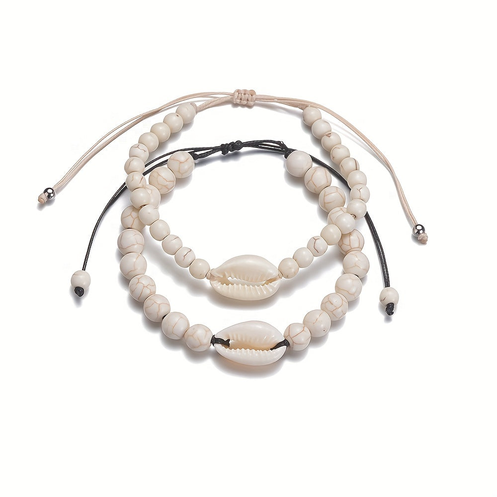 Perfect accessory for women during summer beach holidays. This adjustable double layer bracelet set features beautiful shell beads.