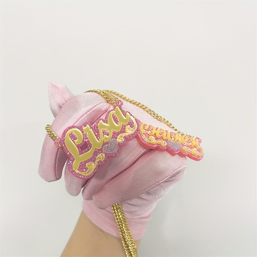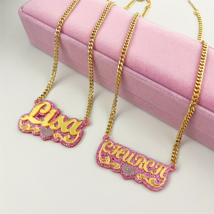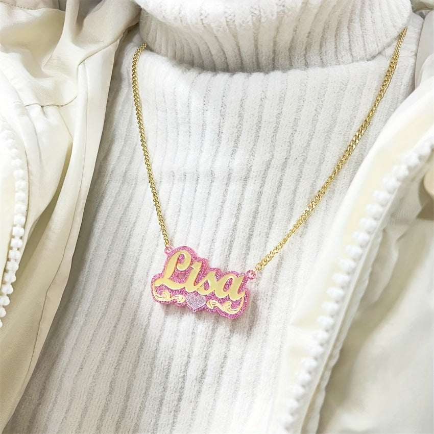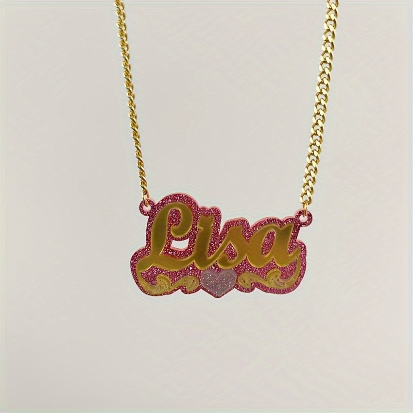 A custom acrylic name necklace featuring a heart theme design, plated in 18K gold. Perfect for daily wear, gift-giving occasions like Christmas, holidays, and all seasons.