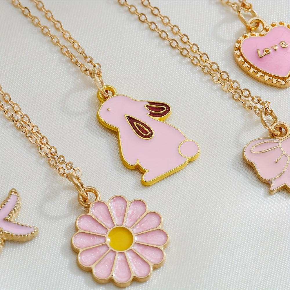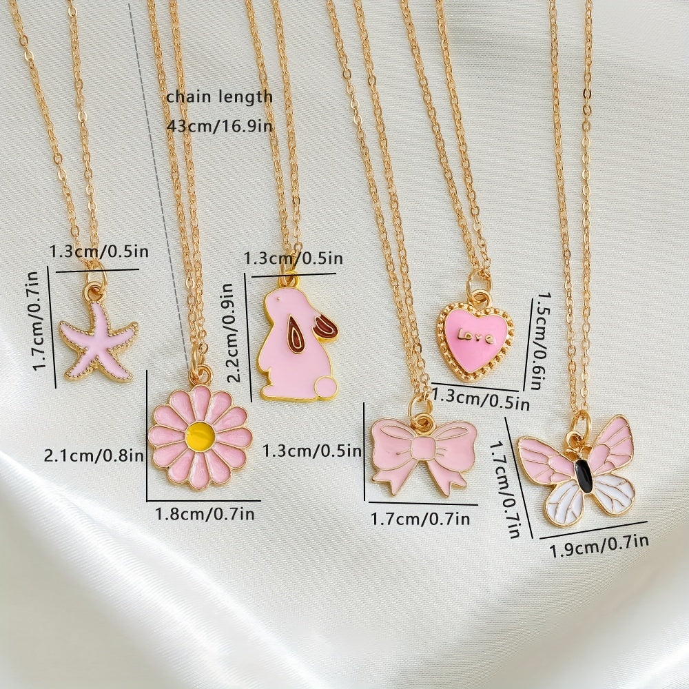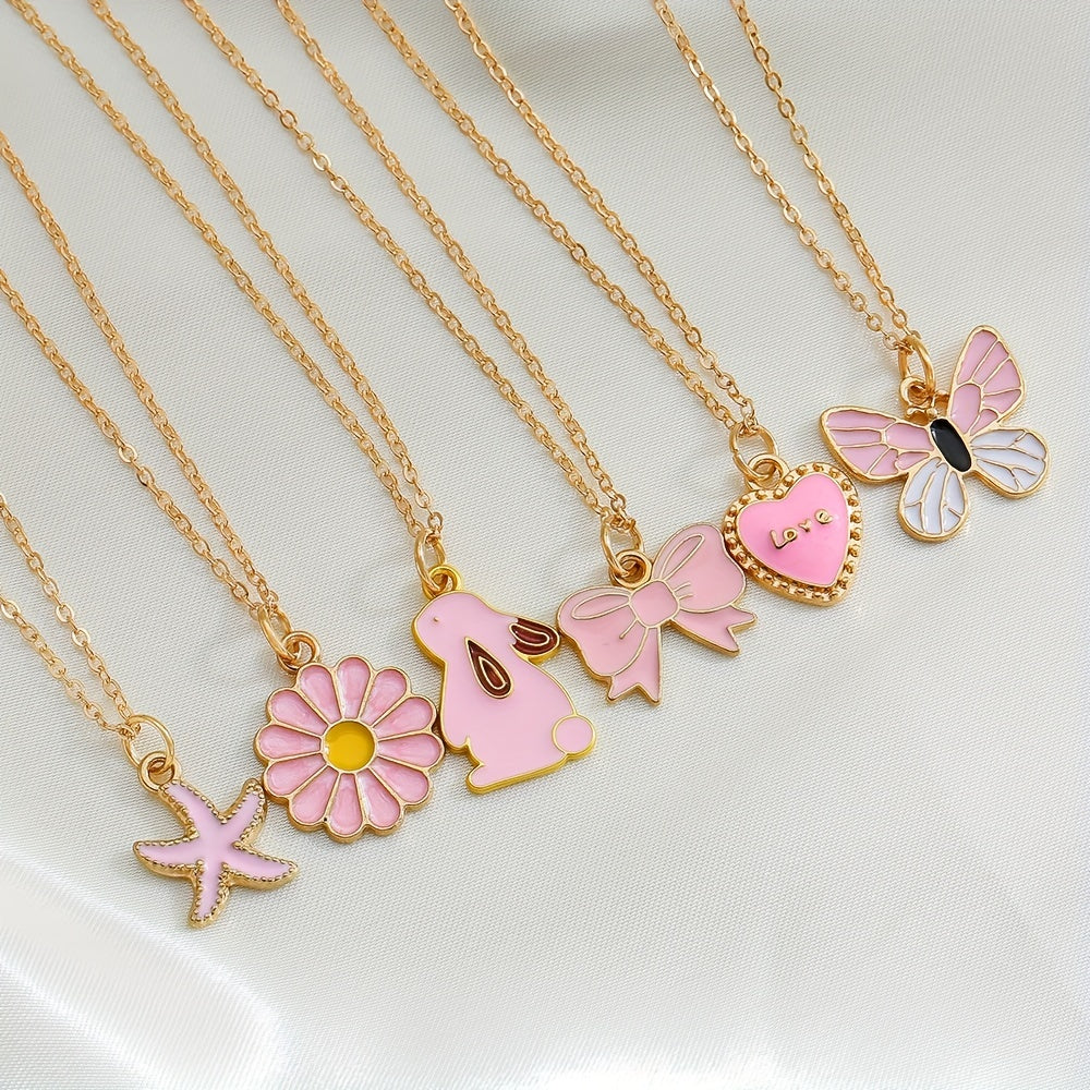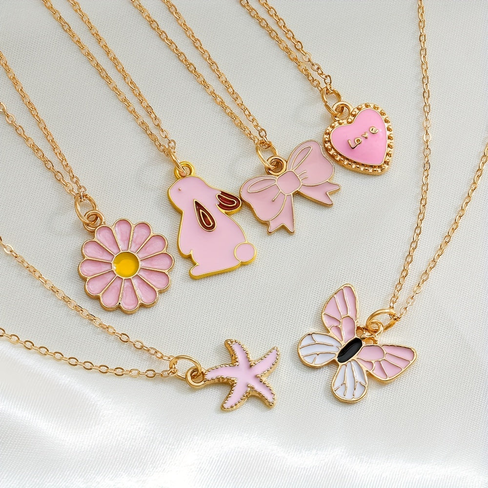 This charming pendant necklace features a pink butterfly, starfish, daisy, bunny, and love heart design. Perfect for women and girls who love nature-inspired jewelry.