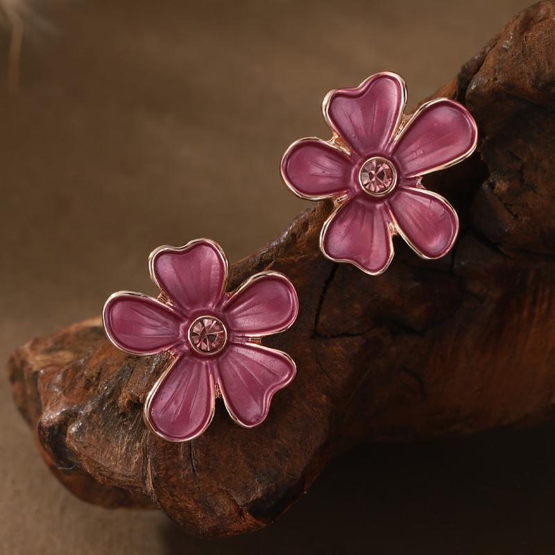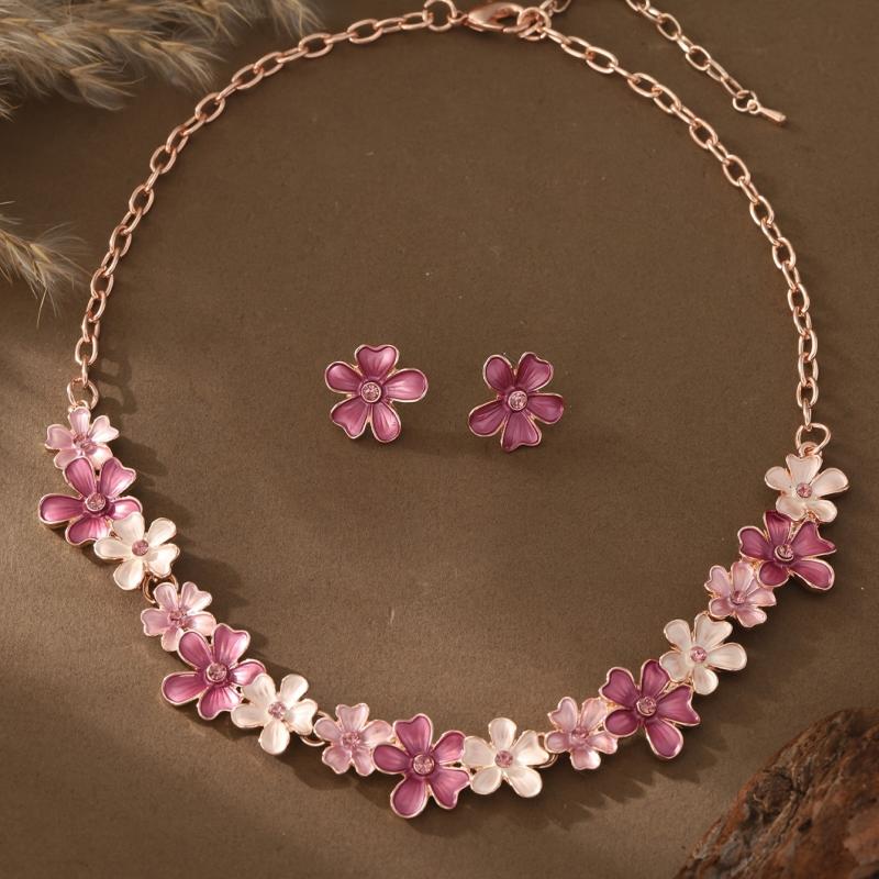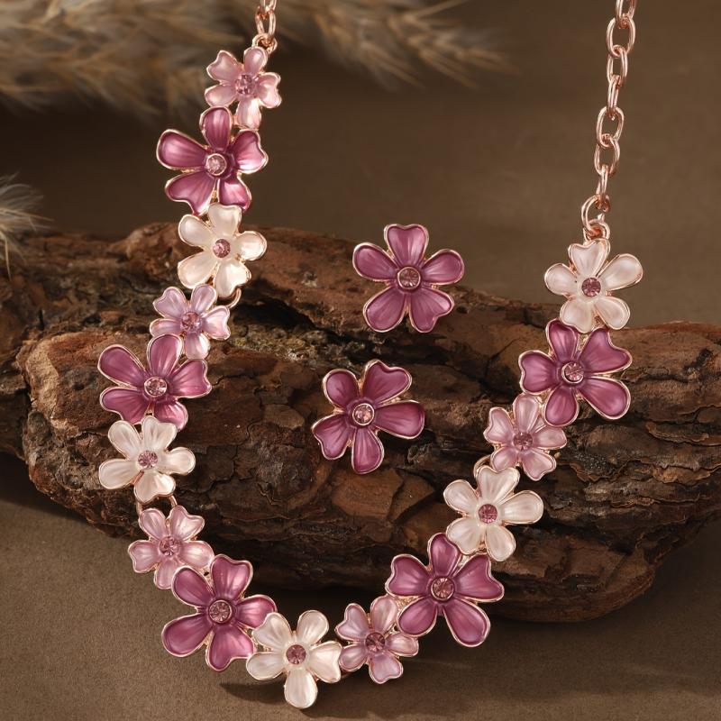 Complete your spring and summer look with this stunning jewelry set featuring large pink enamel flowers. Perfect for vacations and special occasions.