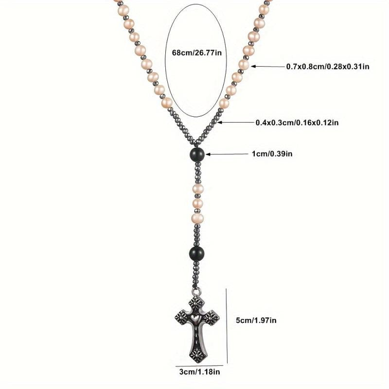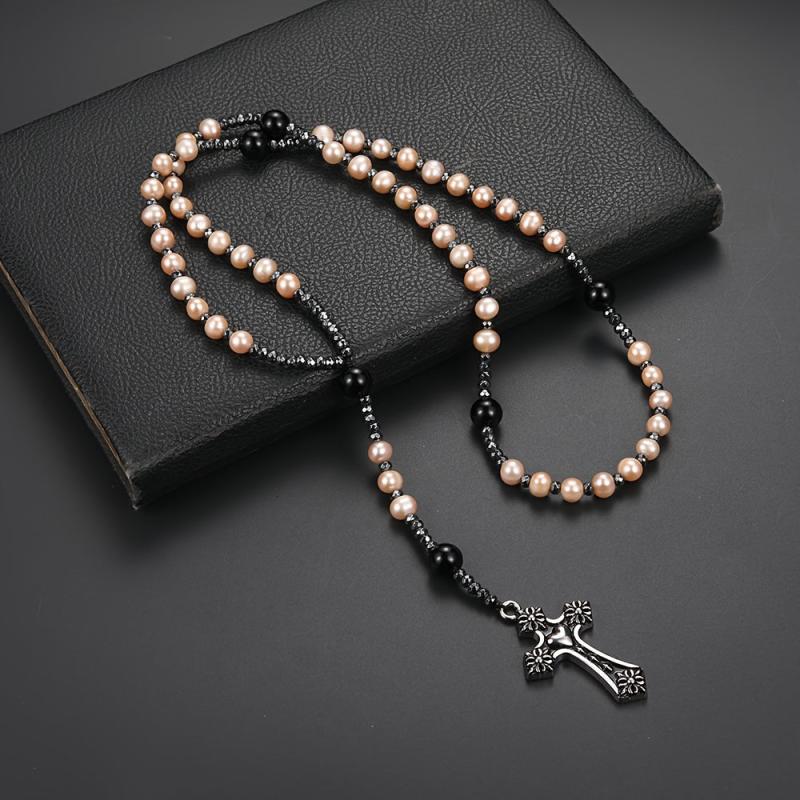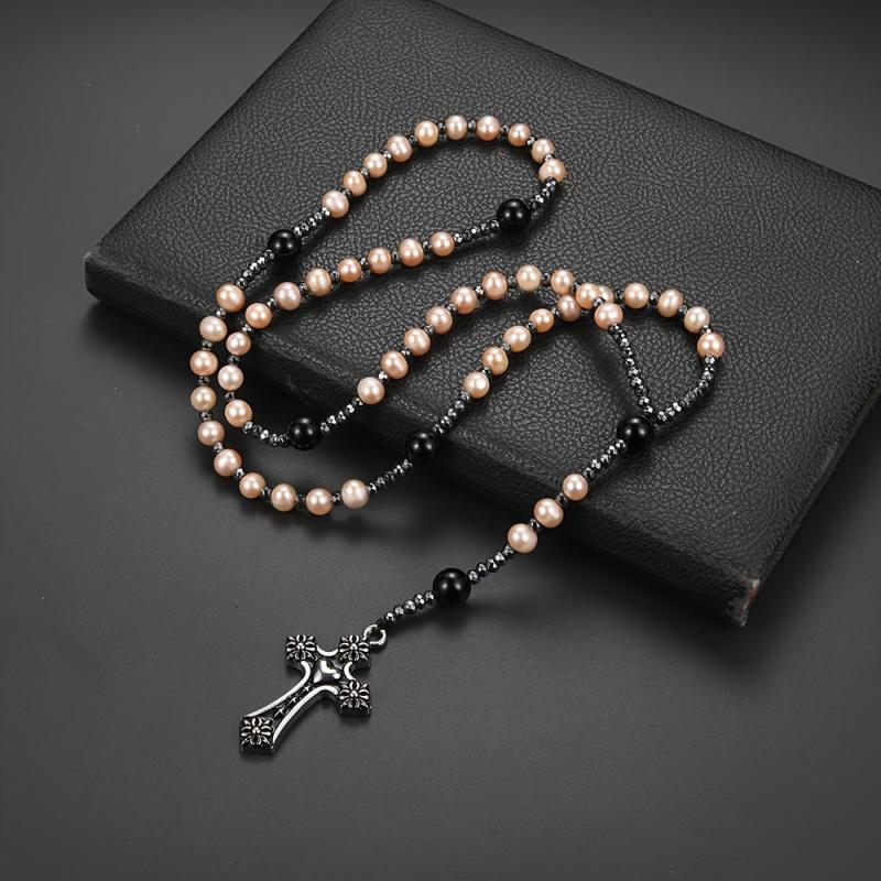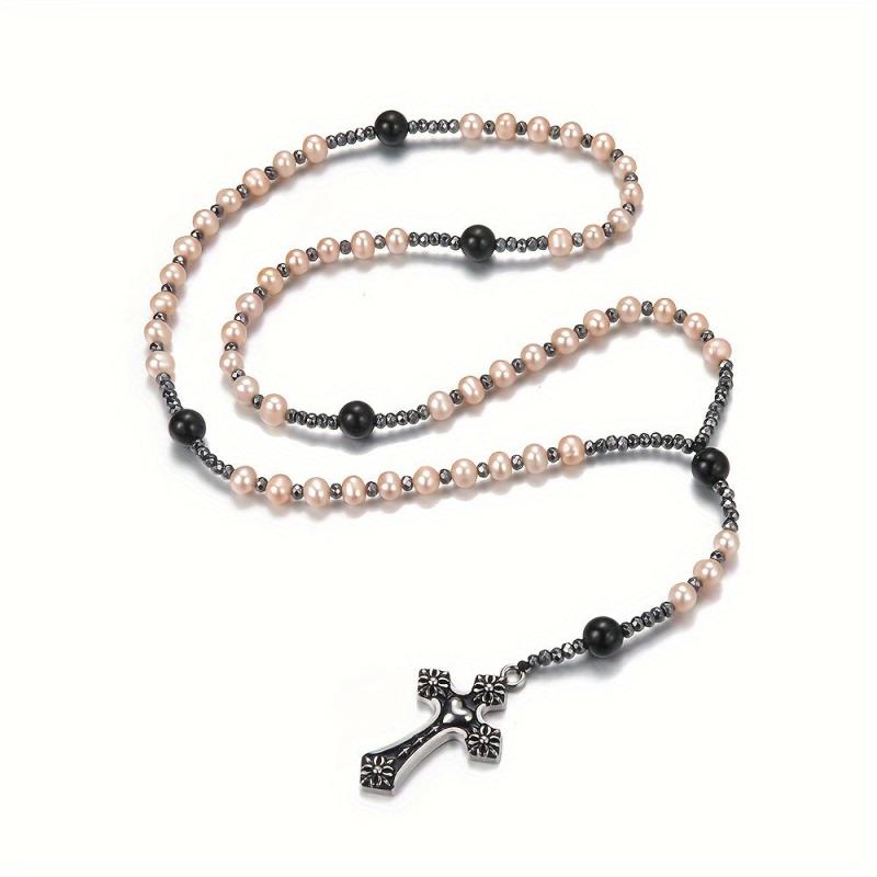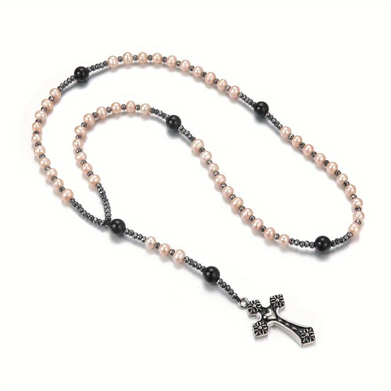 This stunning rosary features natural freshwater pearls in a beautiful pink hue. The rosary is adorned with a heart and cross pendant, making it a perfect gift for any occasion, especially Mother's Day. The simple yet elegant design makes it suitable for everyday wear.