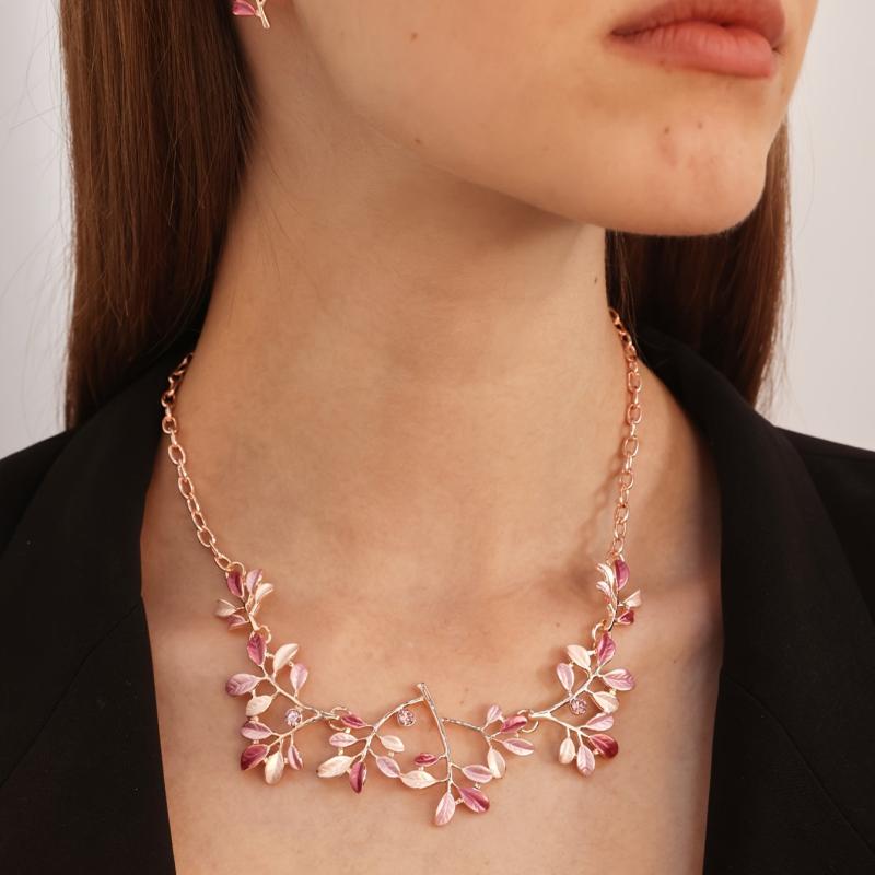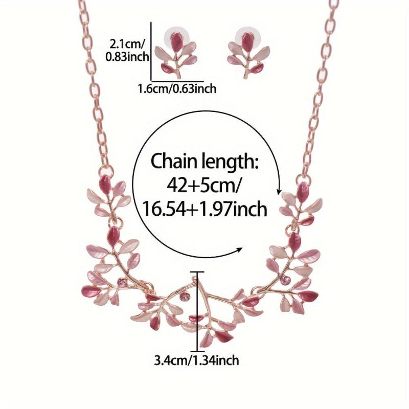 Elegant pink leaf jewelry set includes a pair of earrings and a necklace. Made of high-quality zinc alloy, perfect for party or special occasions. Makes a great gift for women.