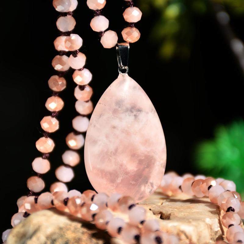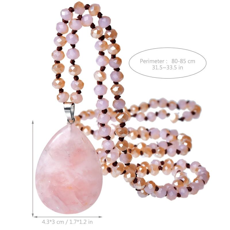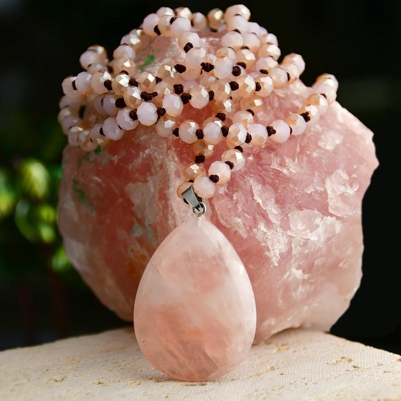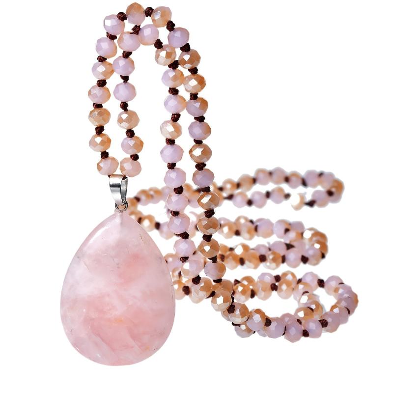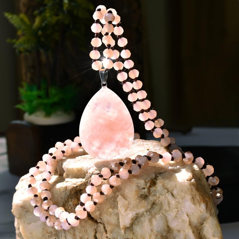 Elegant long necklace with pink teardrop natural stone pendant, ideal as a gift for women on Valentine's Day or for a bohemian vacation look.
