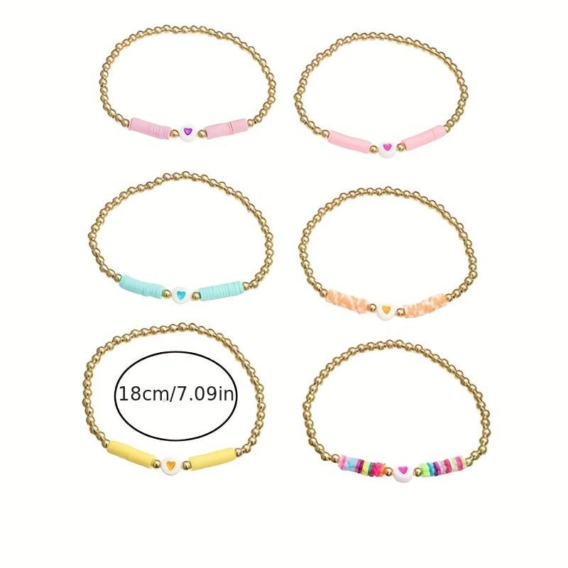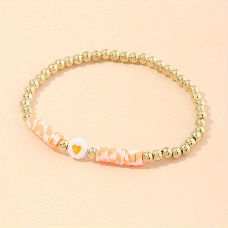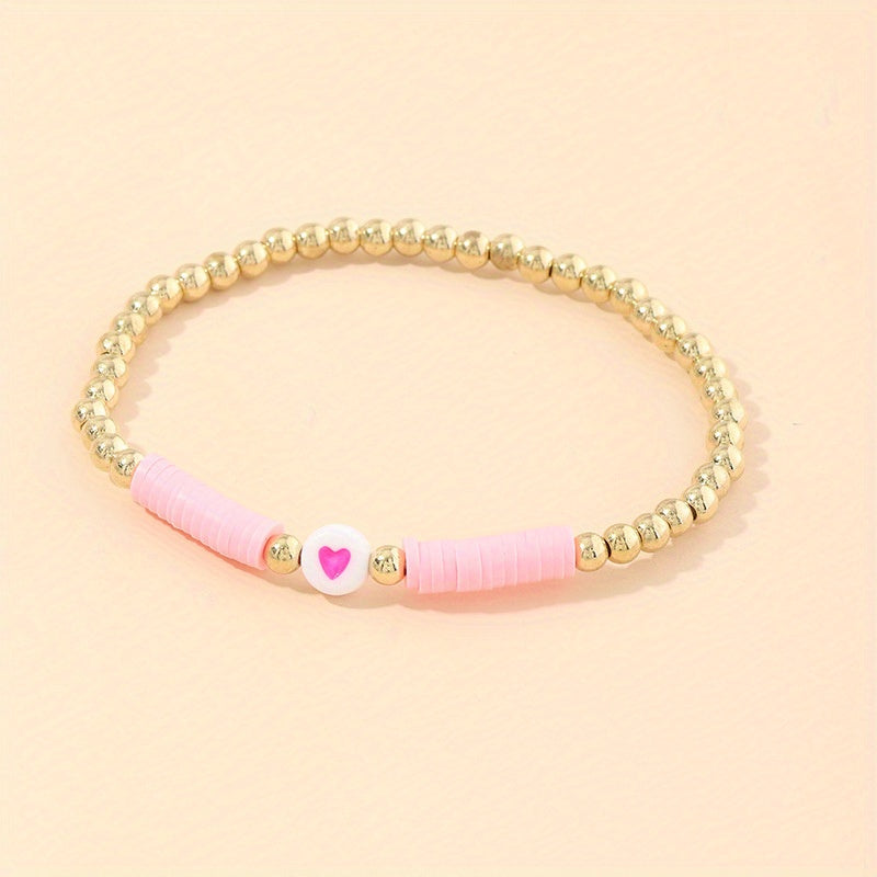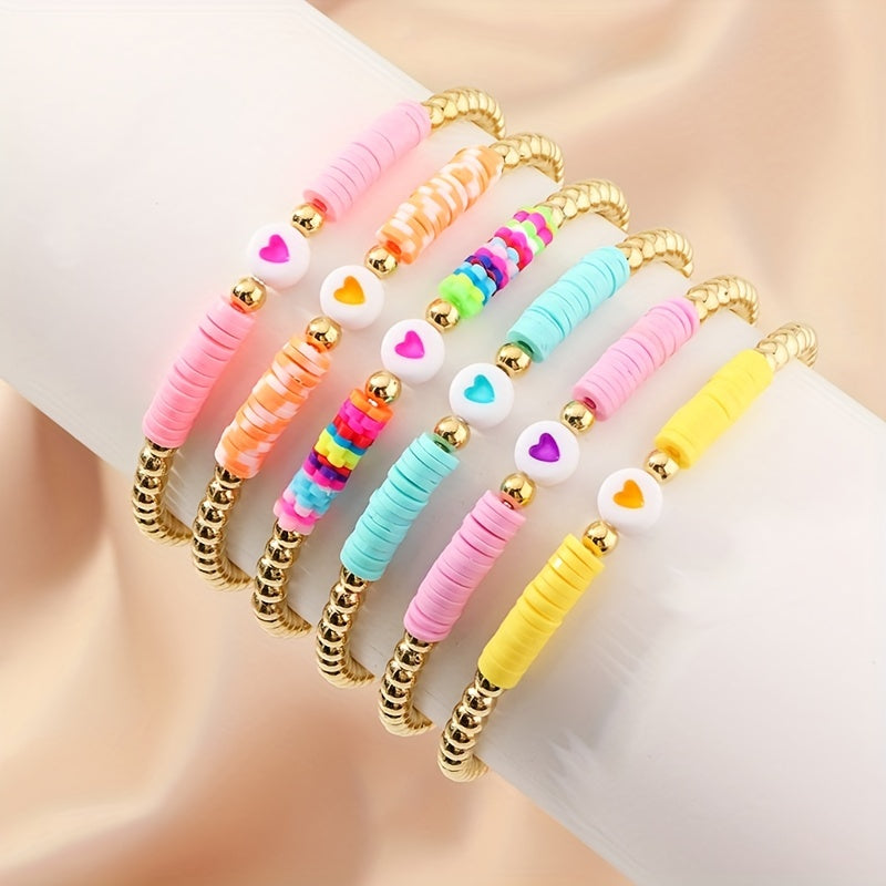 This colorful bracelet is handmade with polymer clay beads and heart shaped beads, perfect for adults and kids.