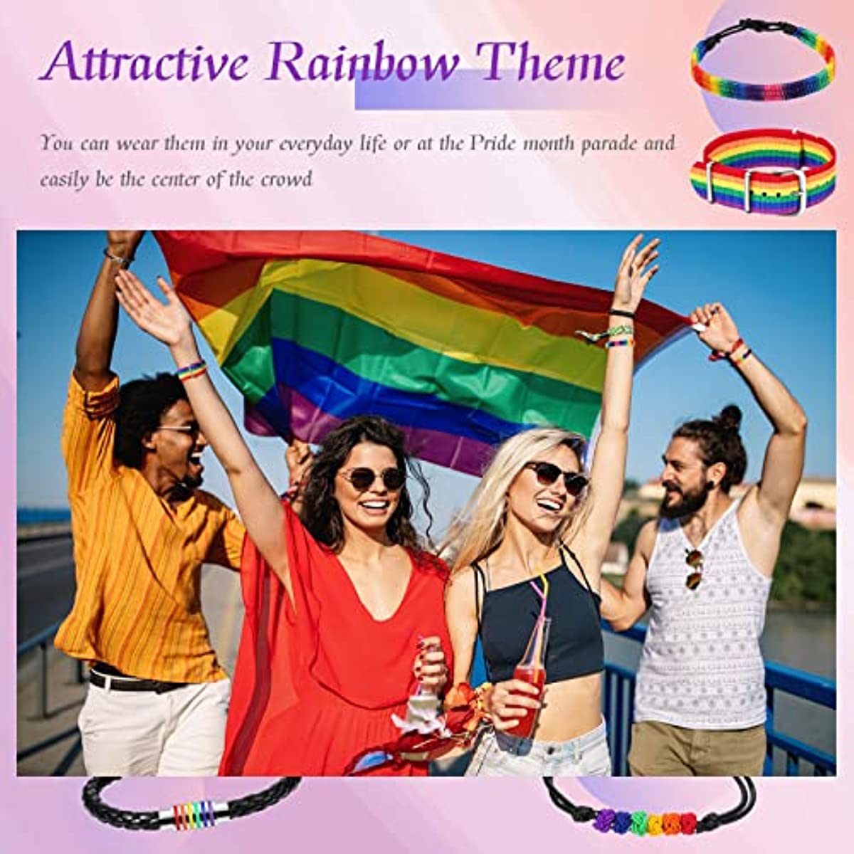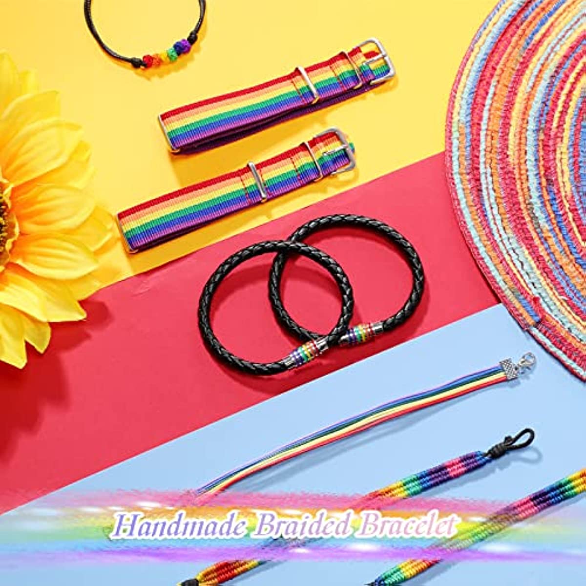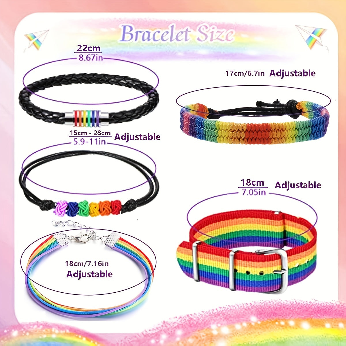 Celebrate Pride Month with these colorful rainbow bracelets that feature a braided design. Show your support for the LGBTQ+ community with these adjustable wristbands. Perfect for couples or friends who want to display their pride!