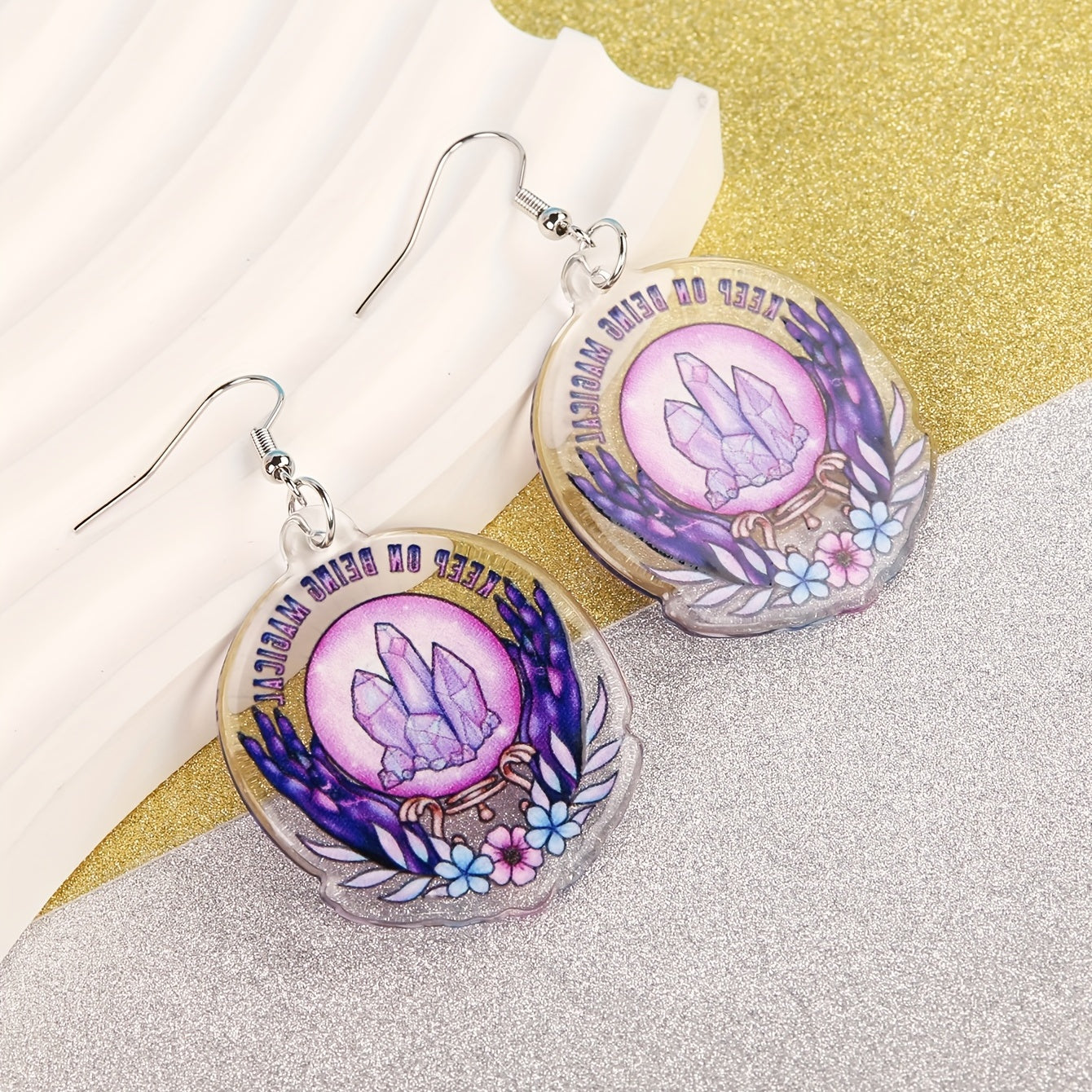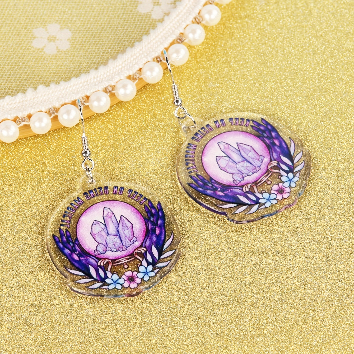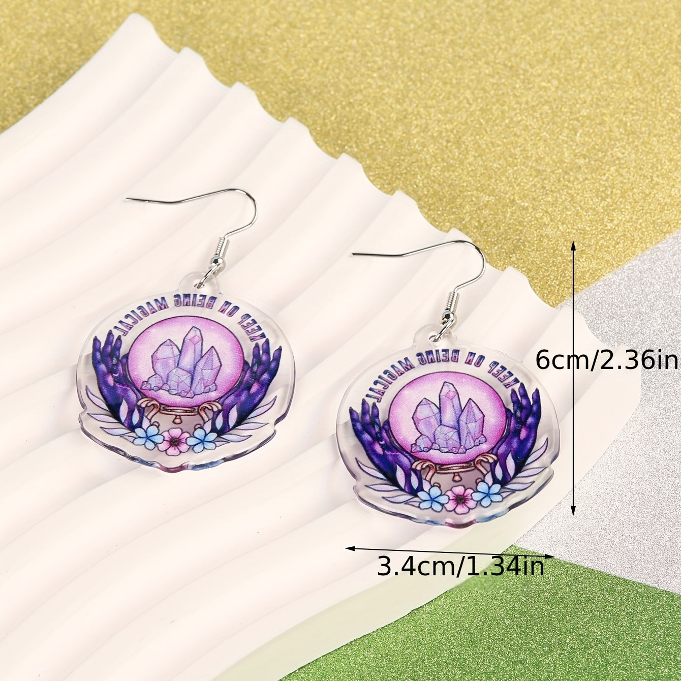Add a touch of retro goth style to your Halloween look with these elegant round dangle earrings featuring a purple crystal flower pattern. Made of high-quality acrylic, these earrings are the perfect spooky accessory.
