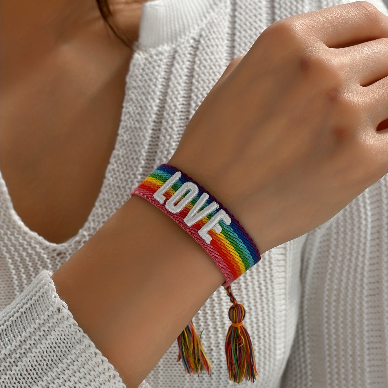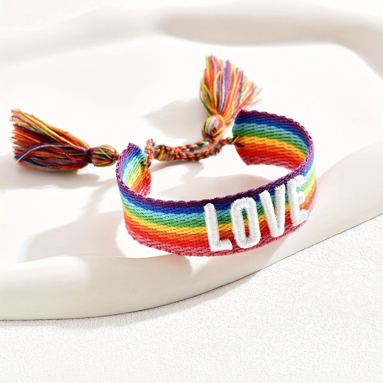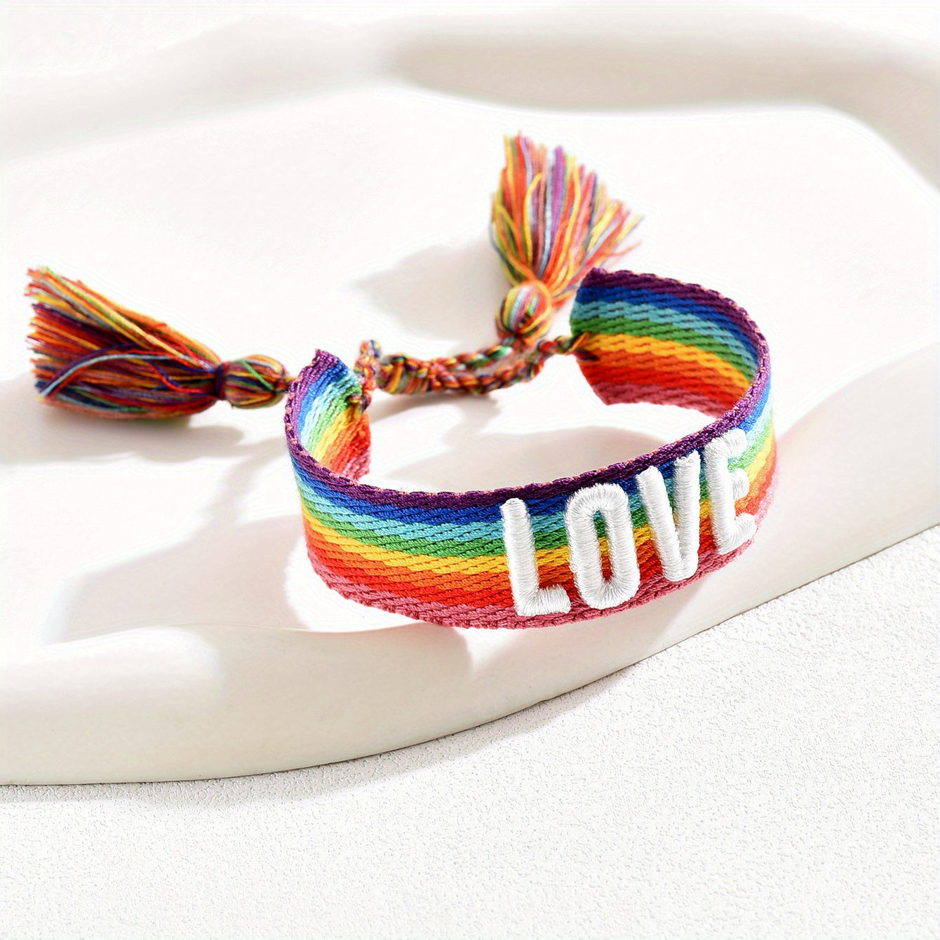 Celebrate love with this vibrant rainbow braided bracelet featuring a long tassel pendant with LOVE alphabet embroidery. Hand-woven with care, this bracelet is perfect for mothers, graduations, LGBT Pride Month, or as a Mexican-inspired accessory.