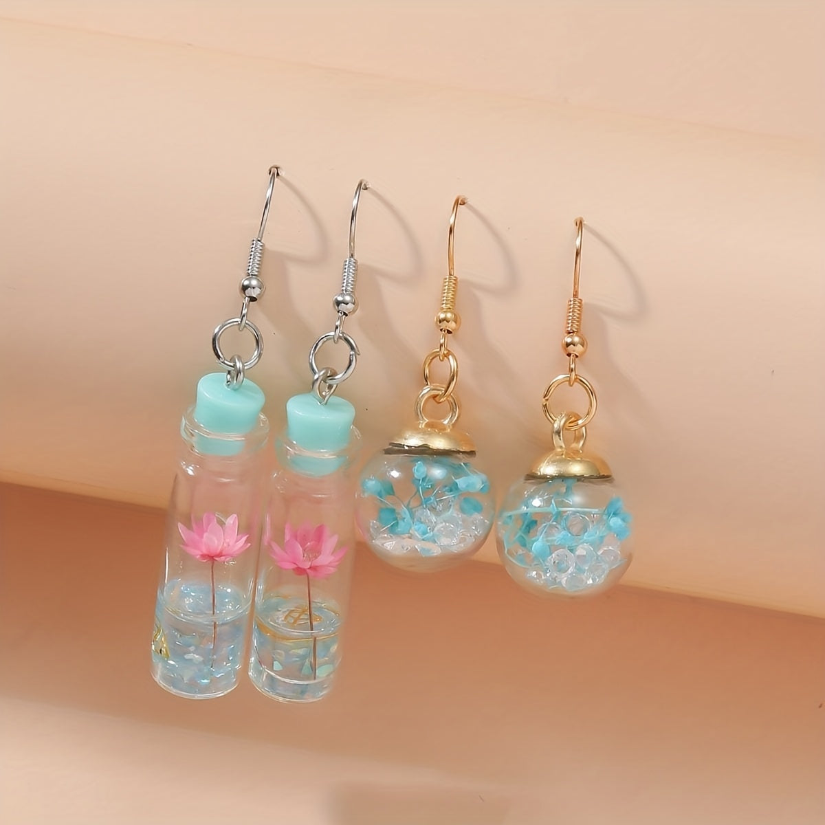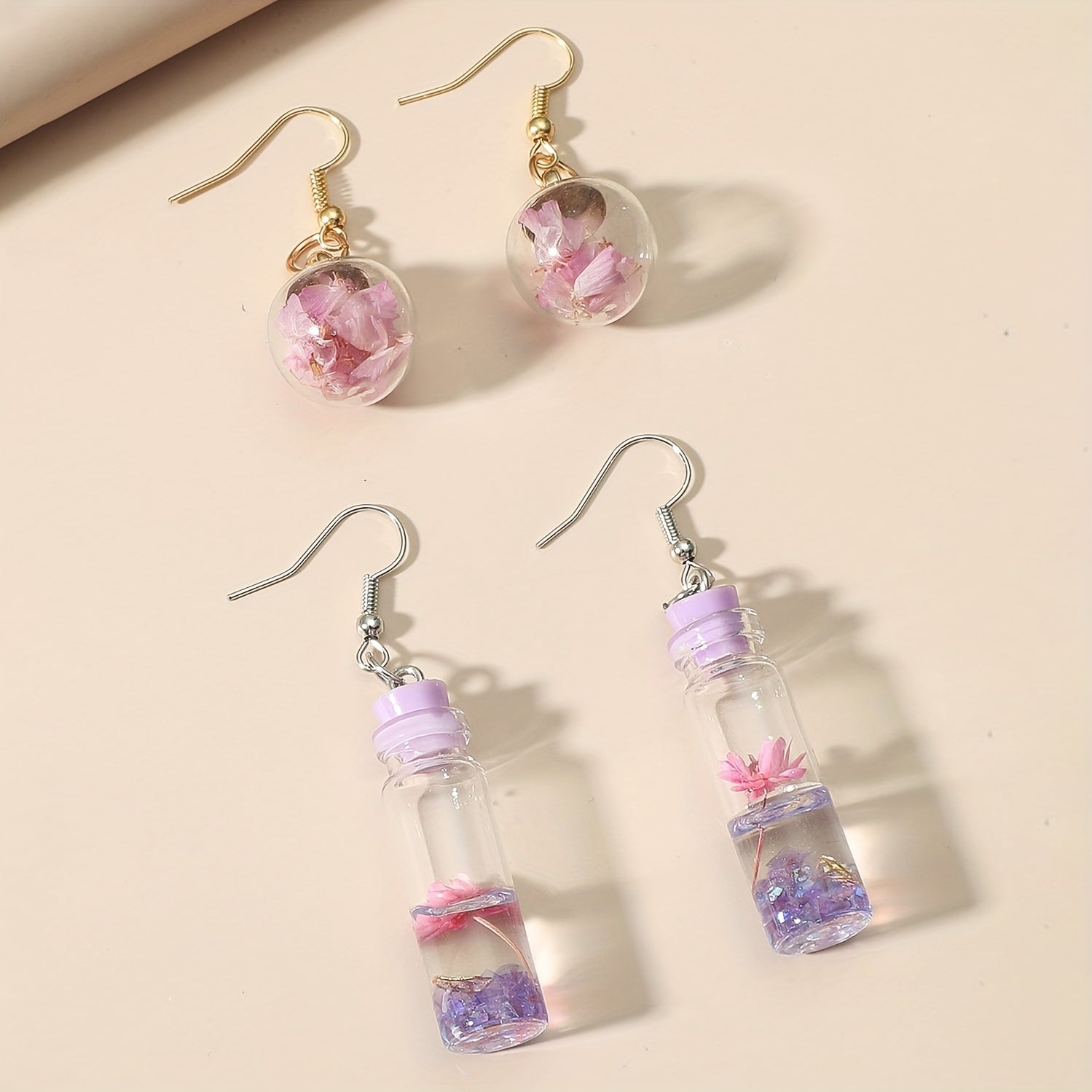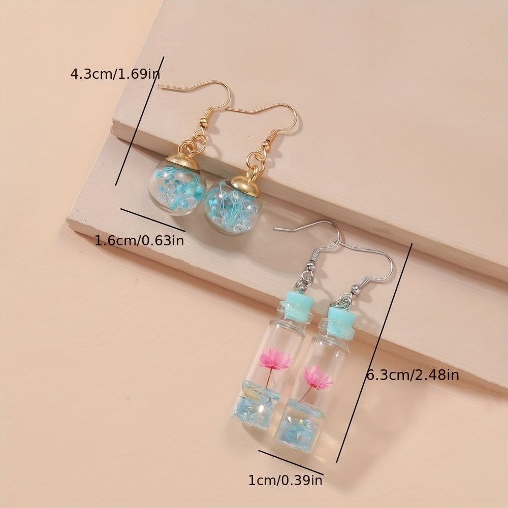 Embrace a leisure style with these unique earrings featuring real dried flowers encased in glass bottles. This creative gift set is perfect for adding a touch of personality to any outfit.