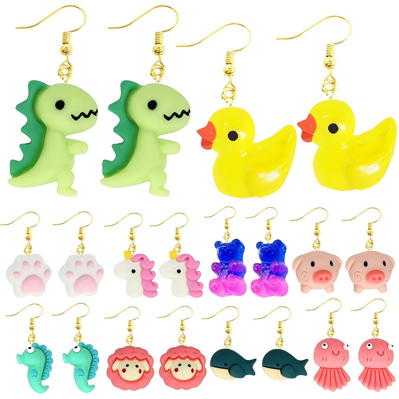Add a touch of whimsy to your outfit with these resin animal earrings featuring ducks, frogs, bears, unicorns, and dinosaurs.