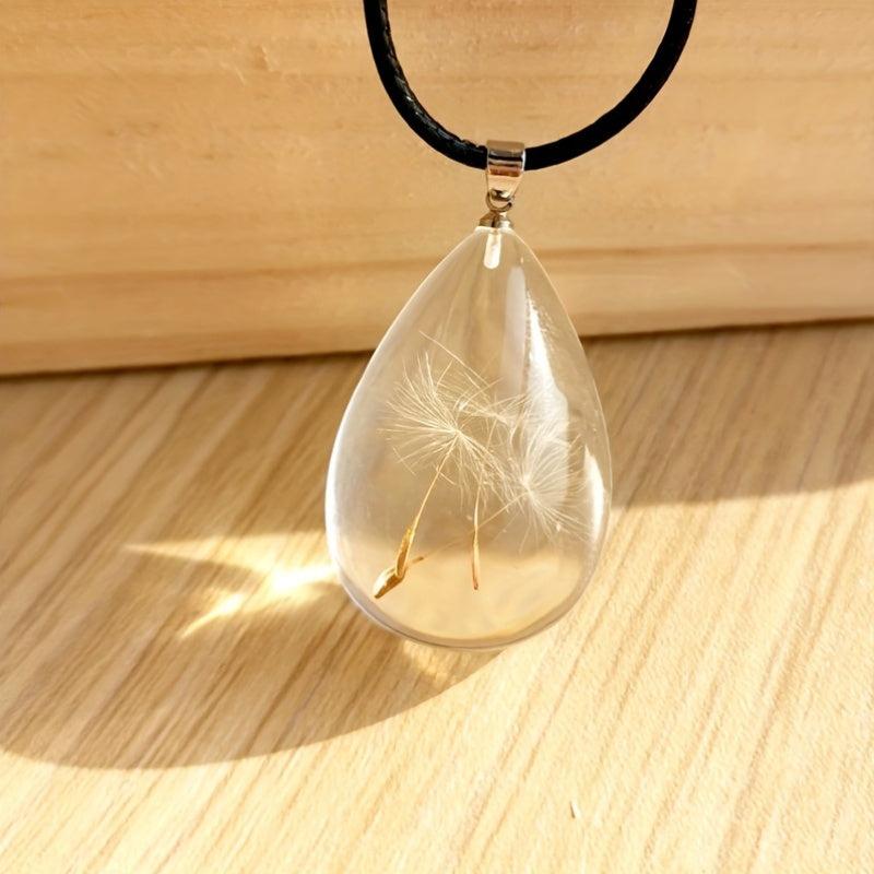 This pendant necklace features a real dandelion plant specimen encased in resin and hung on a synthetic fiber rope. Perfect for daily wear in all seasons.