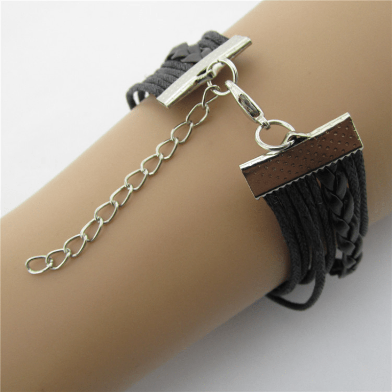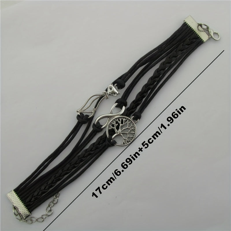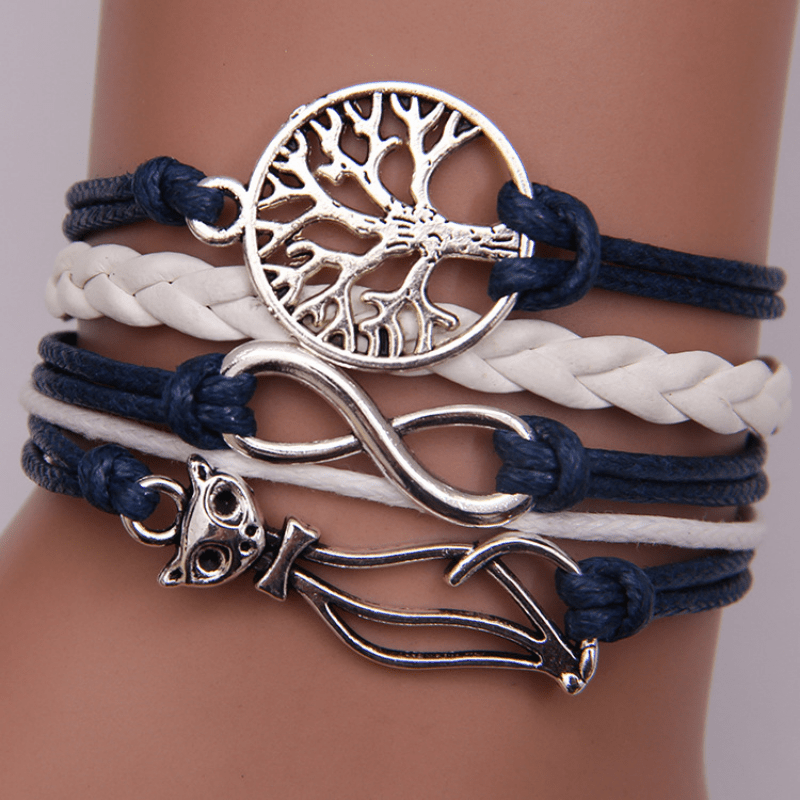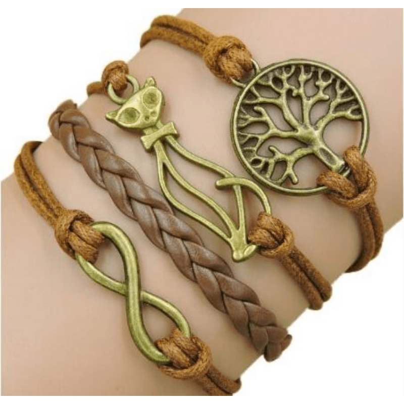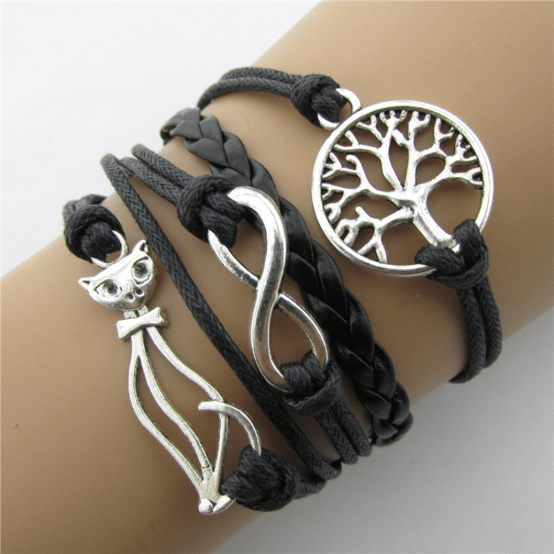 Vintage style leather rope bracelet with cat, tree, and infinity charms.