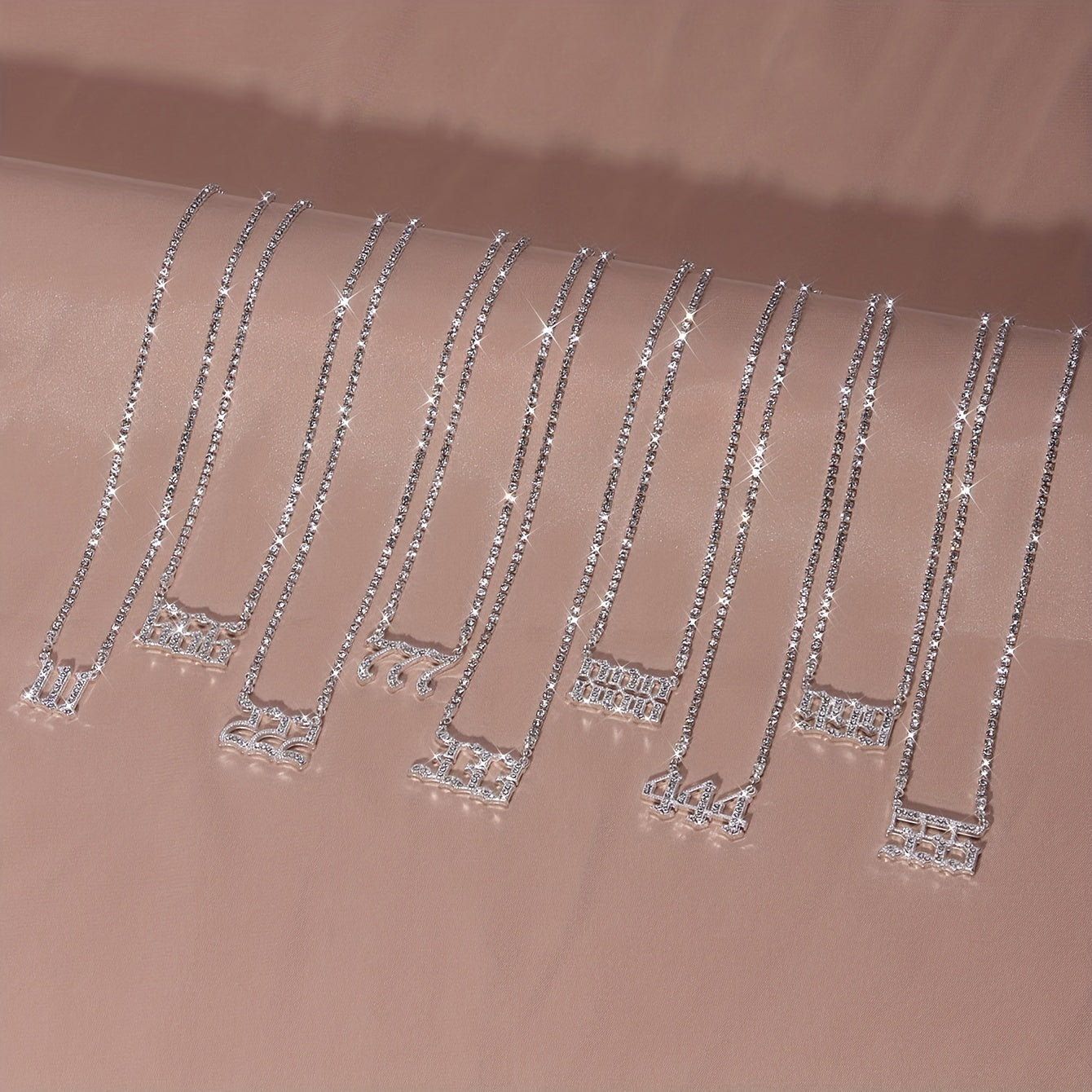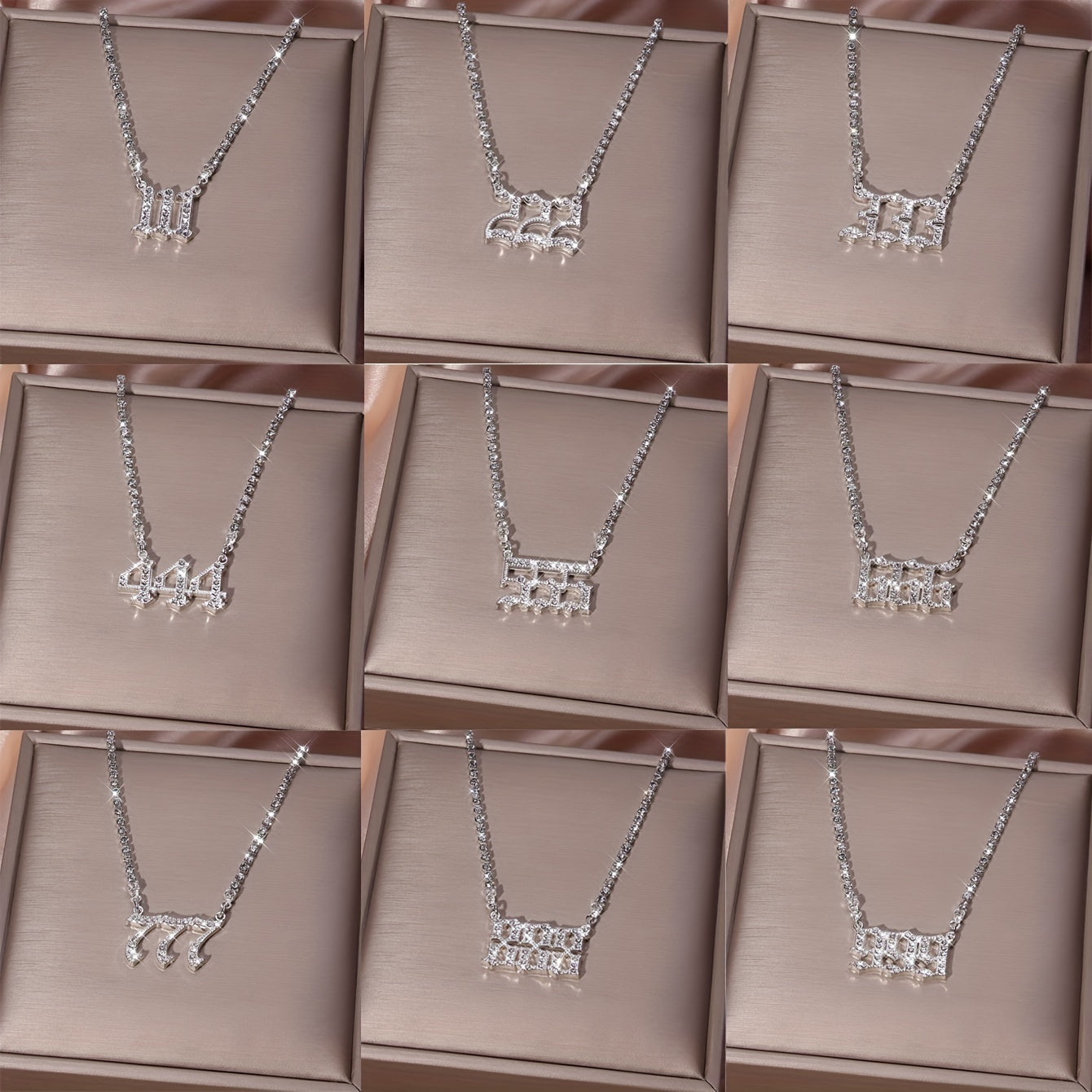 This stunning necklace features angel numbers 111, 222, 333, 444, 555, 666, 777, 888, and 999 in full rhinestone embellishments. The pendant is elegantly designed and hangs from a silver claw chain.
