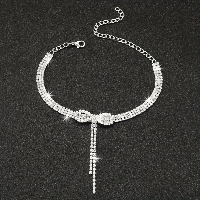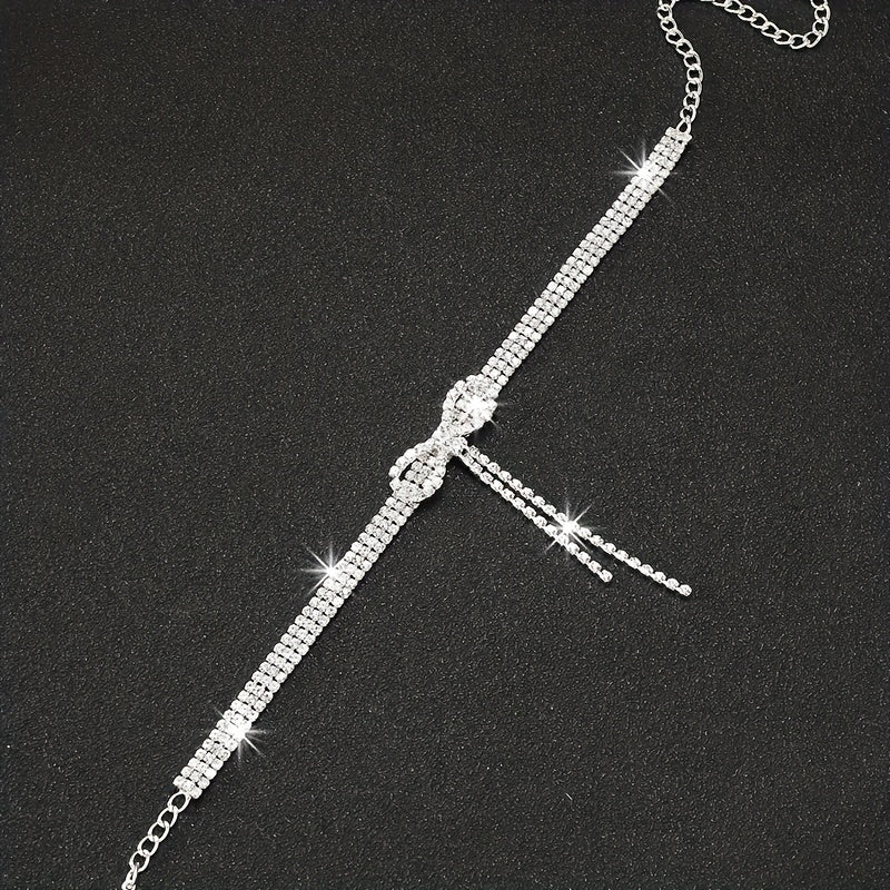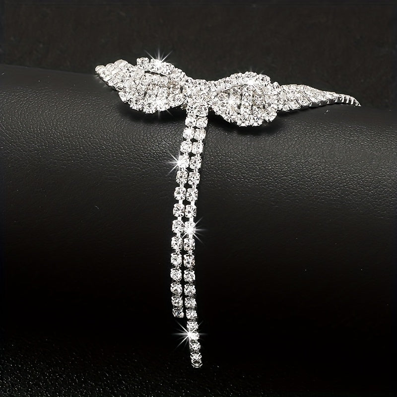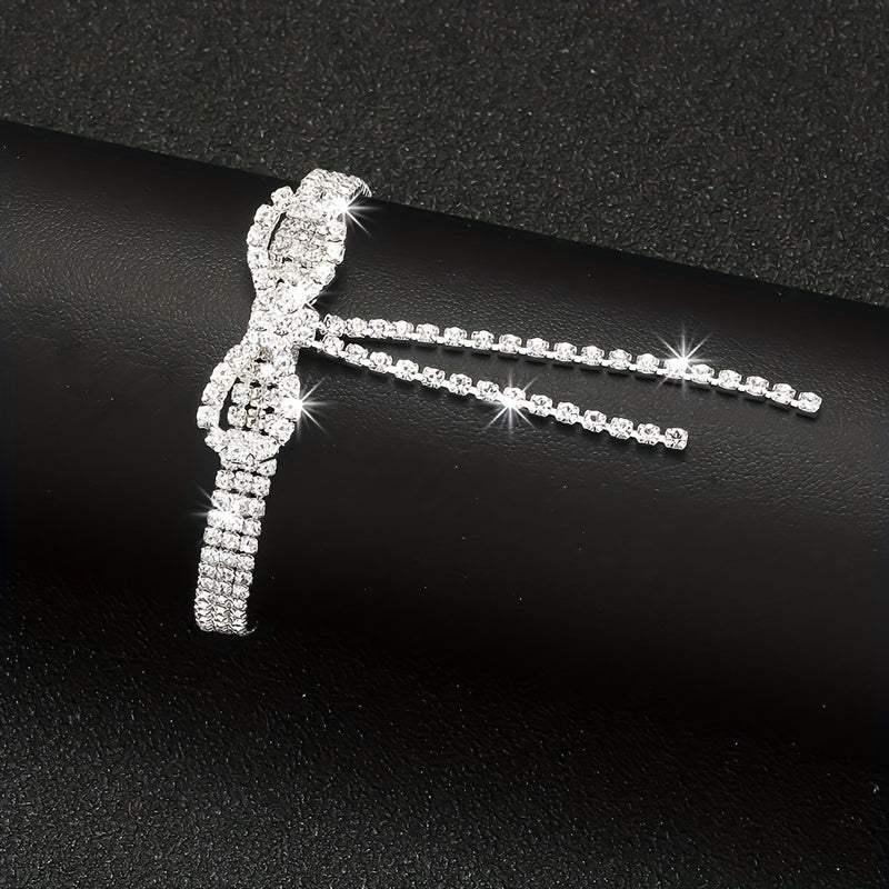 Add a touch of glamour to your beach wedding ensemble with this rhinestone anklet featuring a tassel chain and bow. Perfect for a beach wedding or special occasion.