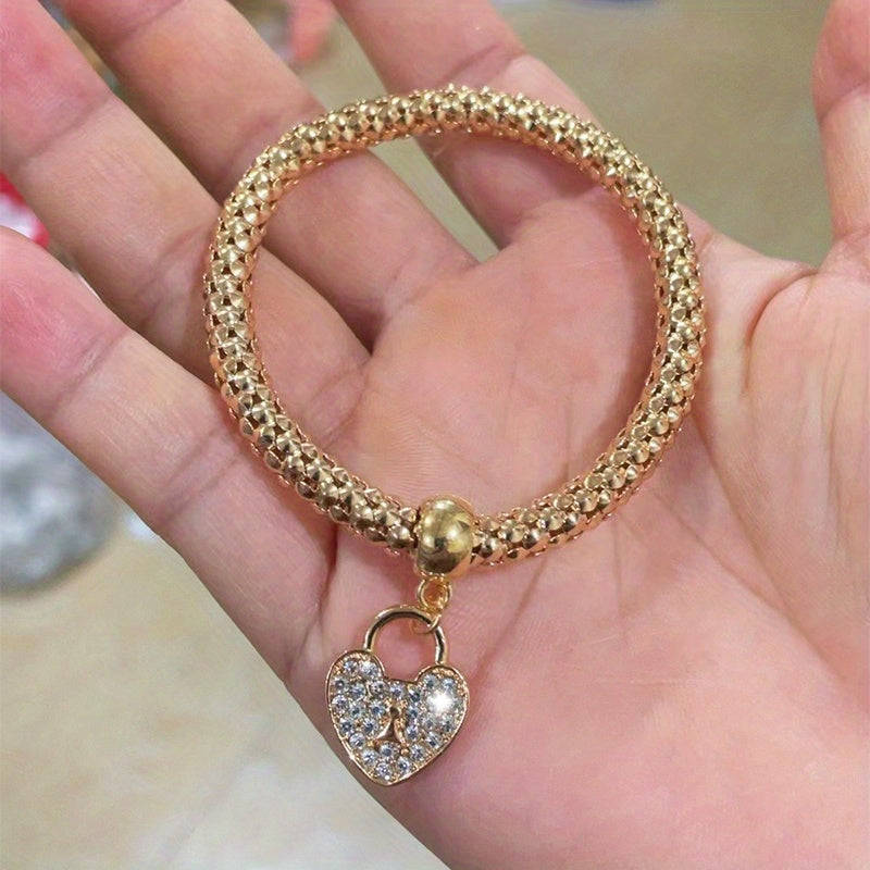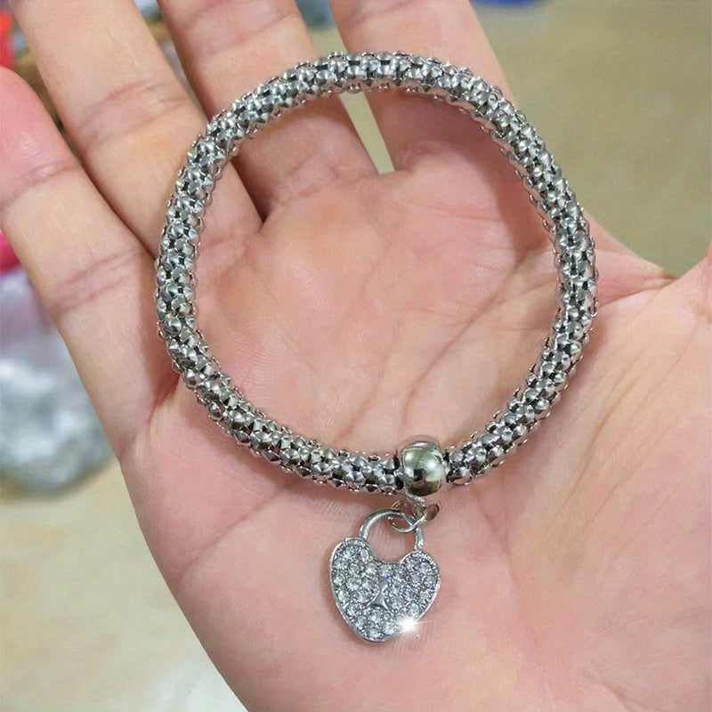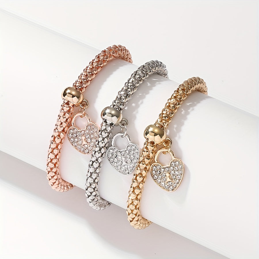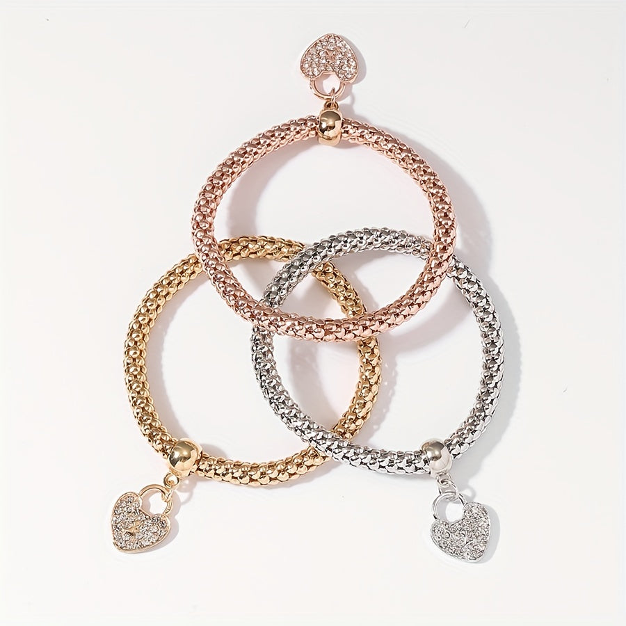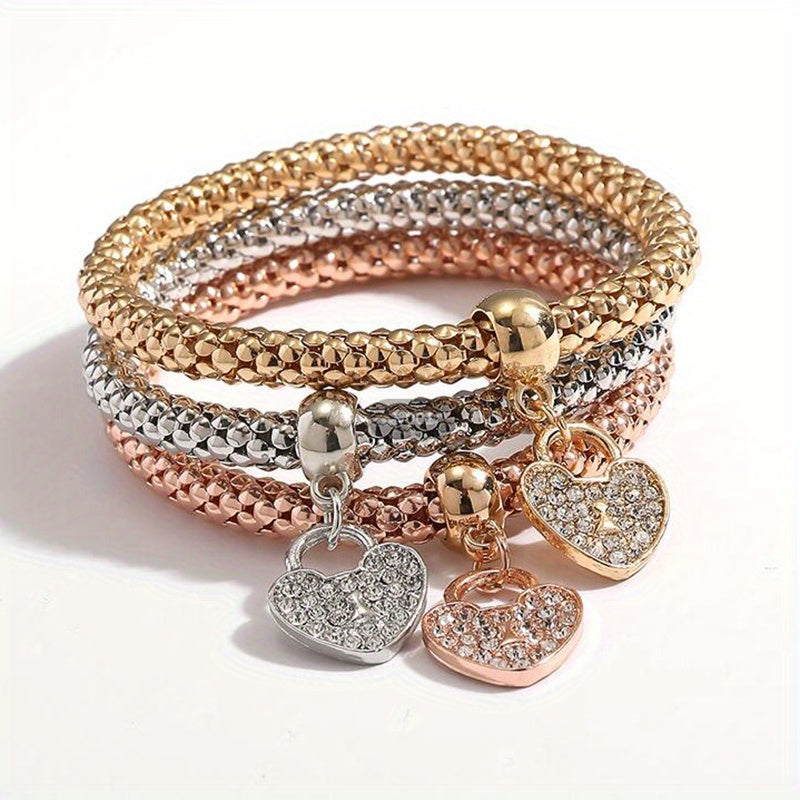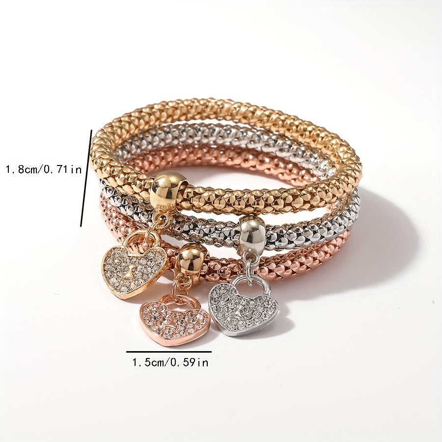 This beautiful bracelet features a rhinestone heart design in three complementing tricolors. It makes for a perfect gift for any occasion.