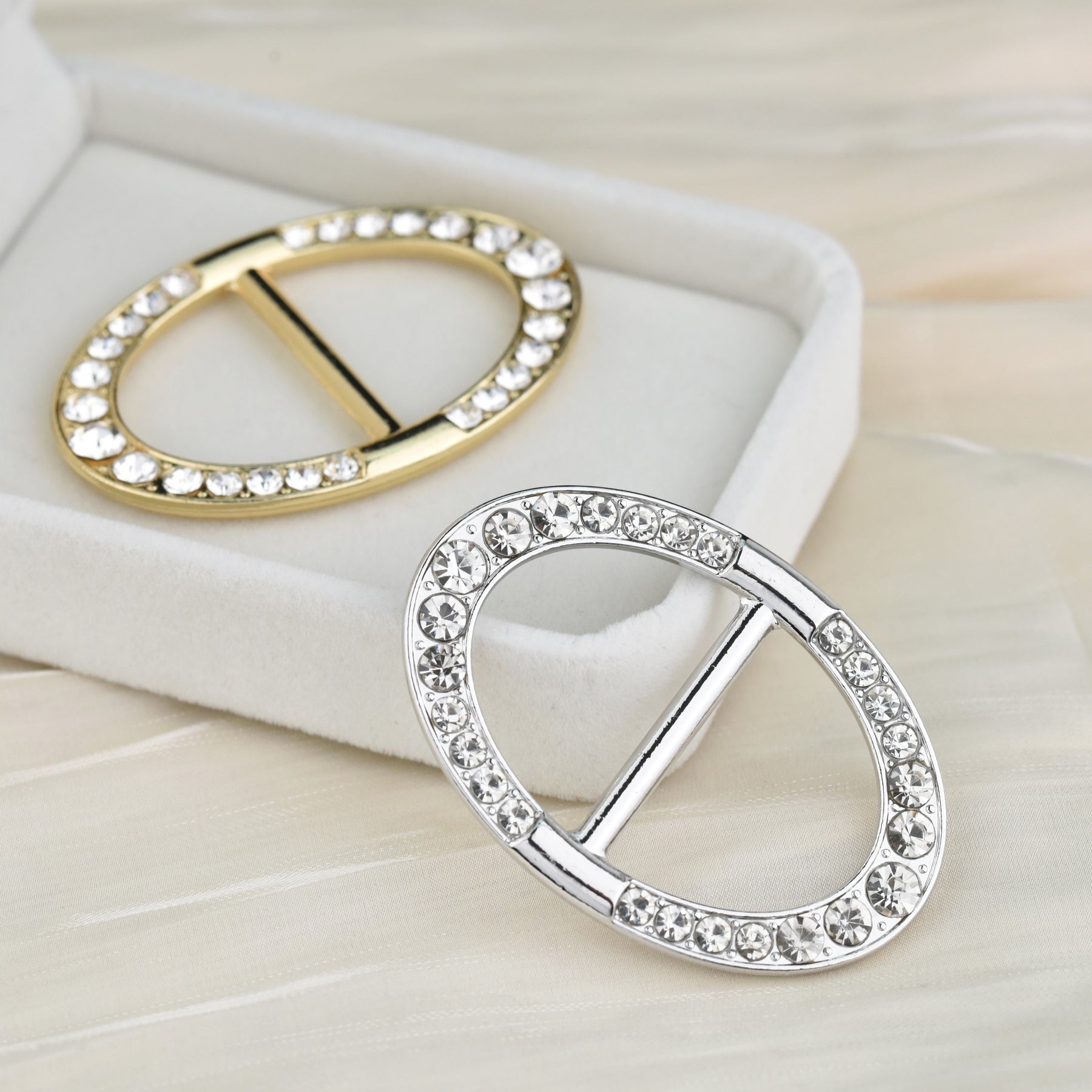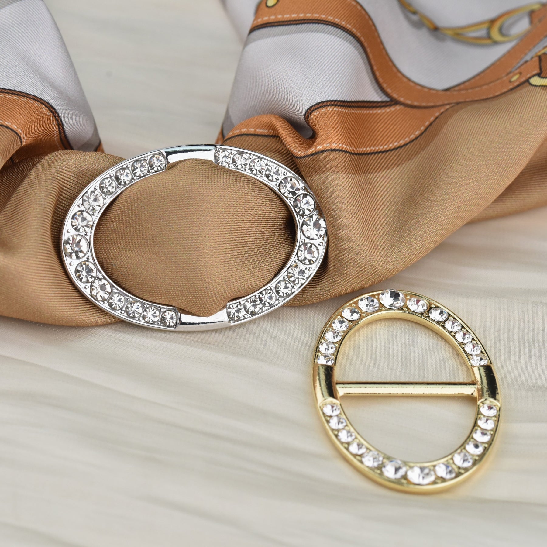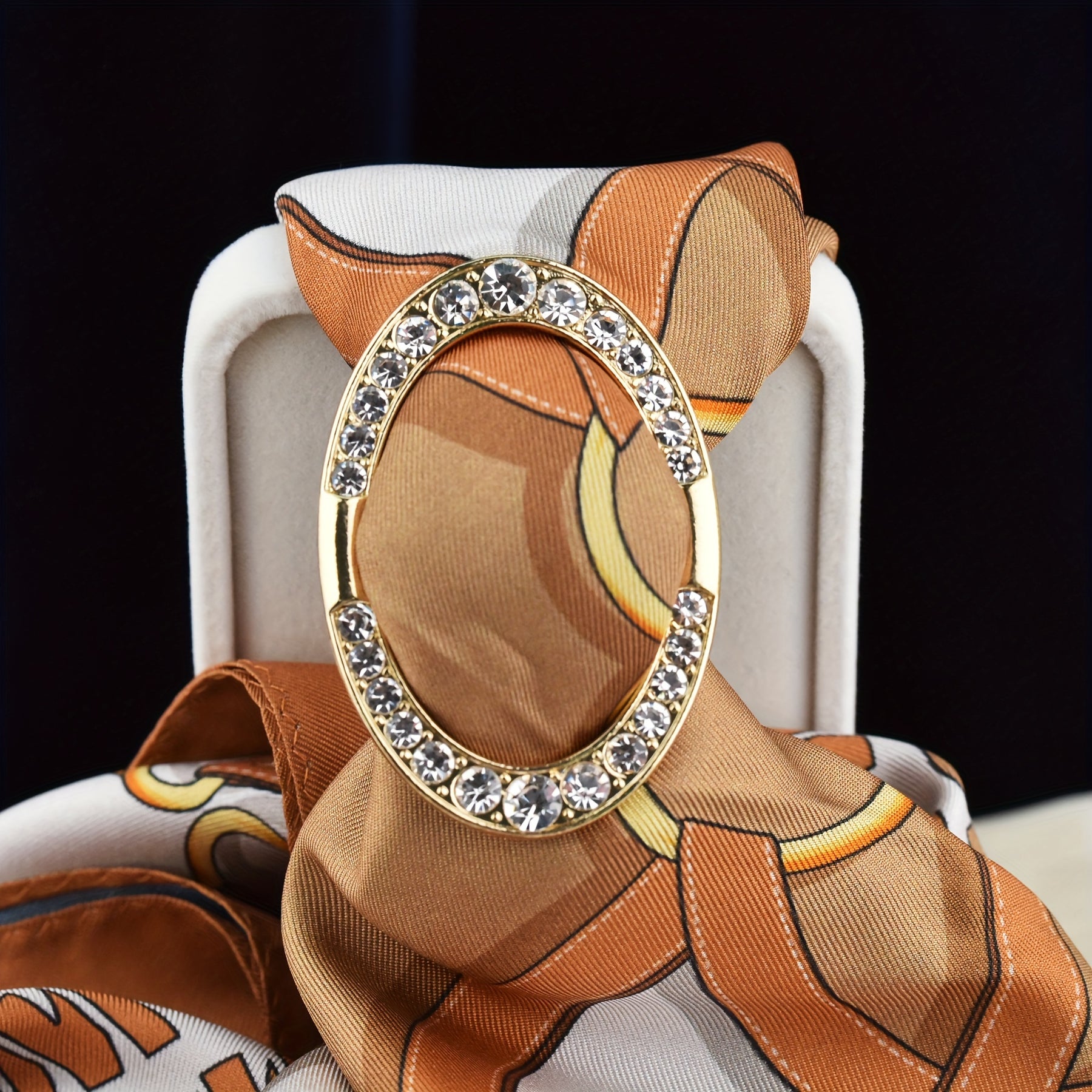 Elegant scarf buckle brooch with hollow out oval shape design and rhinestone inlay.