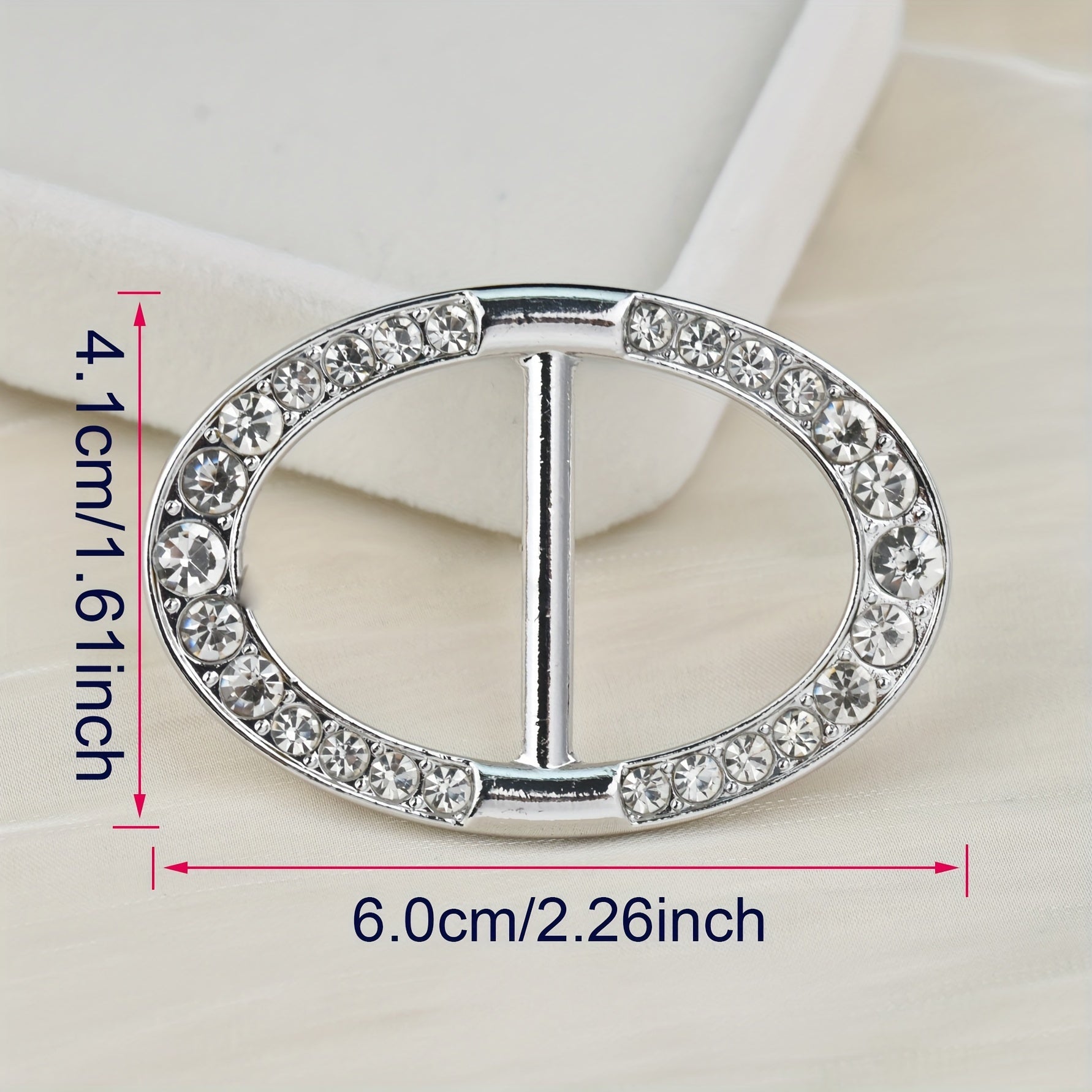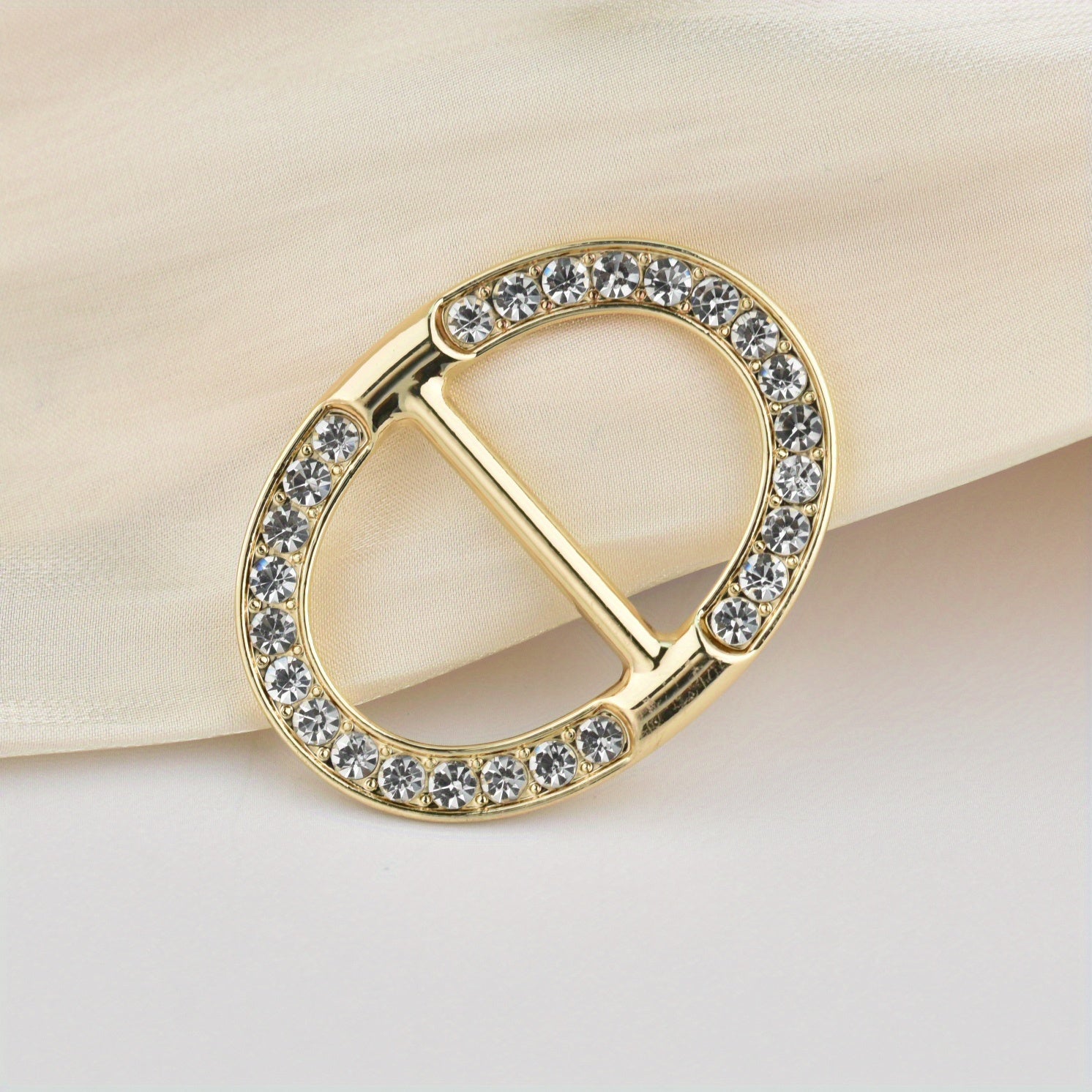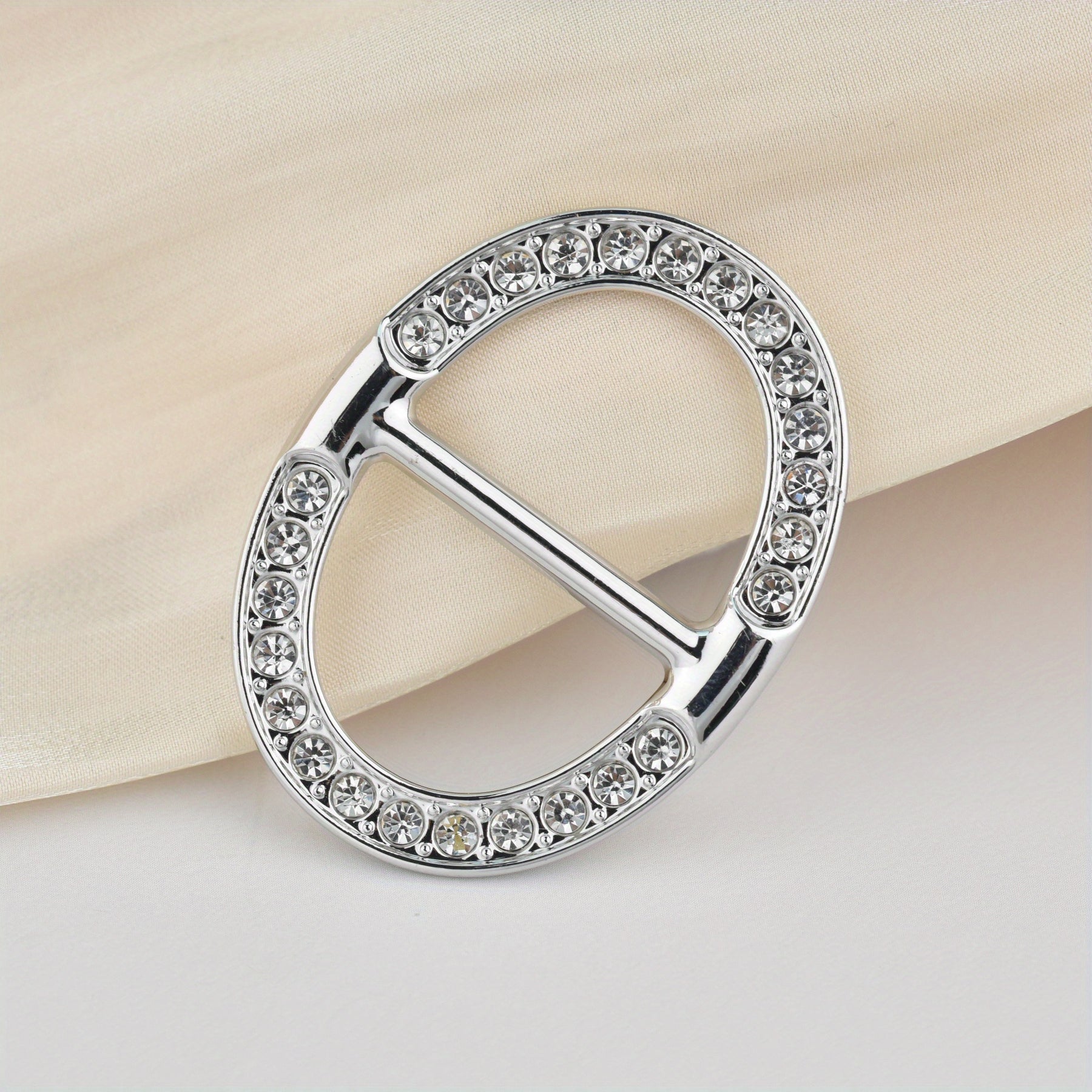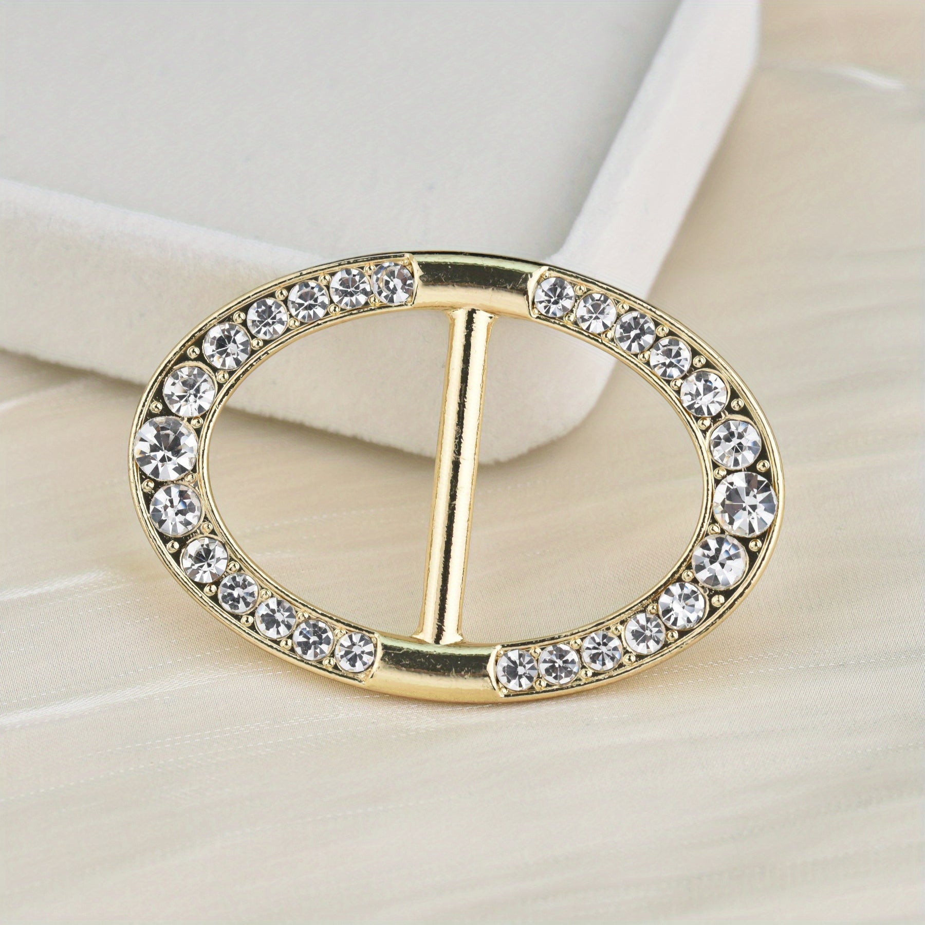 Elegant scarf buckle brooch with hollow out oval shape design and rhinestone inlay.