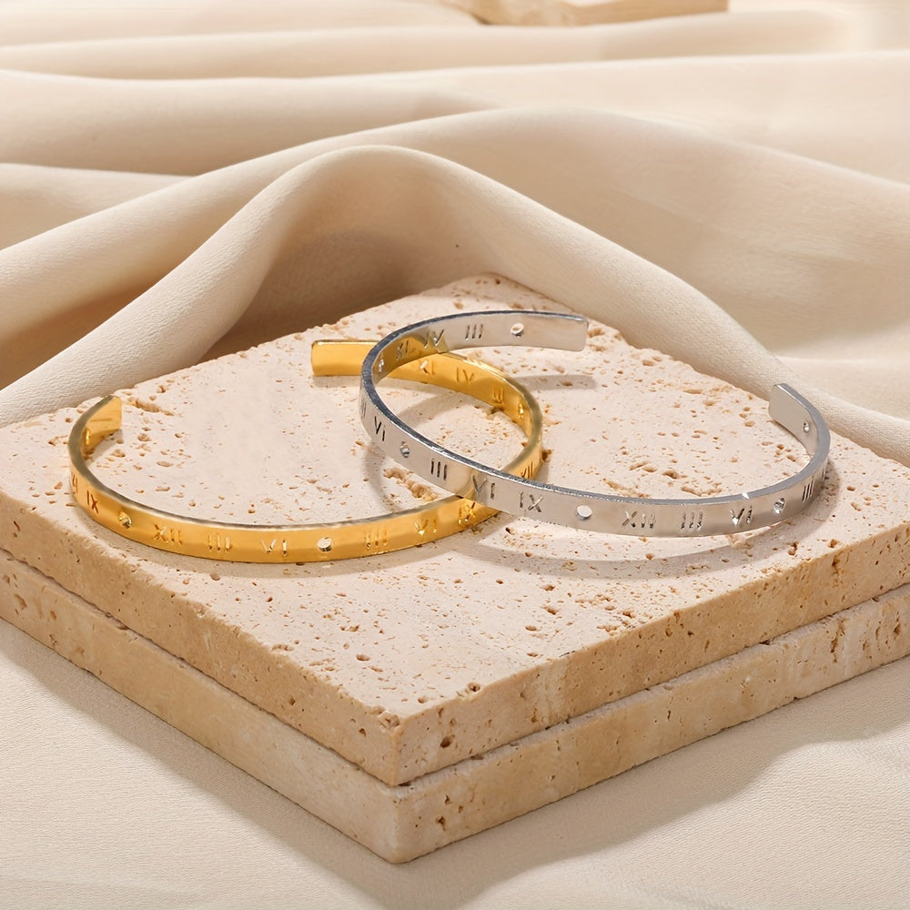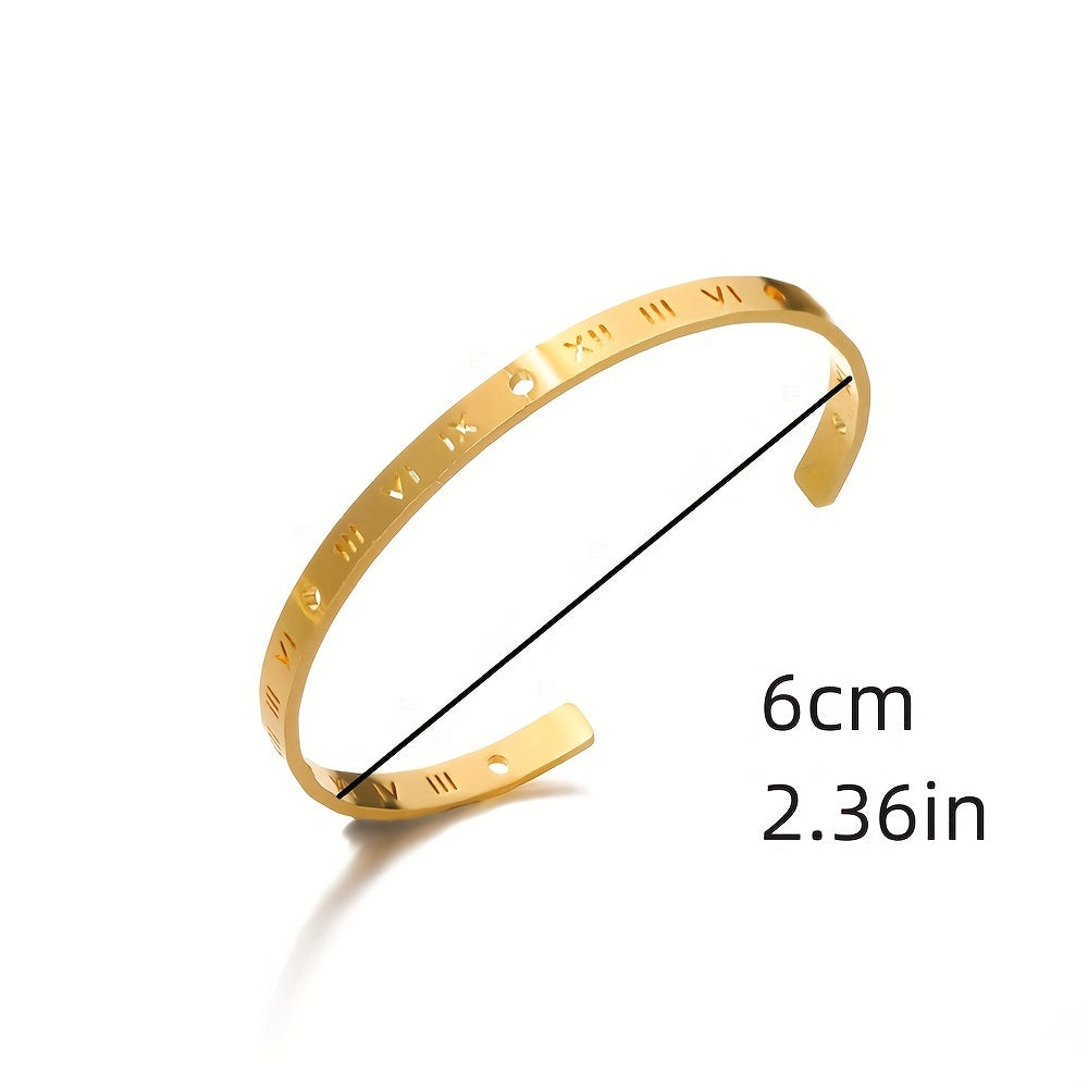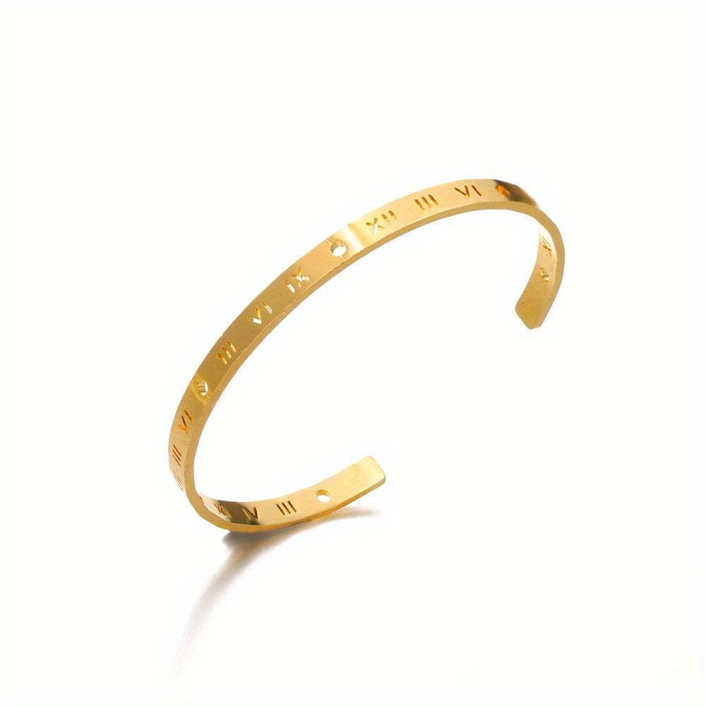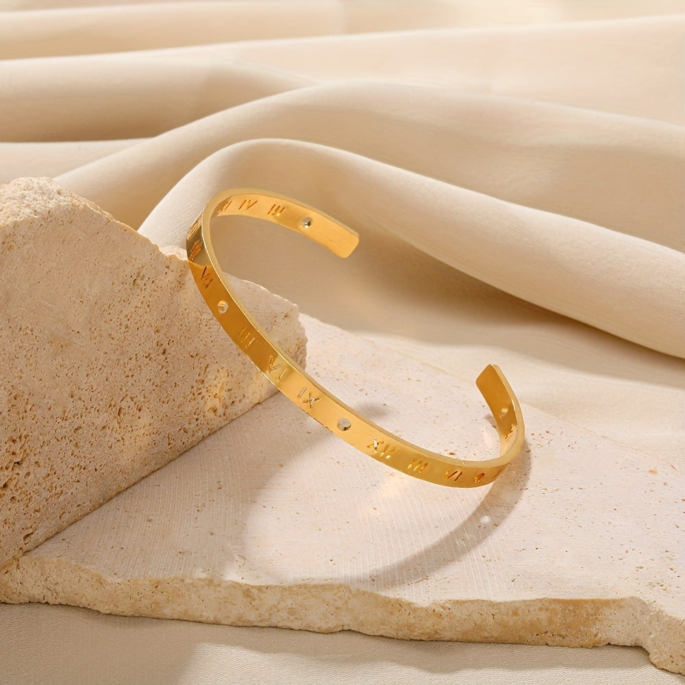 Elegant Roman numeral cuff bangle crafted in 14K plated metal, perfect for women who appreciate delicate hand jewelry.