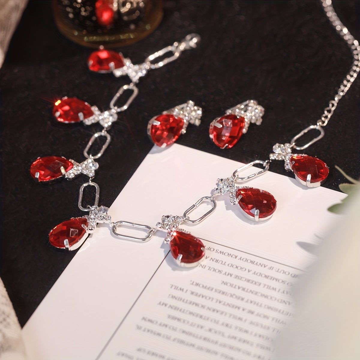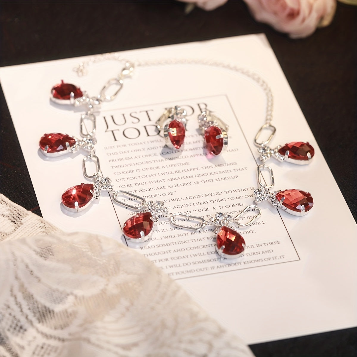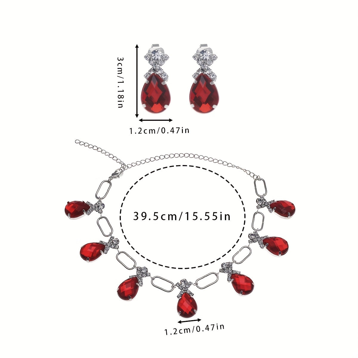 This elegant jewelry set includes 3pcs earrings and a necklace. Adorned with red zircon, it's ideal for evening parties and cocktail events. A wonderful gift for her!