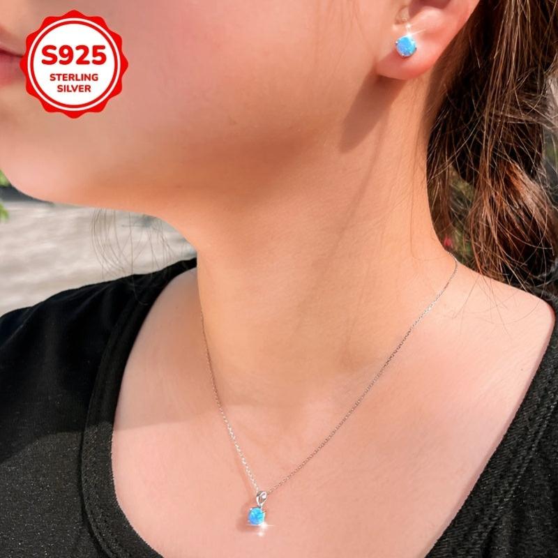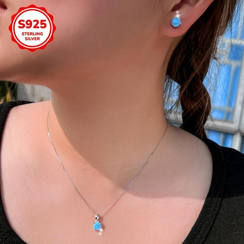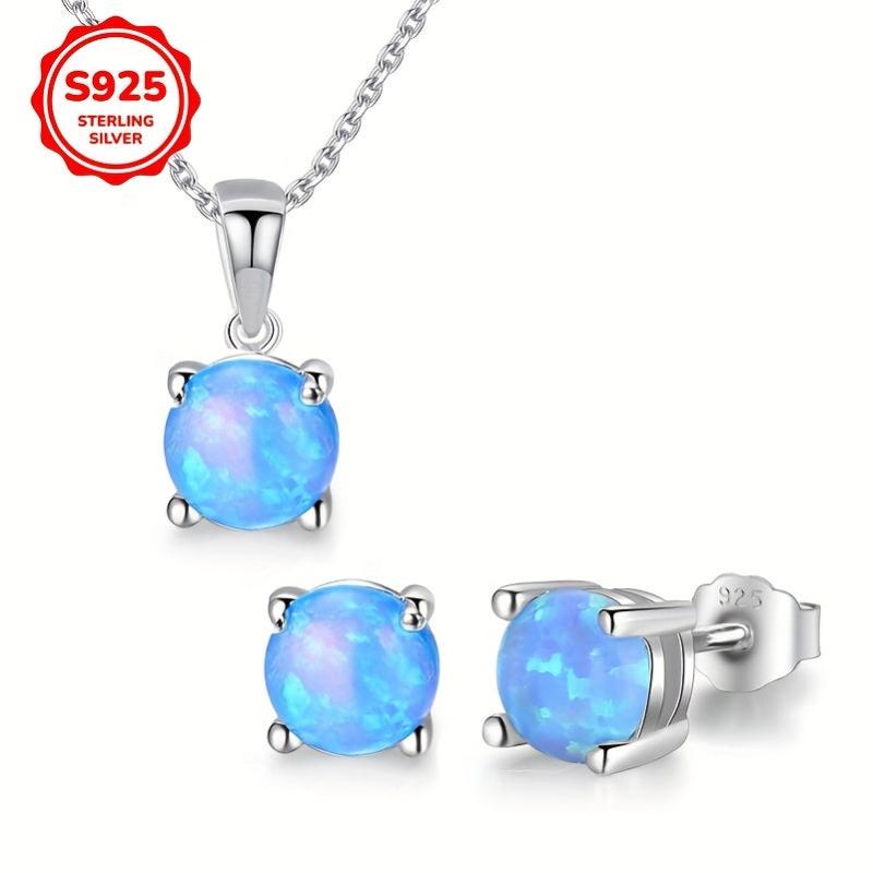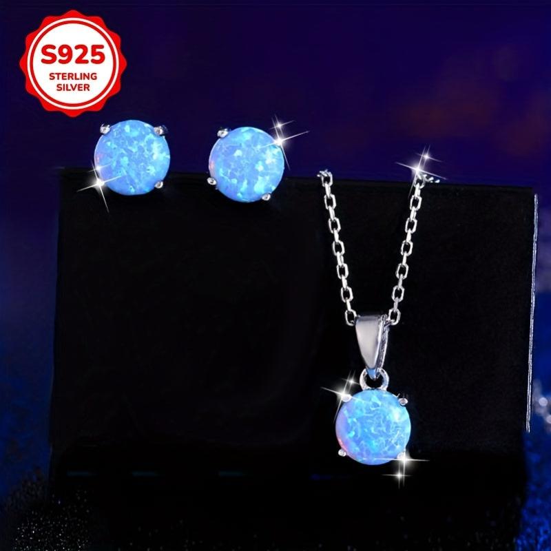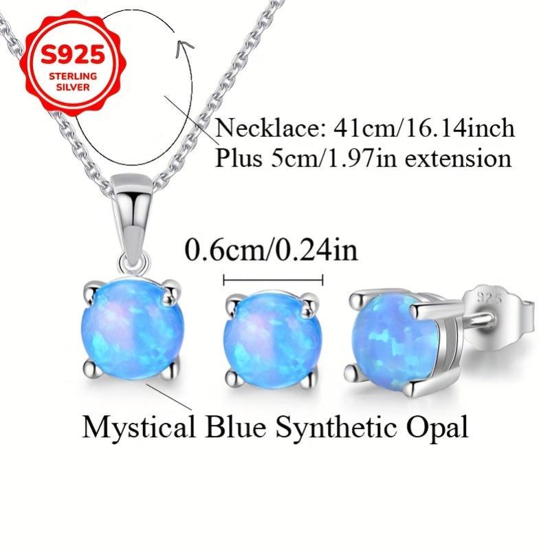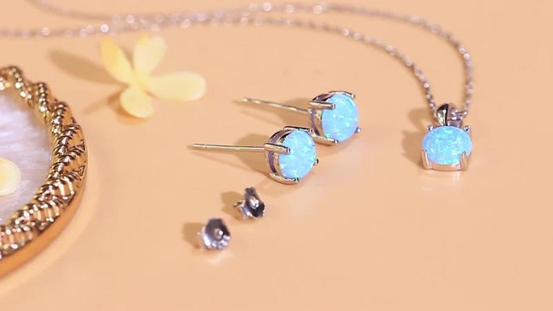 Elegant and luxurious 2-piece set featuring inlaid 6mm round mysterious synthetic opal pendant necklace and earrings. Perfect for weddings and special occasions.