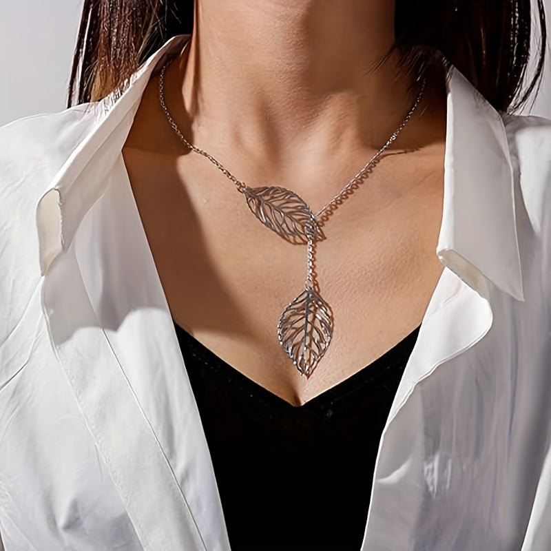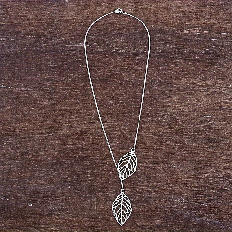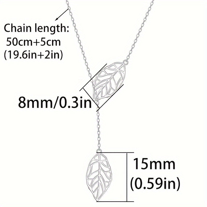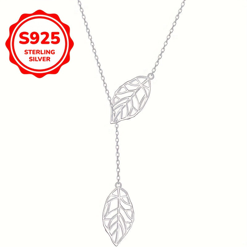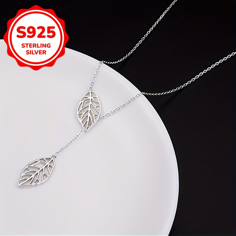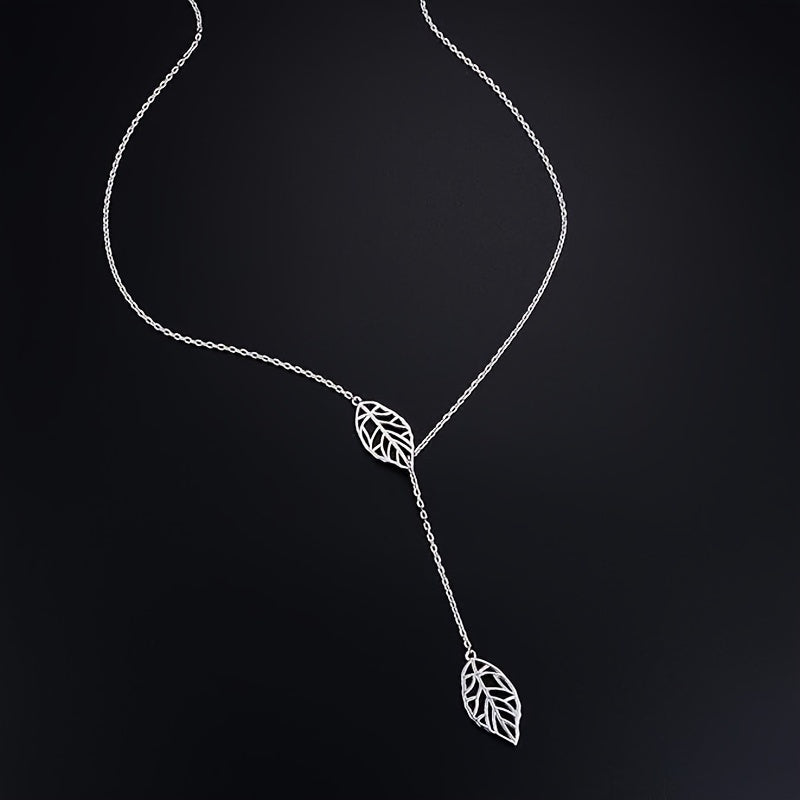 This y-shaped necklace features two delicate leaves in sterling silver, making it a stylish and hypoallergenic jewelry gift option. It weighs 4.2g and is suitable for daily wear.