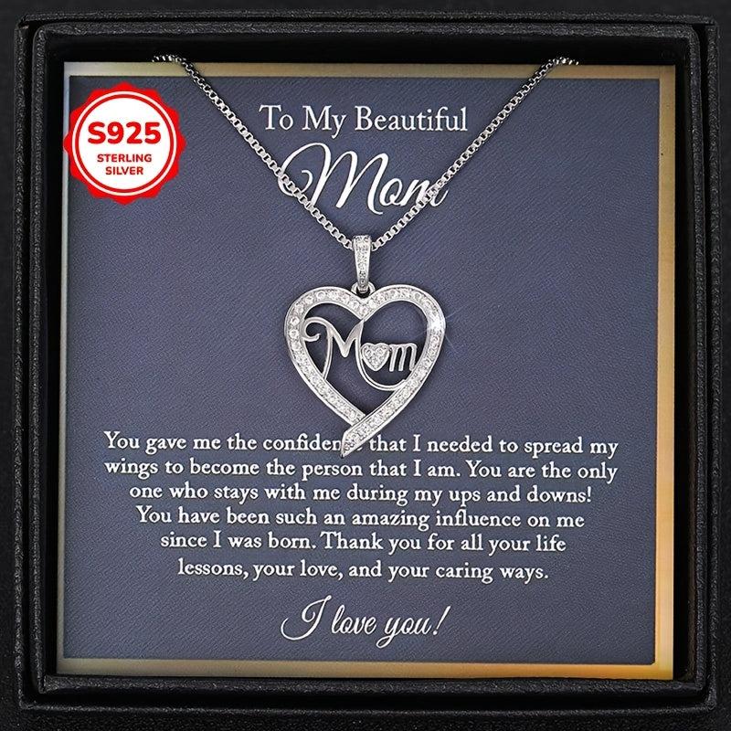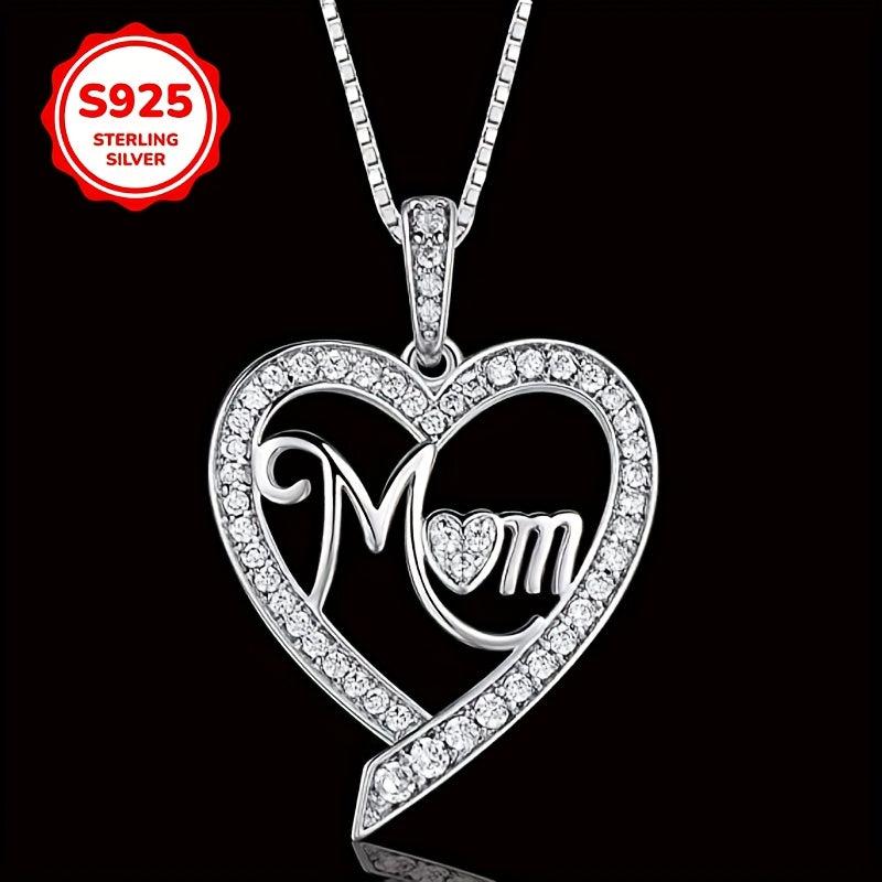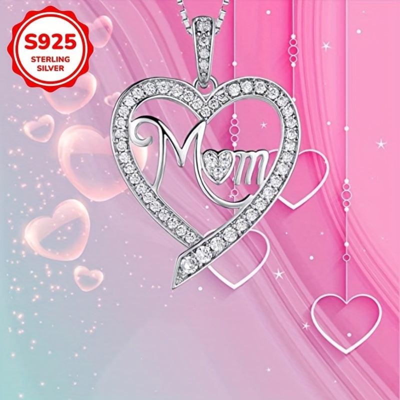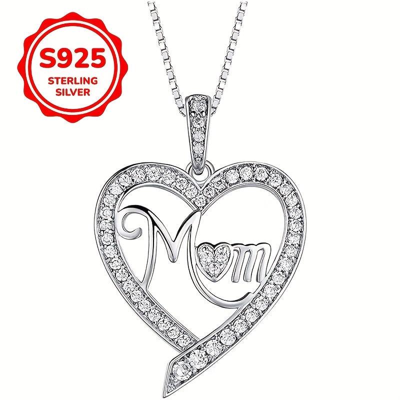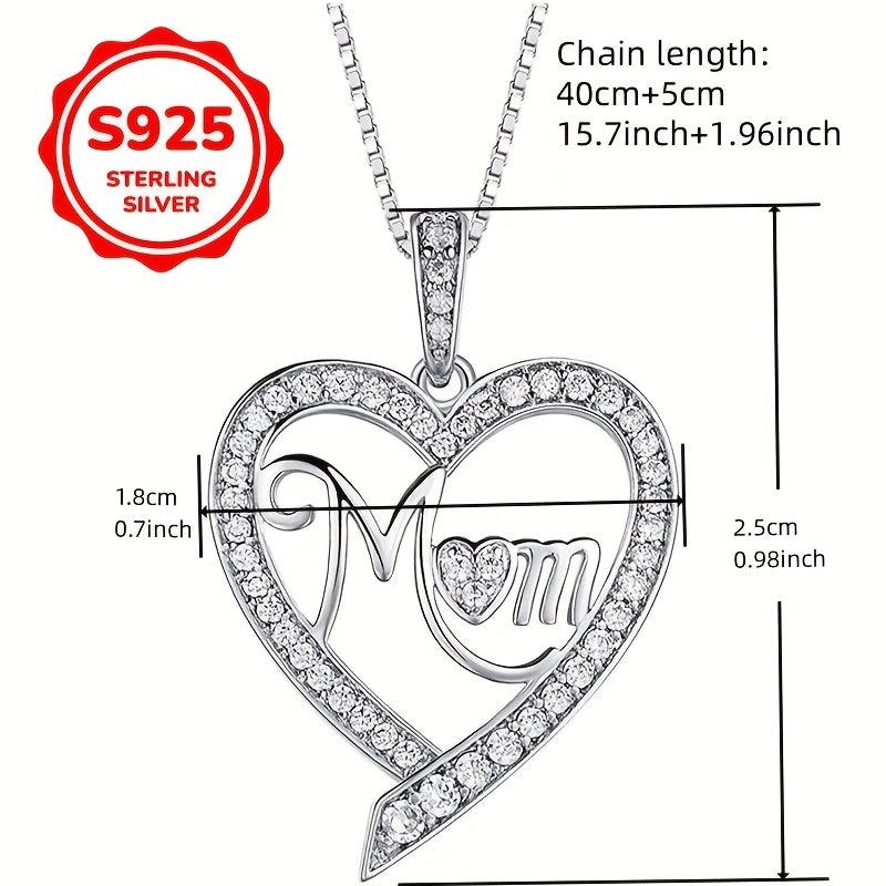S925 Sterling Silver Heart Pendant Necklace with Cubic Zirconia Mom Inscription