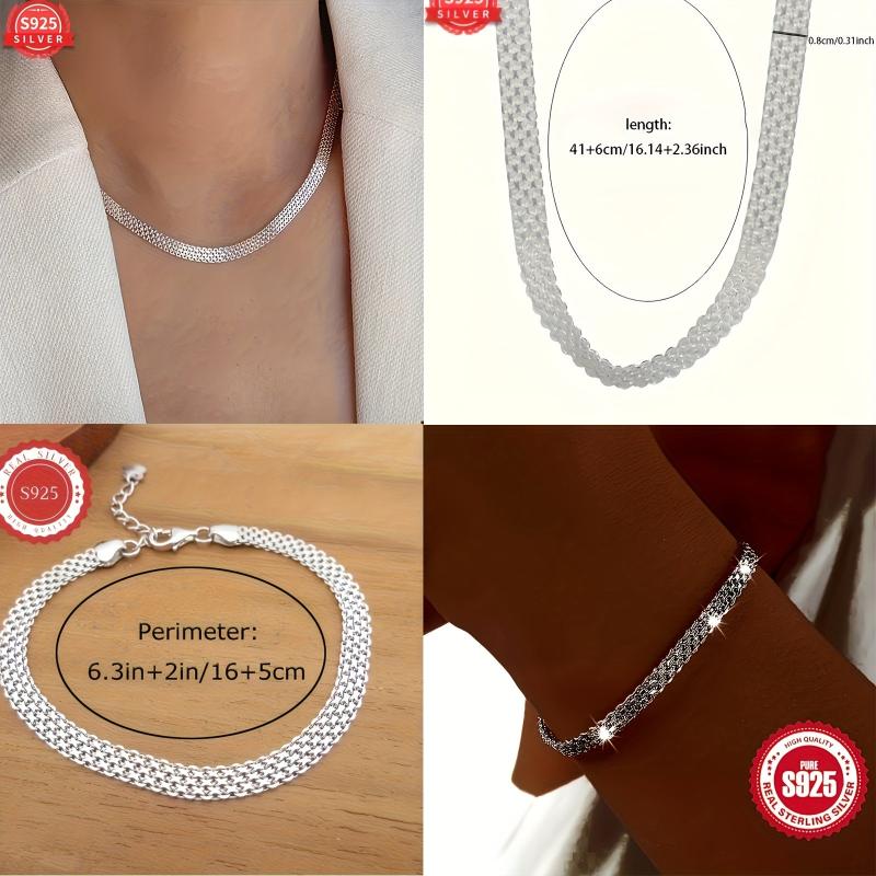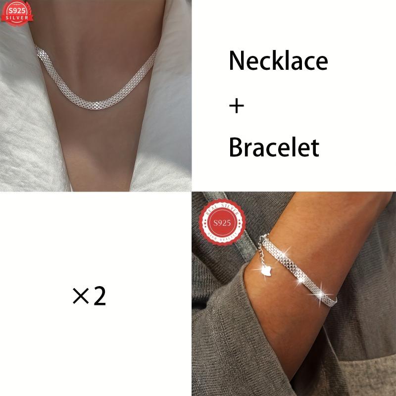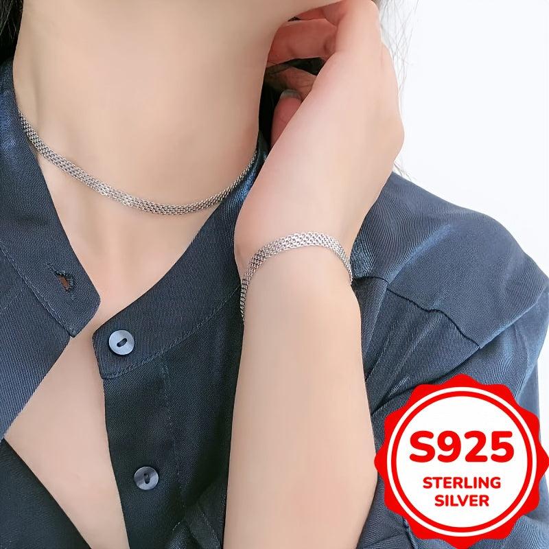S925 Sterling Silver Necklace & Bracelet Set Sparkling Mesh Engraved Chain
