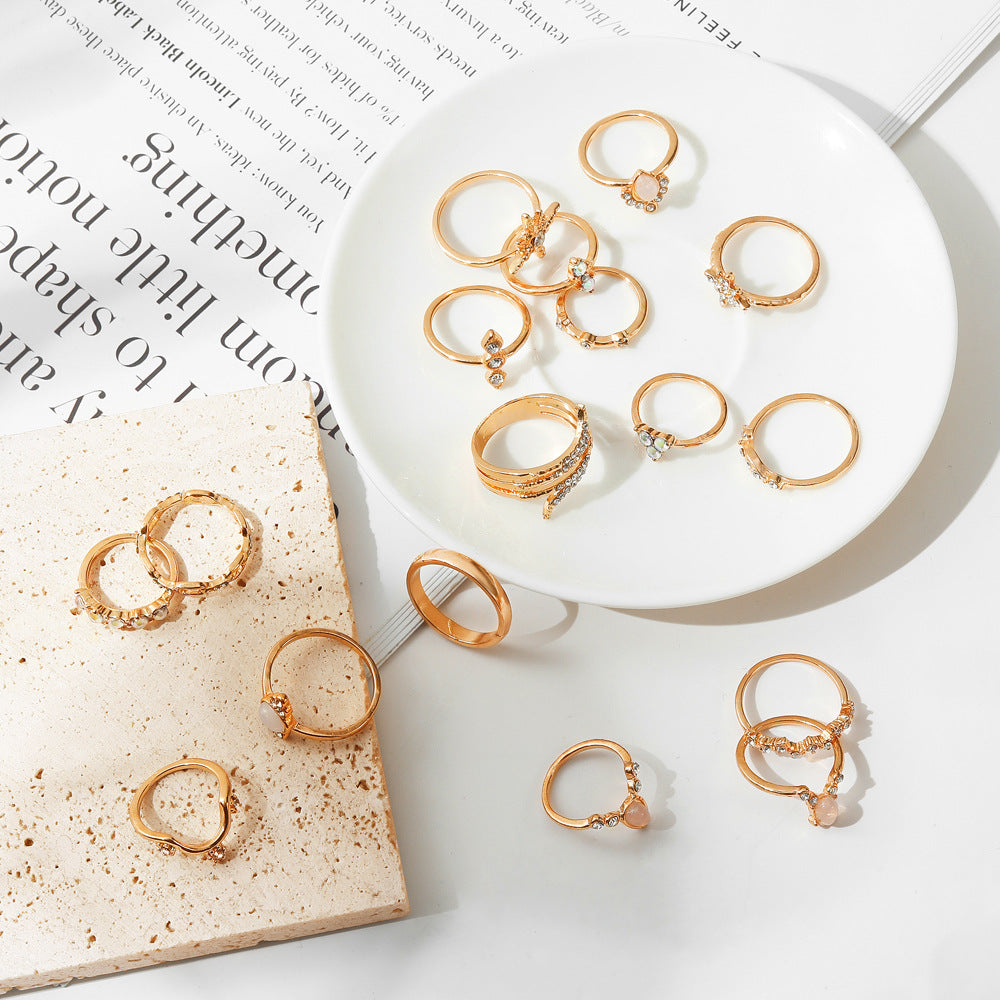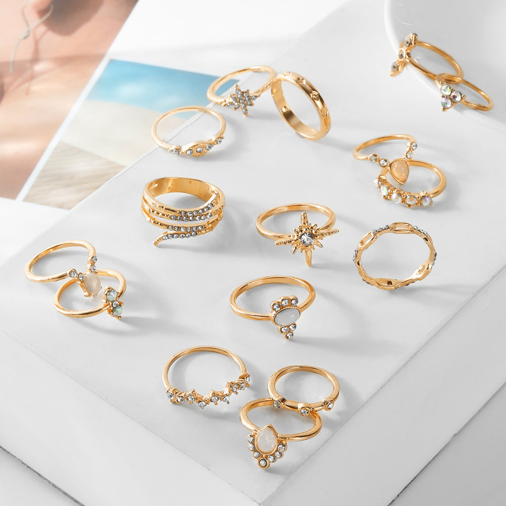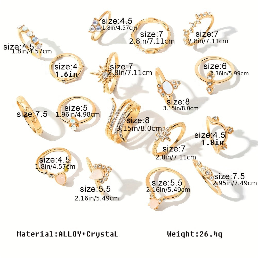 Add a touch of bohemian charm to your look with this set of 17 stacking rings. Each ring features a unique design, from snowflakes to snakes, all inlaid with shimmering rhinestones.